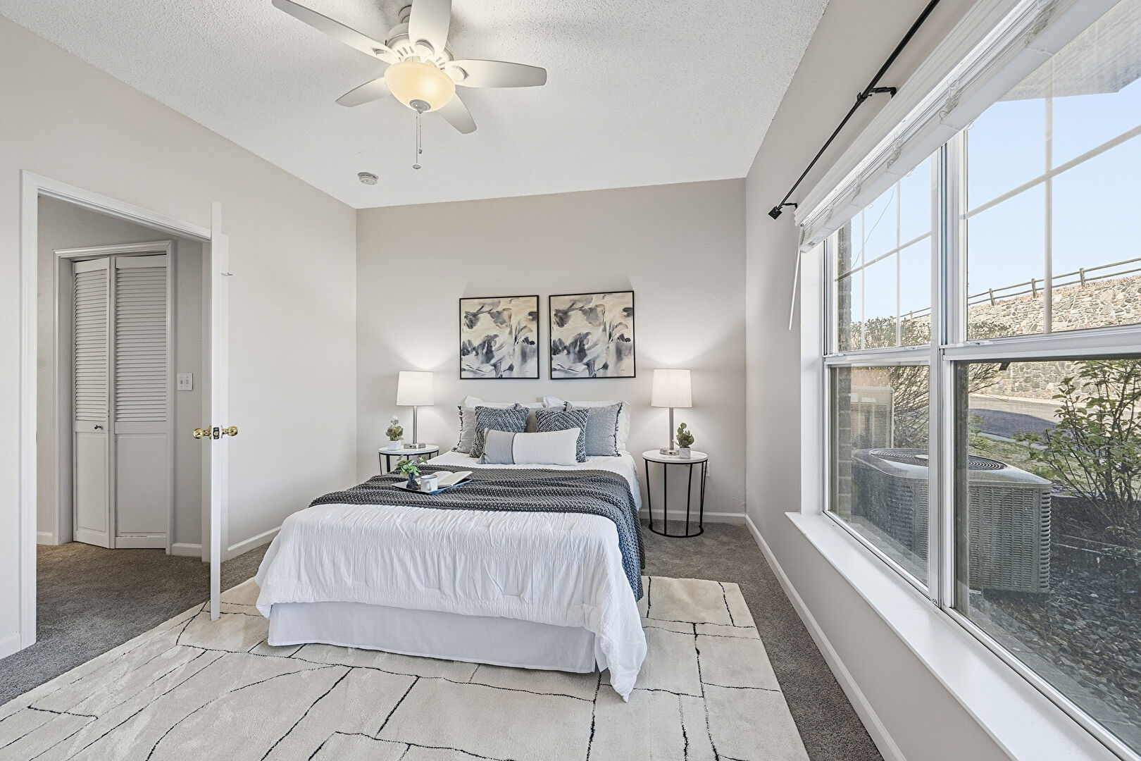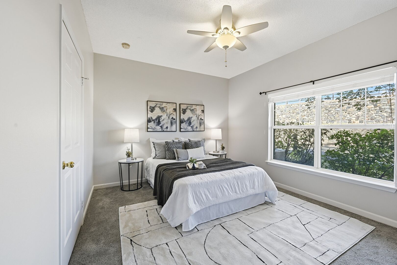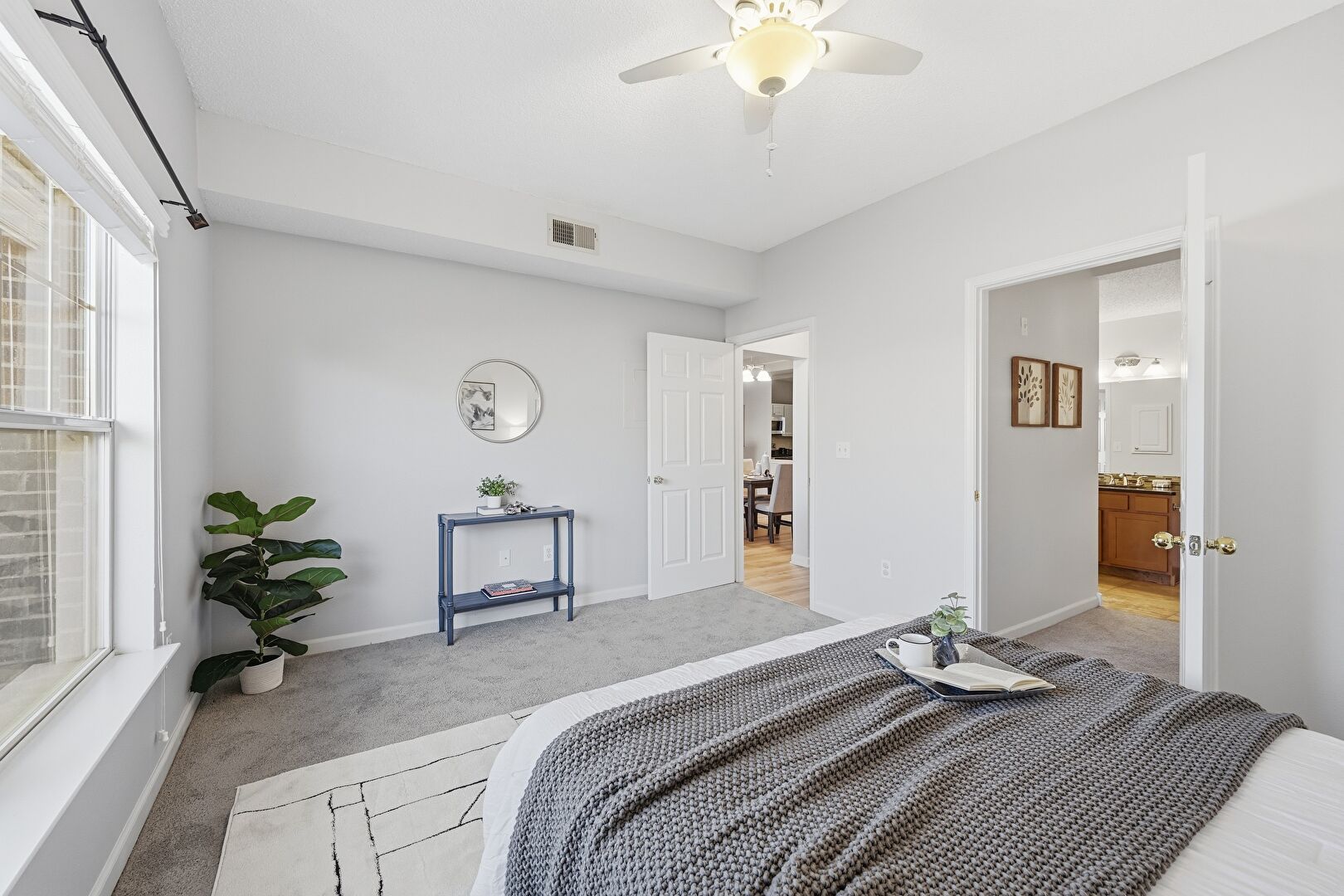 Baseboards Wall, Carpet, Ceiling Fan, Drywall, Ensuite Bathroom, Natural Light, Textured Ceiling, Vent, Baseboards Wall, Carpet