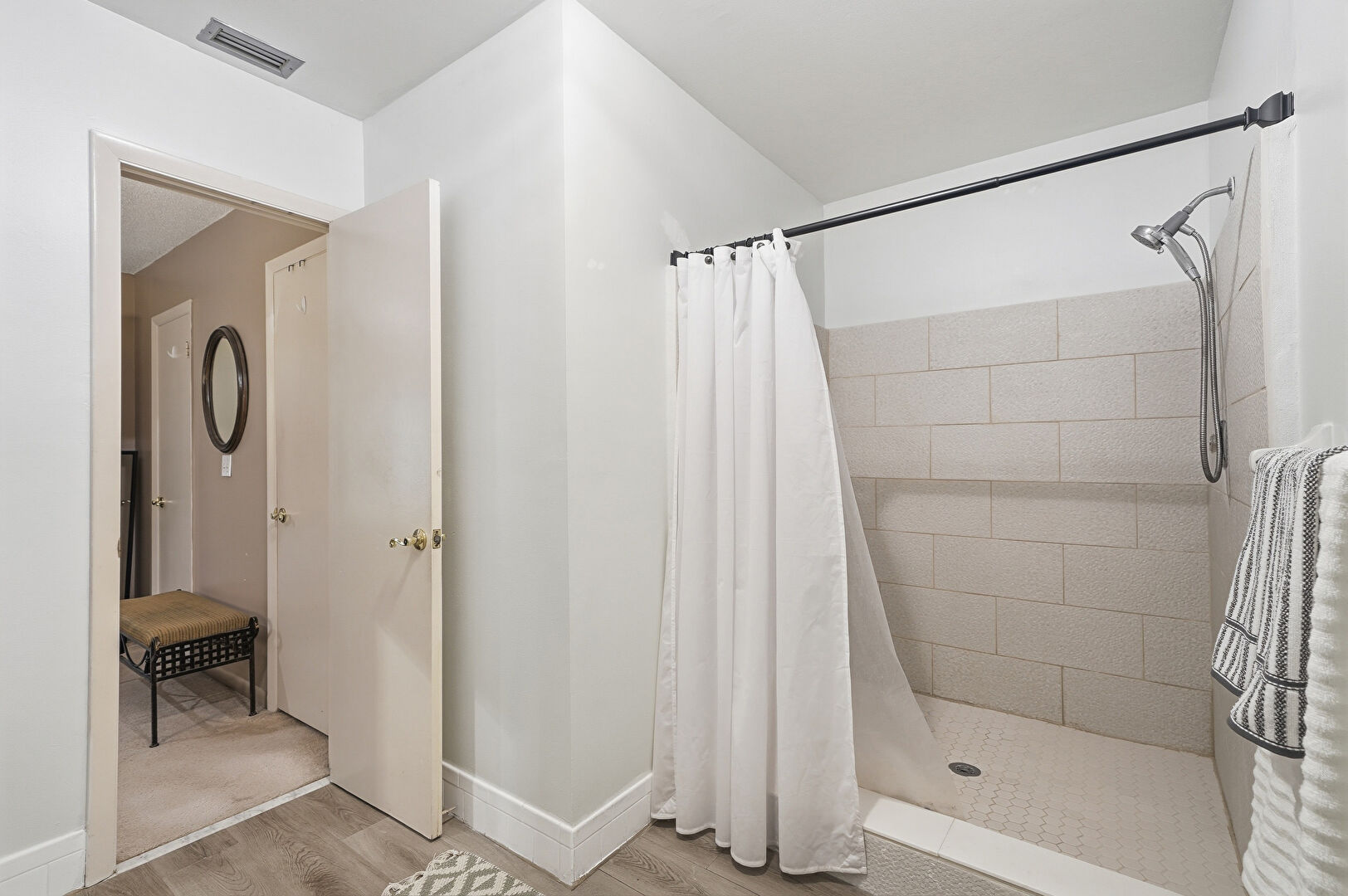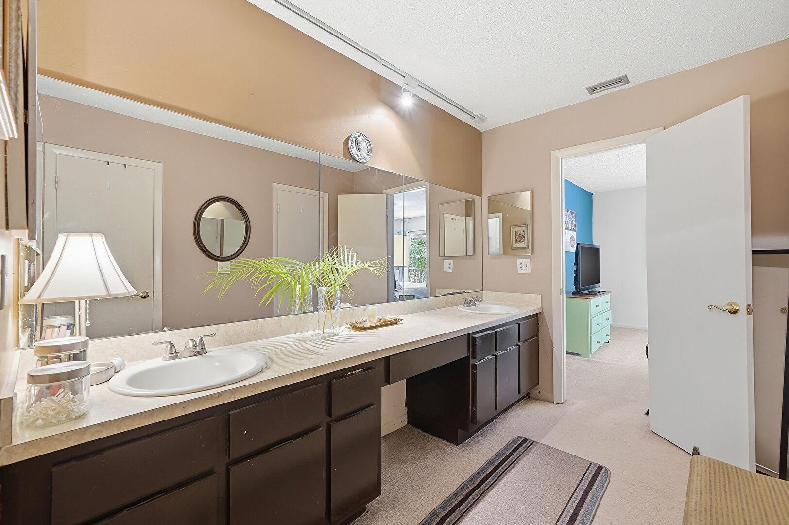 Baseboards Wall, Carpet, Double Vanity, Drywall, Full Bathroom, Natural Light, Tile Floor, Vanity, Wood Finish Floor, Full Bathroom, Textured Ceiling, Vanity, Vent