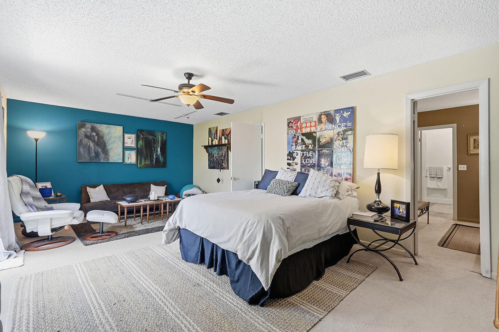 Access To Exterior, Baseboards Wall, Carpet, Ceiling Fan, Drywall, Ensuite Bathroom, Natural Light, Textured Ceiling, Track Lighting, Vent, Baseboards Wall, Carpet, Ceiling Fan, Drywall
