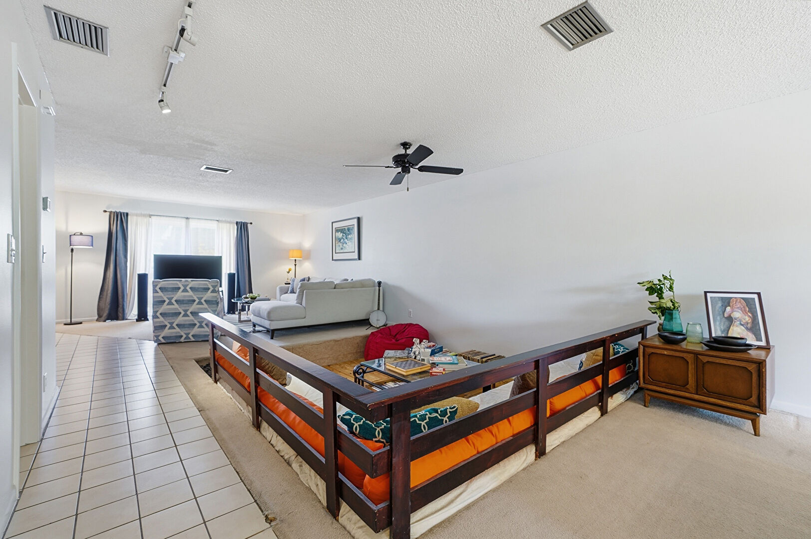 Baseboards Wall, Carpet, Ceiling Fan, Drywall, Natural Light, Stairs, Textured Ceiling, Tile Floor, Track Lighting, Vent, Wood Finish Floor, Ceiling Fan, Drywall, Natural Light, Textured Ceiling, Vent