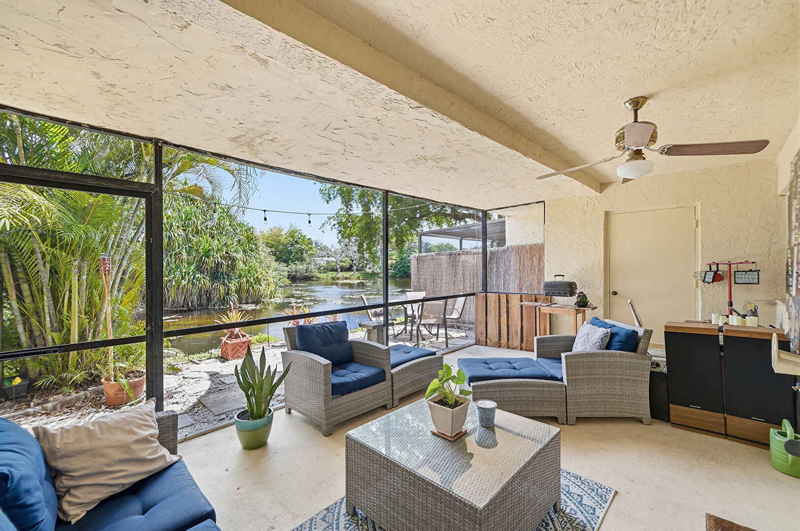 Beamed Ceiling, Ceiling Fan, Natural Light, Outdoor Living Space, Patio, Sunroom, Water View, Waterfront, Grill, Natural Light