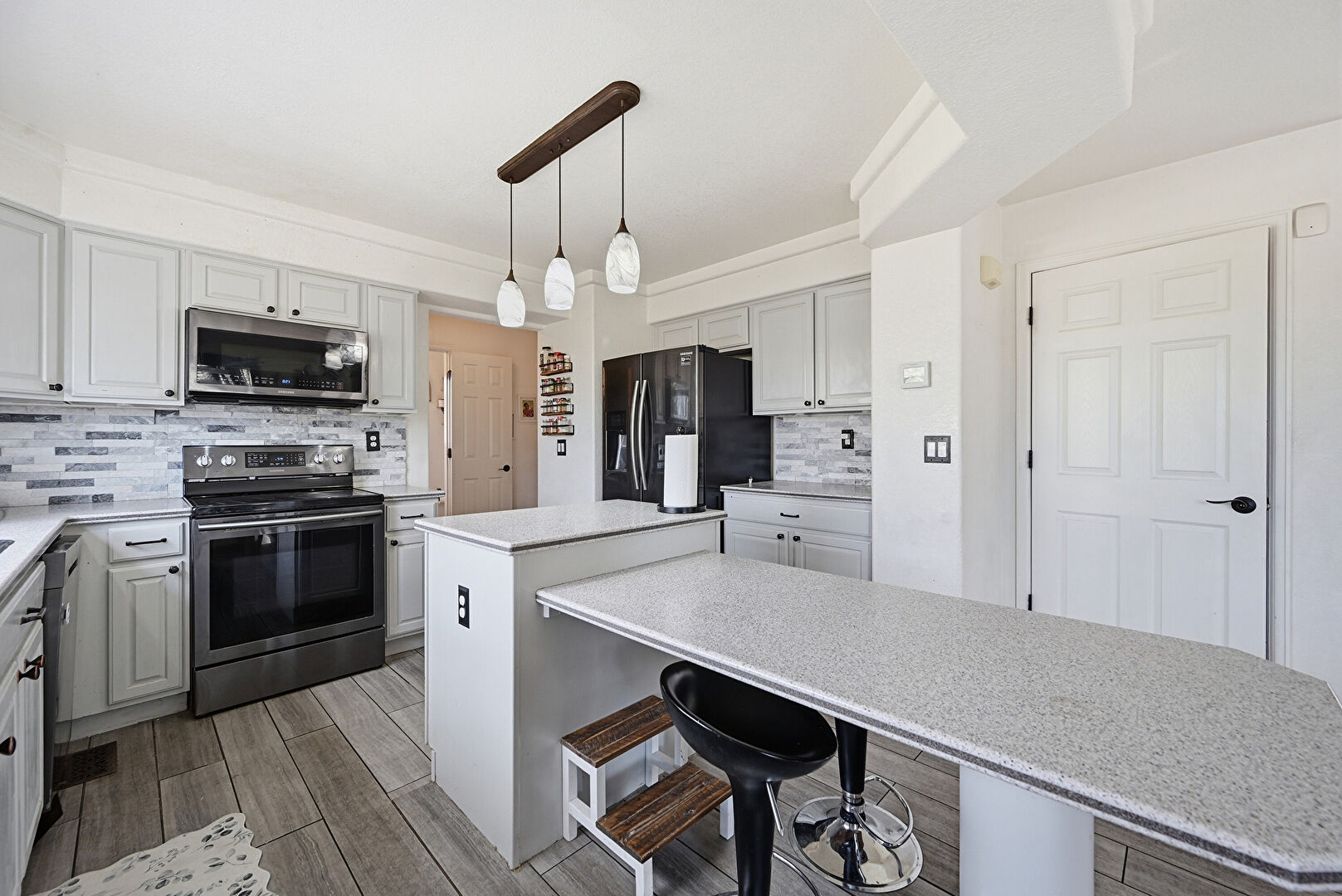 Baseboards Wall, Crown Molding, Drywall, Kitchen Bar, Kitchen Island, Natural Light, Pendant Lighting, Raised Cabinets, Stone Countertops, U Shaped Kitchen, Wood Finish Floor, Crown Molding, Kitchen Island