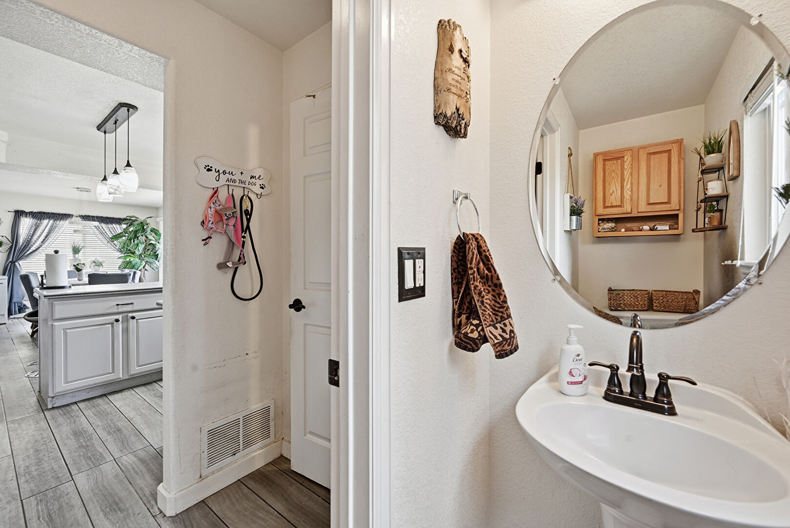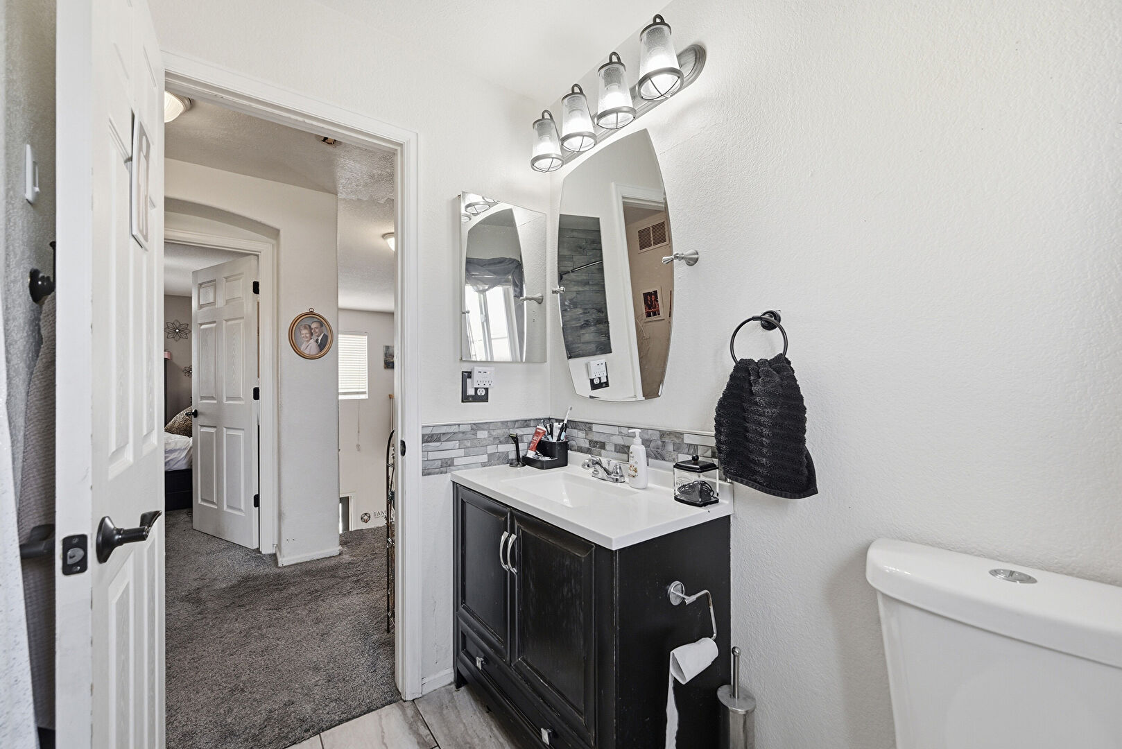 Baseboards Wall, Carpet, Drywall, Full Bathroom, Half Bathroom, Natural Light, Vanity, Vent, Wood Finish Floor, Drywall, Textured Wall, Vanity