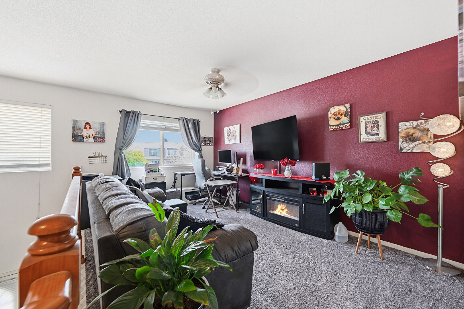 Baseboards Wall, Carpet, Ceiling Fan, Drywall, Fireplace, Natural Light, Carpet, Drywall
