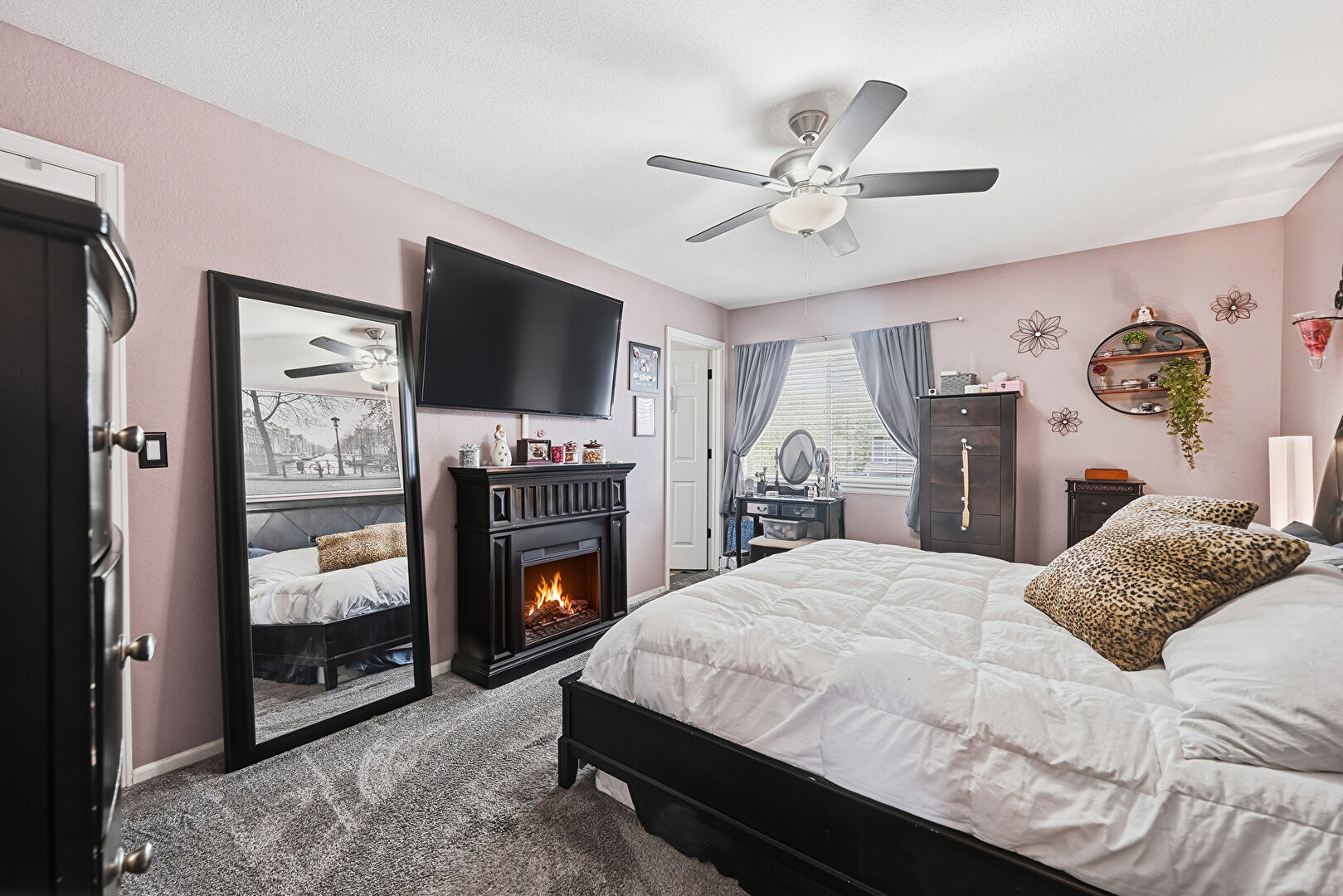 Baseboards Wall, Carpet, Ceiling Fan, Drywall, Fireplace, Natural Light, Ceiling Fan, Vent