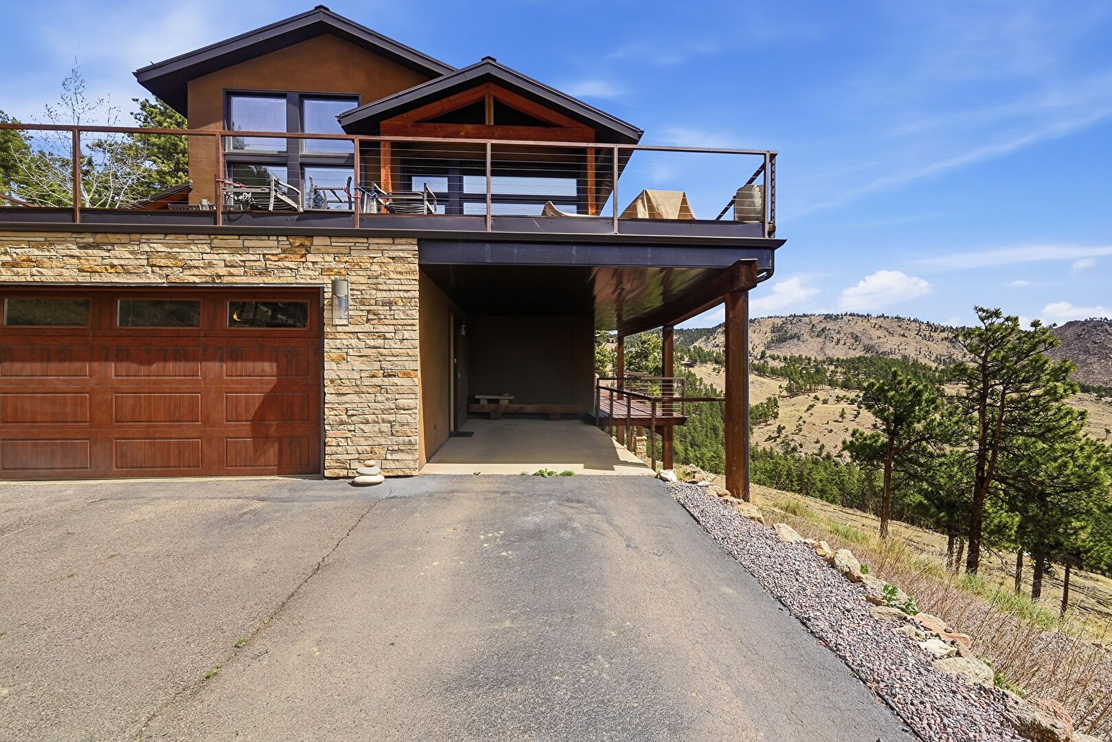 Balcony, Built In Garage, Driveway, Glass Siding, Mountain View, Patio, Stone Siding, Driveway, Garage