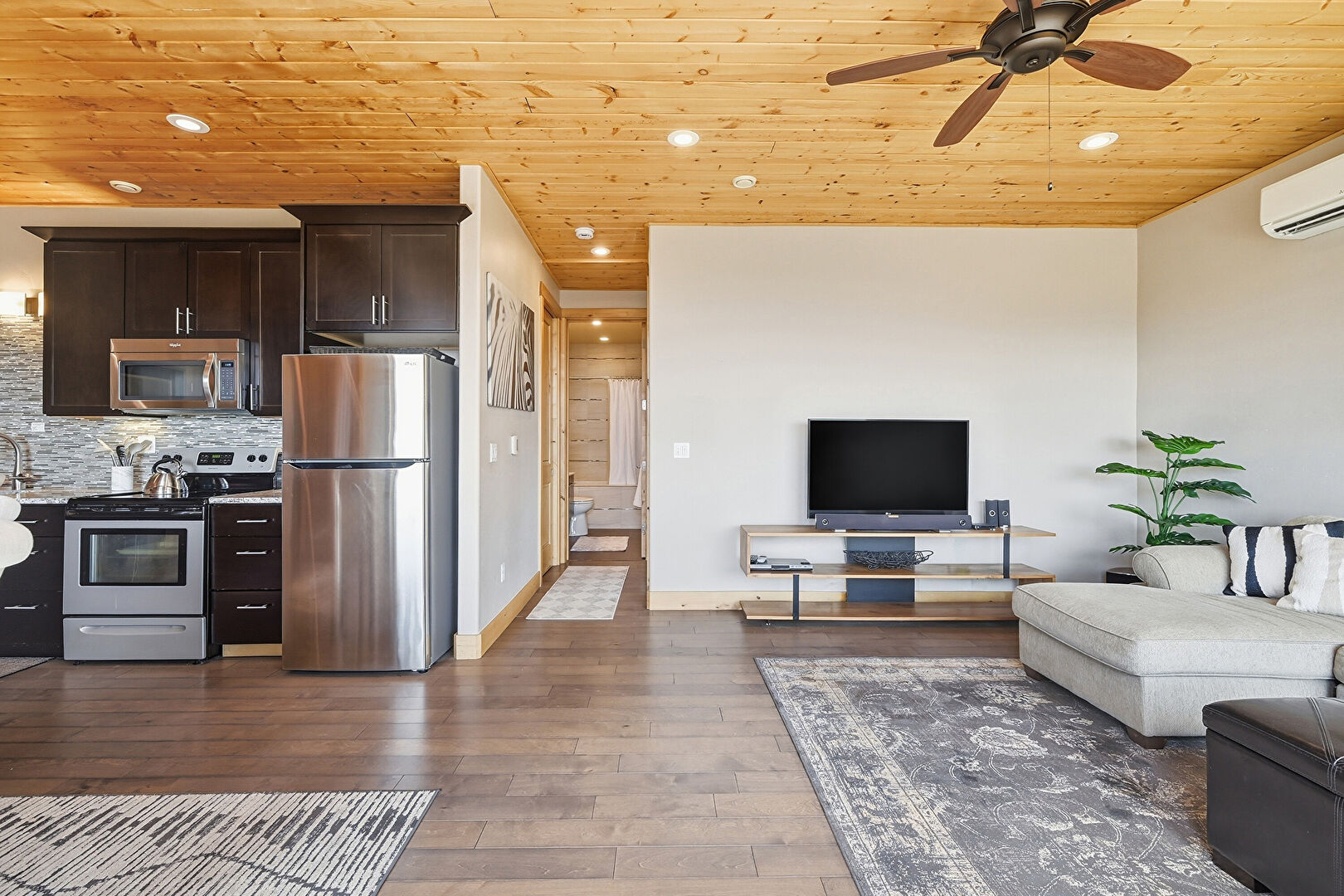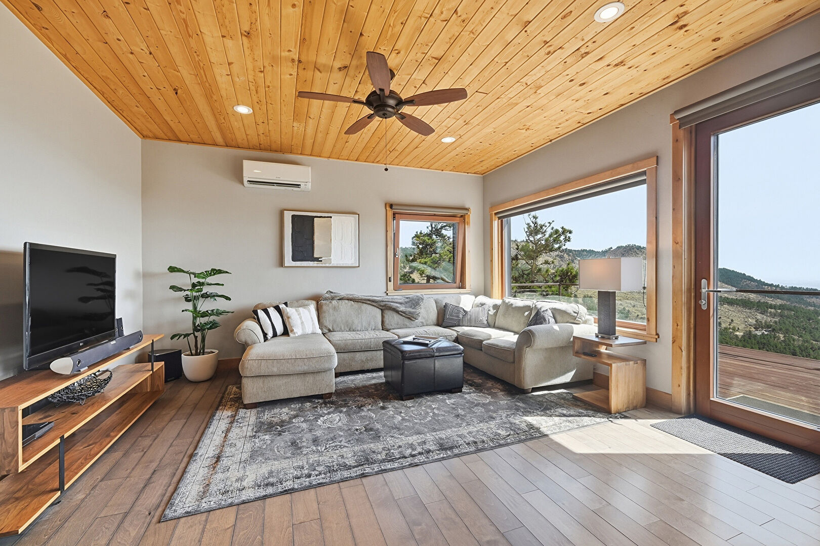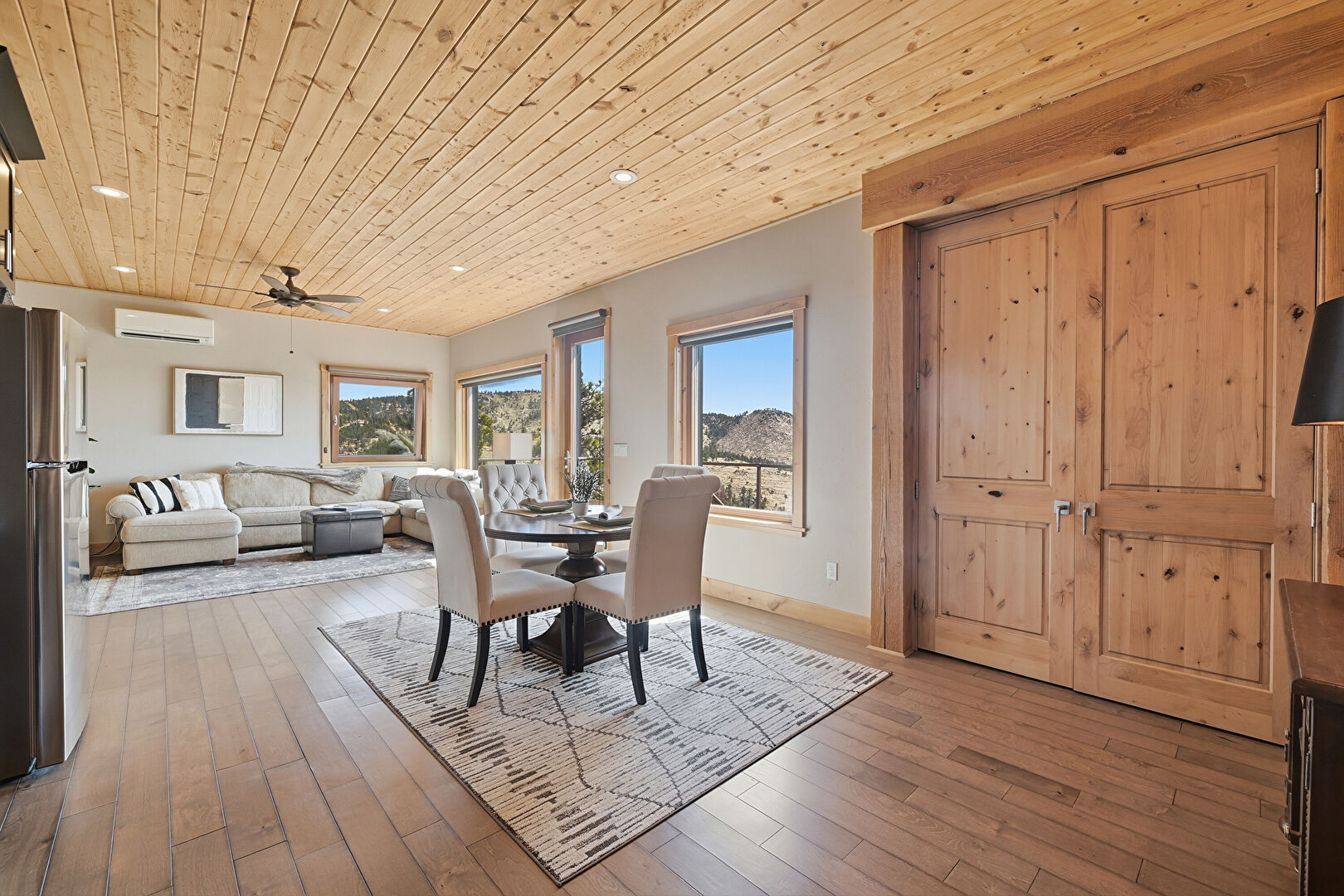 Baseboards Wall, Ceiling Fan, Drywall, Natural Light, Recessed Lighting, Wall Mounted Ac, Wood Ceiling, Wood Finish Floor, Wall Mounted Ac, Wood Ceiling
