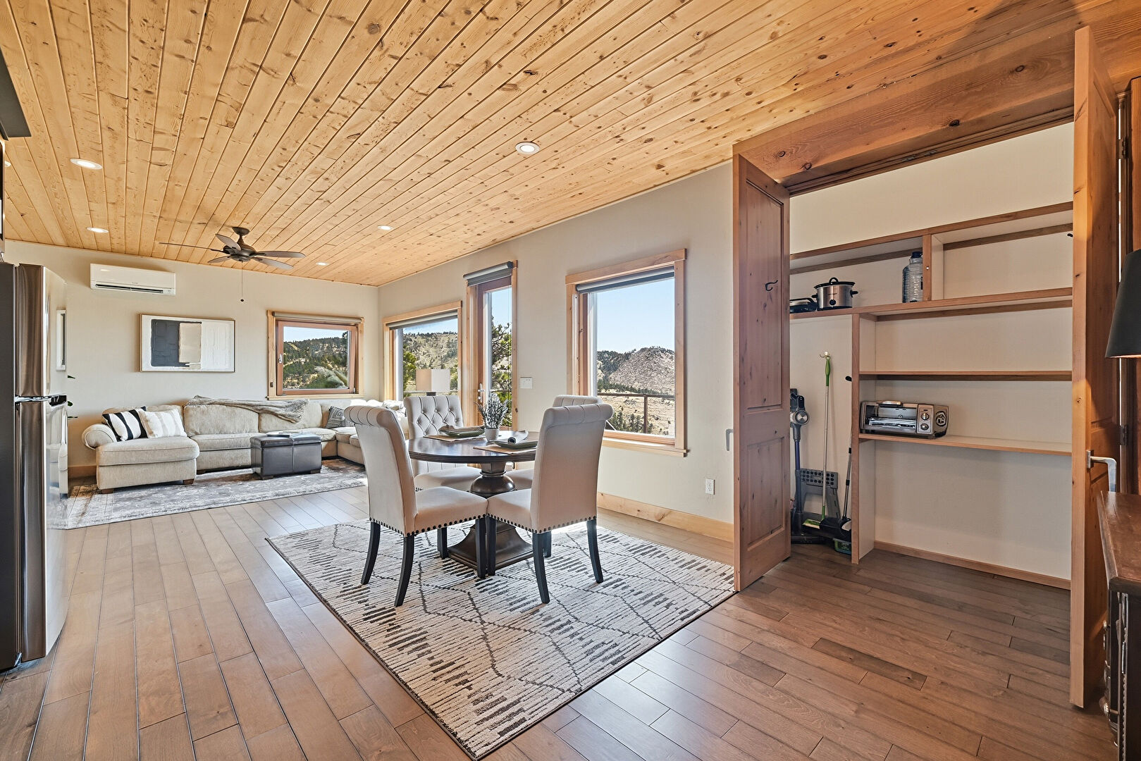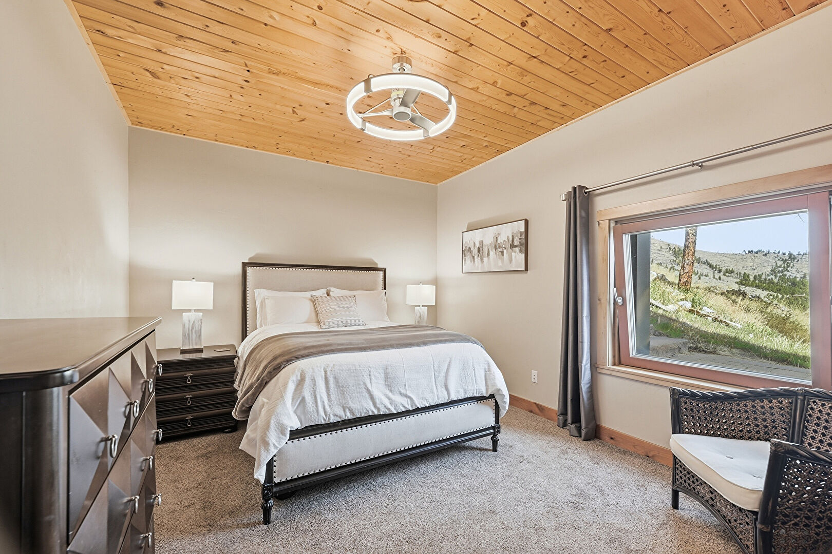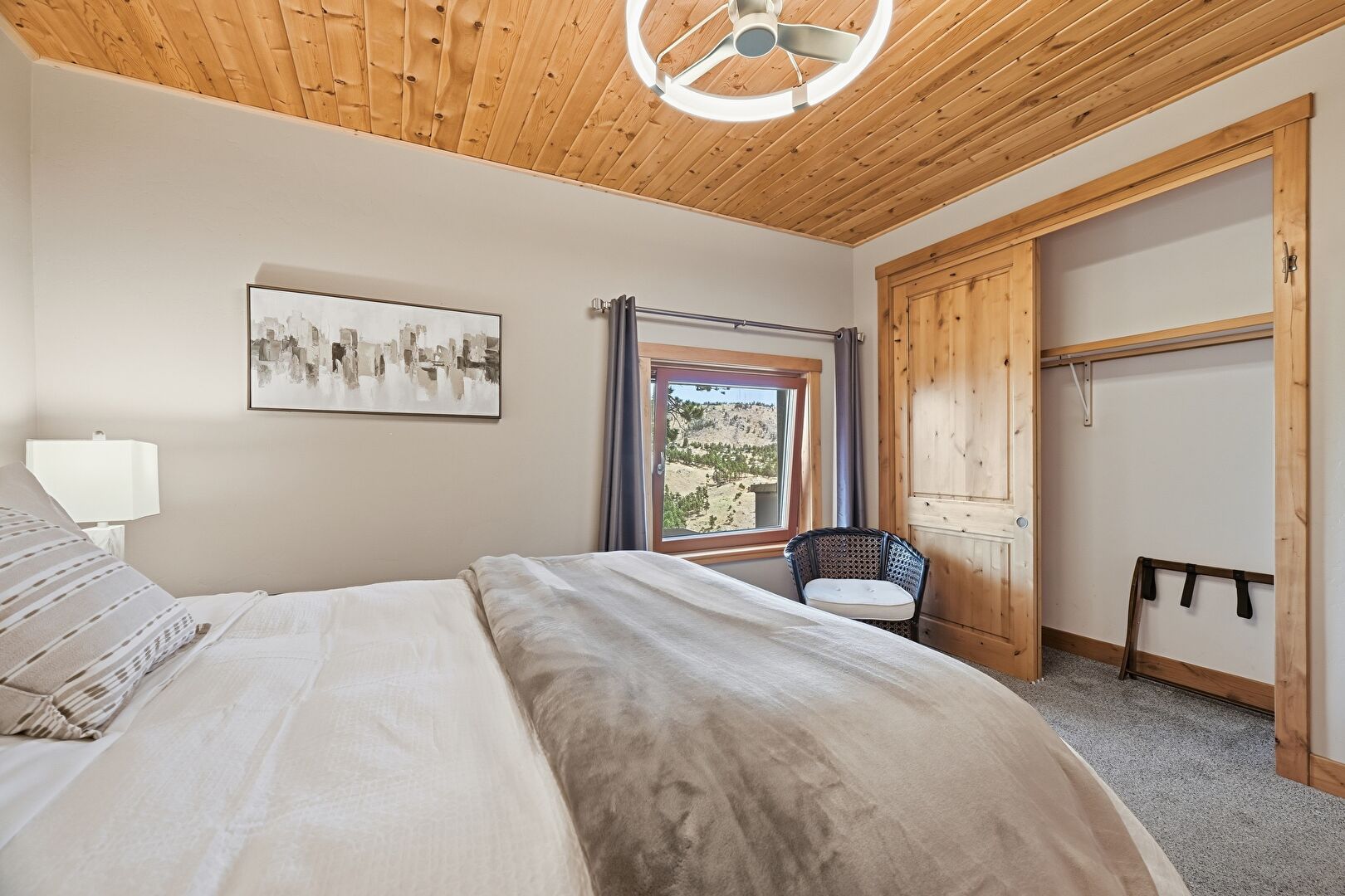 Baseboards Wall, Carpet, Closet, Drywall, Mountain View, Natural Light, Wood Ceiling, Baseboards Wall, Ceiling Fan, Drywall