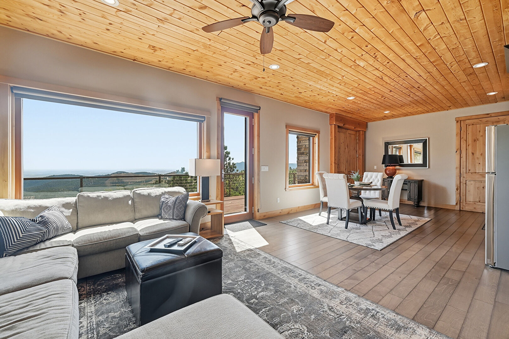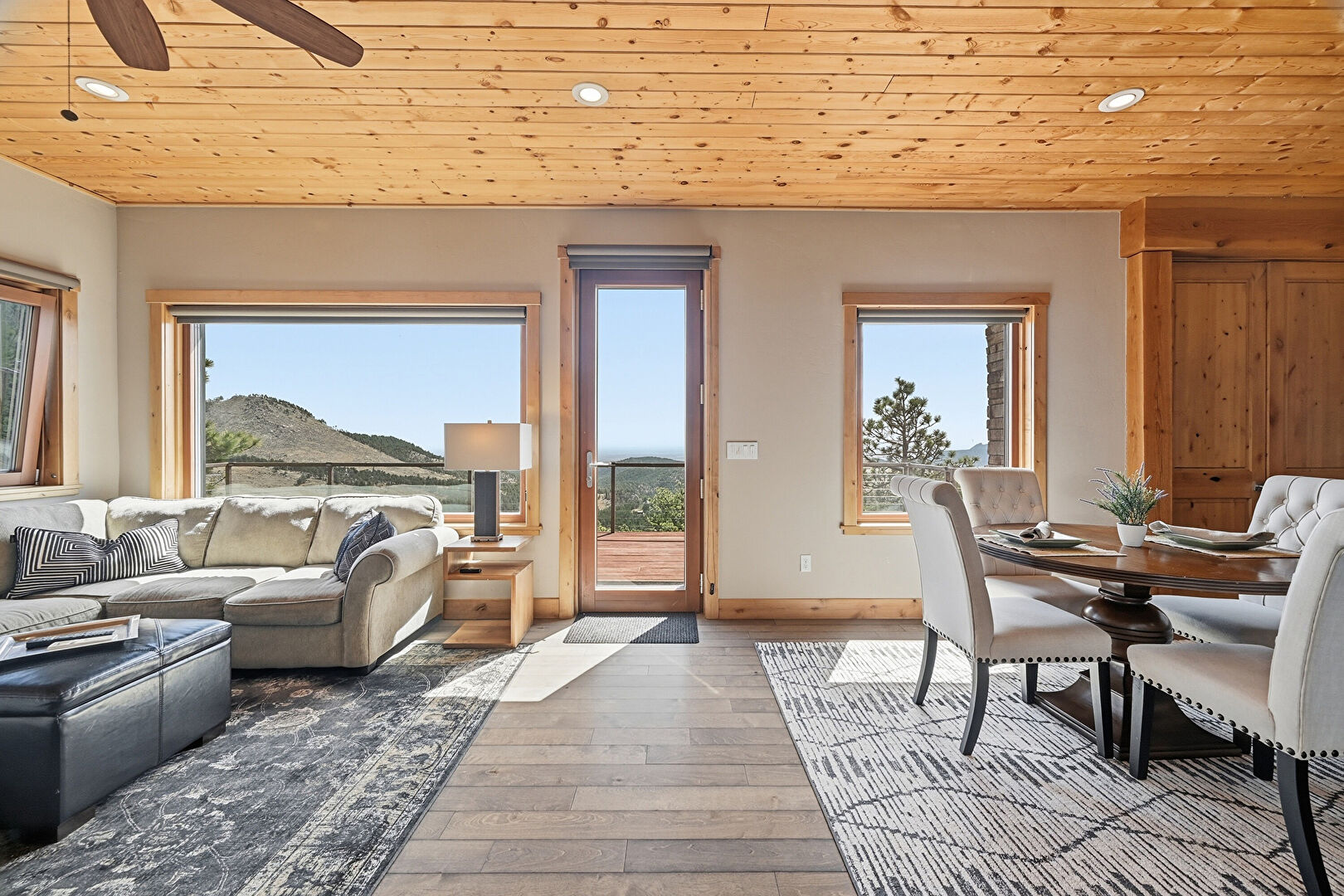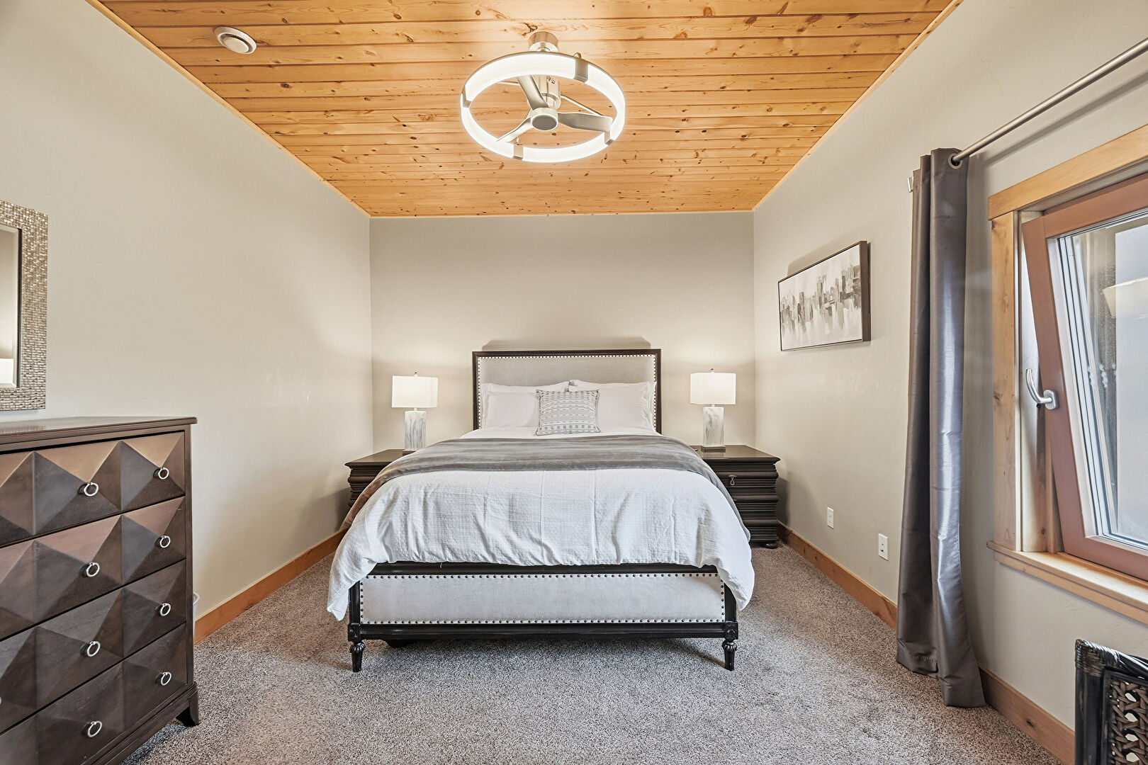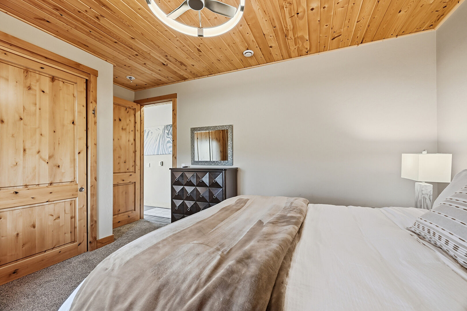 Baseboards Wall, Carpet, Closet, Drywall, Mountain View, Natural Light, Wood Ceiling, Baseboards Wall, Ceiling Fan, Drywall