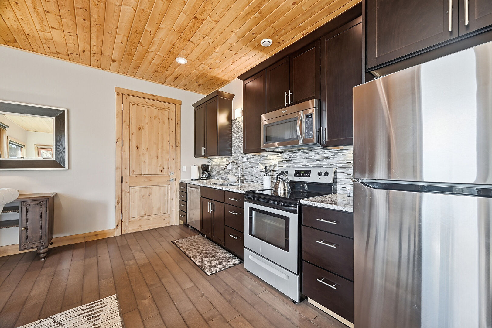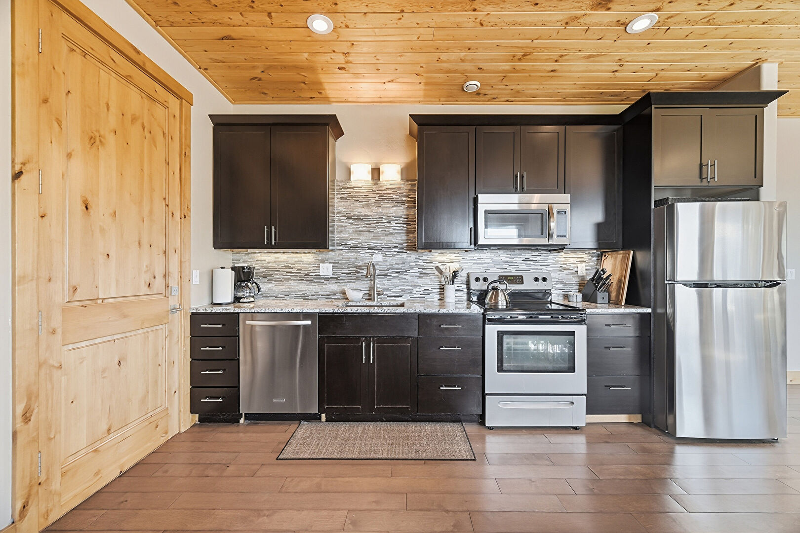 Baseboards Wall, Crown Molding Cabinets, Dark Brown Cabinets, Drywall, One Wall Kitchen, Recessed Lighting, Shaker Cabinets, Stone Countertops, Wood Ceiling, Wood Finish Floor, Shaker Cabinets, Stone Countertops