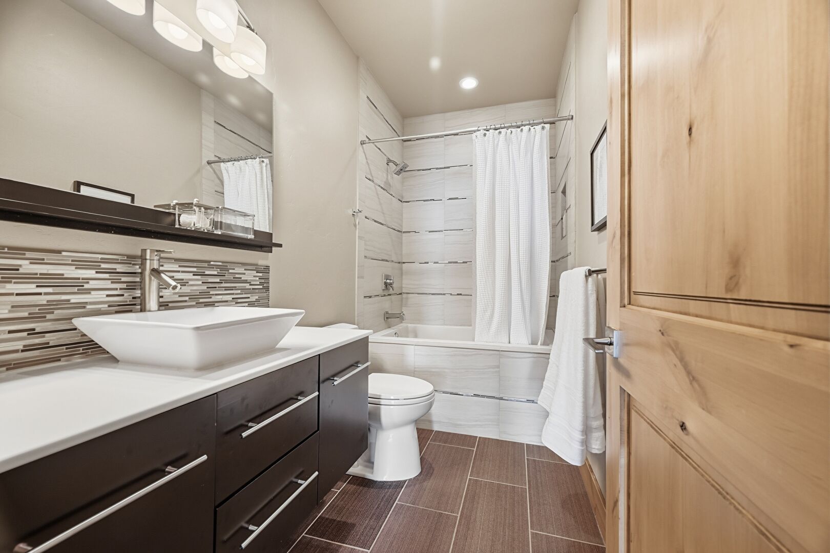 Combined Bath Shower, Drywall, Full Bathroom, Vanity, Wood Finish Floor, Recessed Lighting