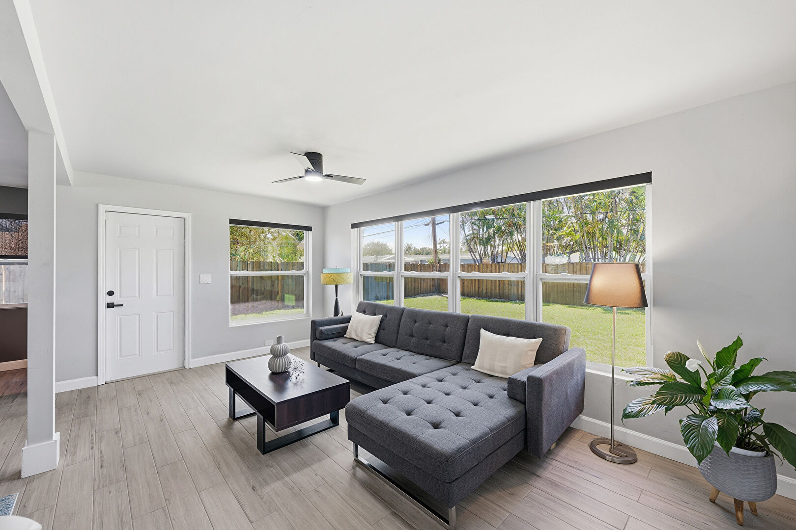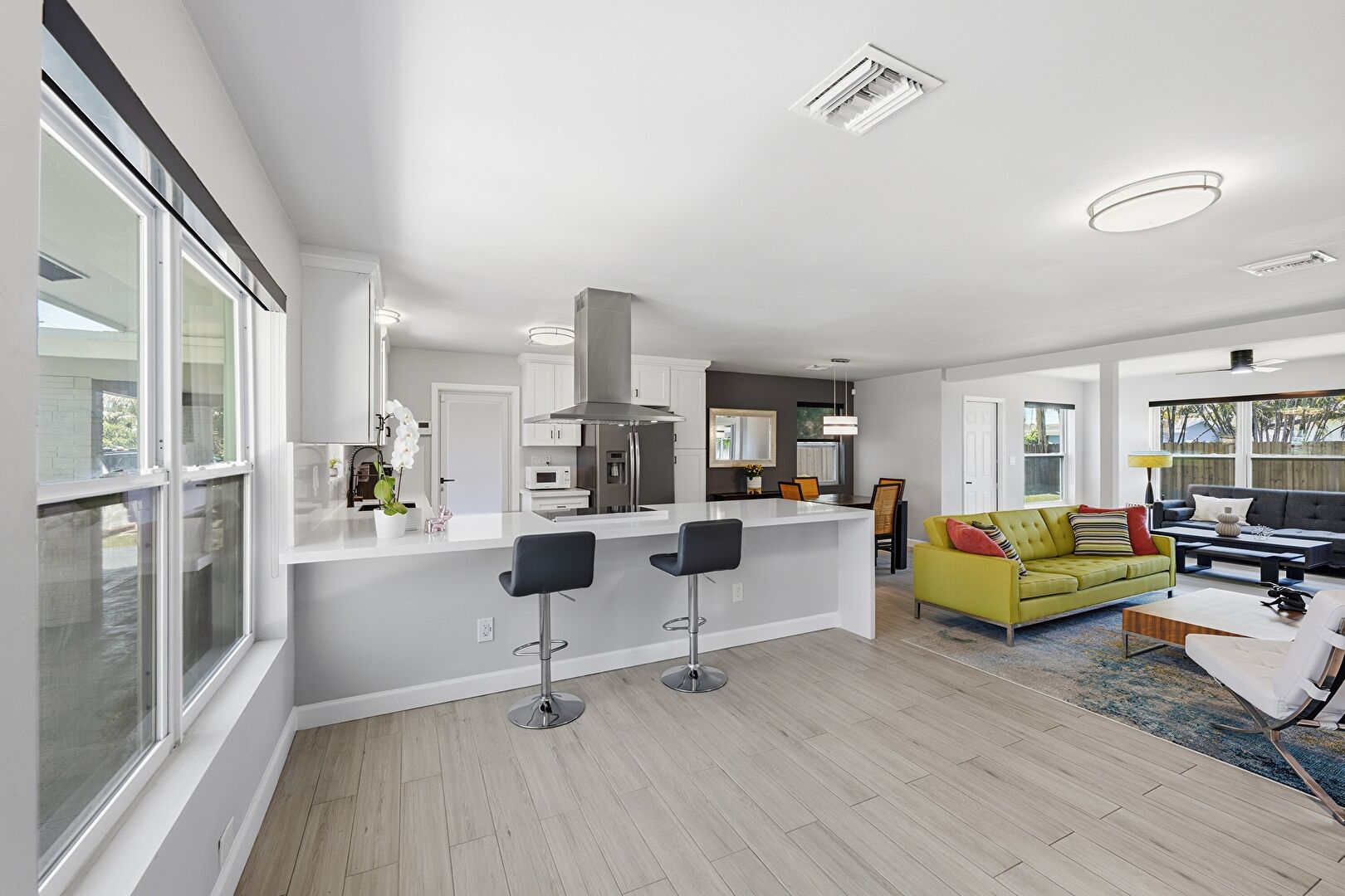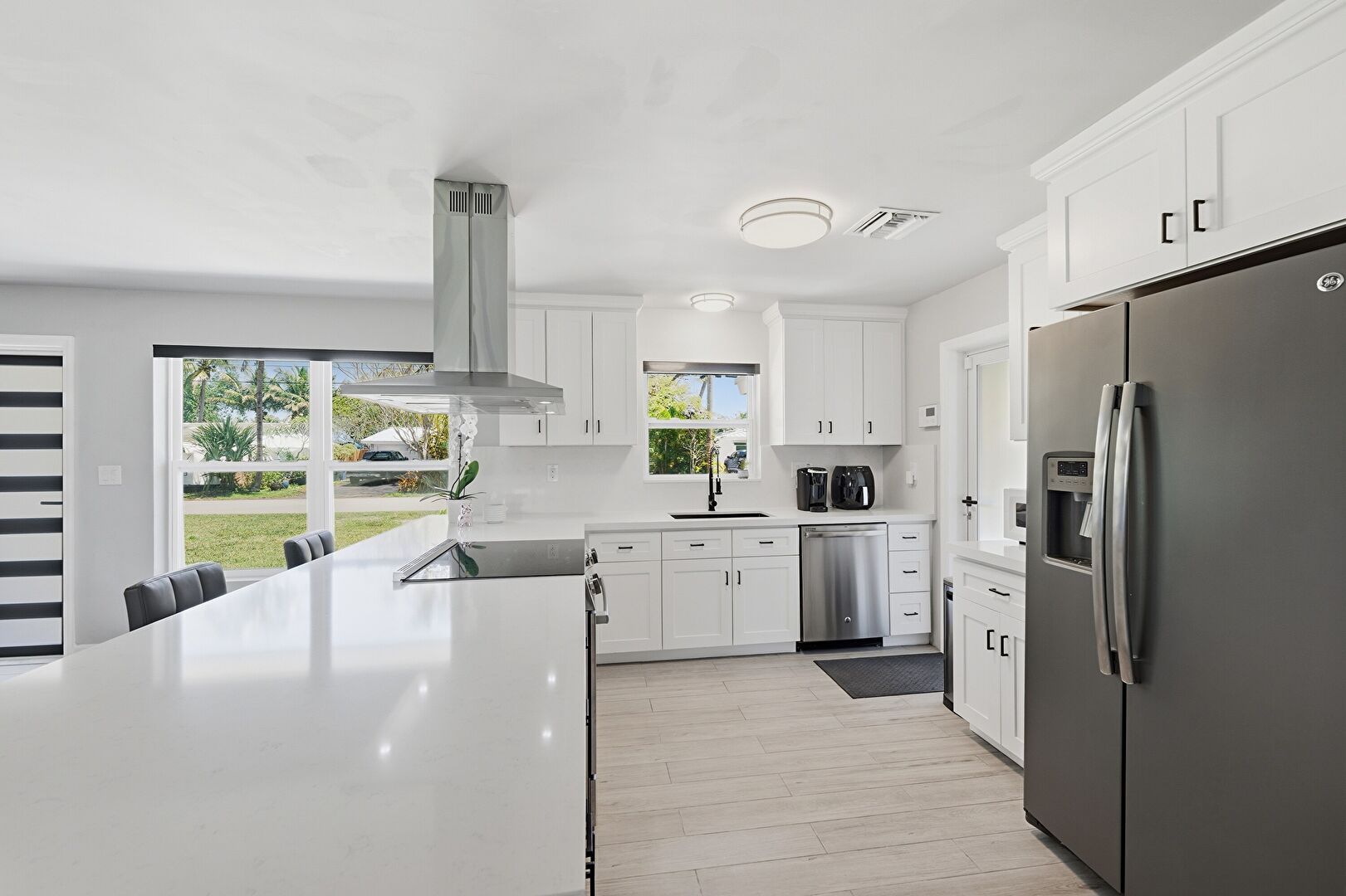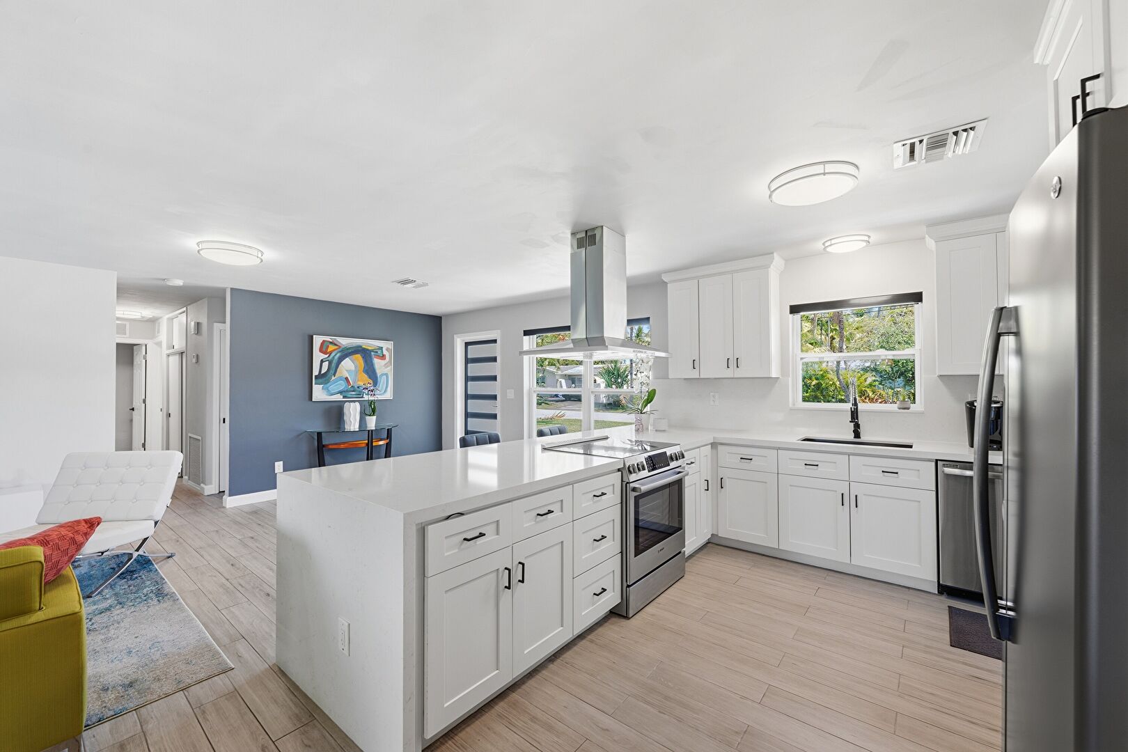 Baseboards Wall, Ceiling Fan, Drywall, Natural Light, U Shaped Kitchen, Vent, Water View, Wood Finish Floor, Natural Light, Vent, Wood Finish Floor