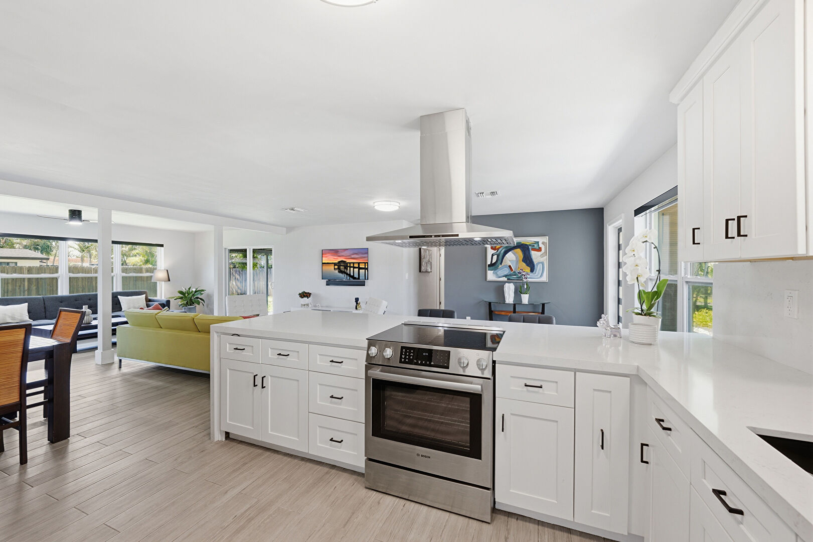 Baseboards Wall, Crown Molding Cabinets, Drywall, Kitchen Bar, Kitchen Peninsula, Natural Light, Opens To Living Area, Pendant Lighting, Shaker Cabinets, Stone Countertops, U Shaped Kitchen, Vent, Wood Finish Floor, Drywall, Natural Light, Wood Finish Floor