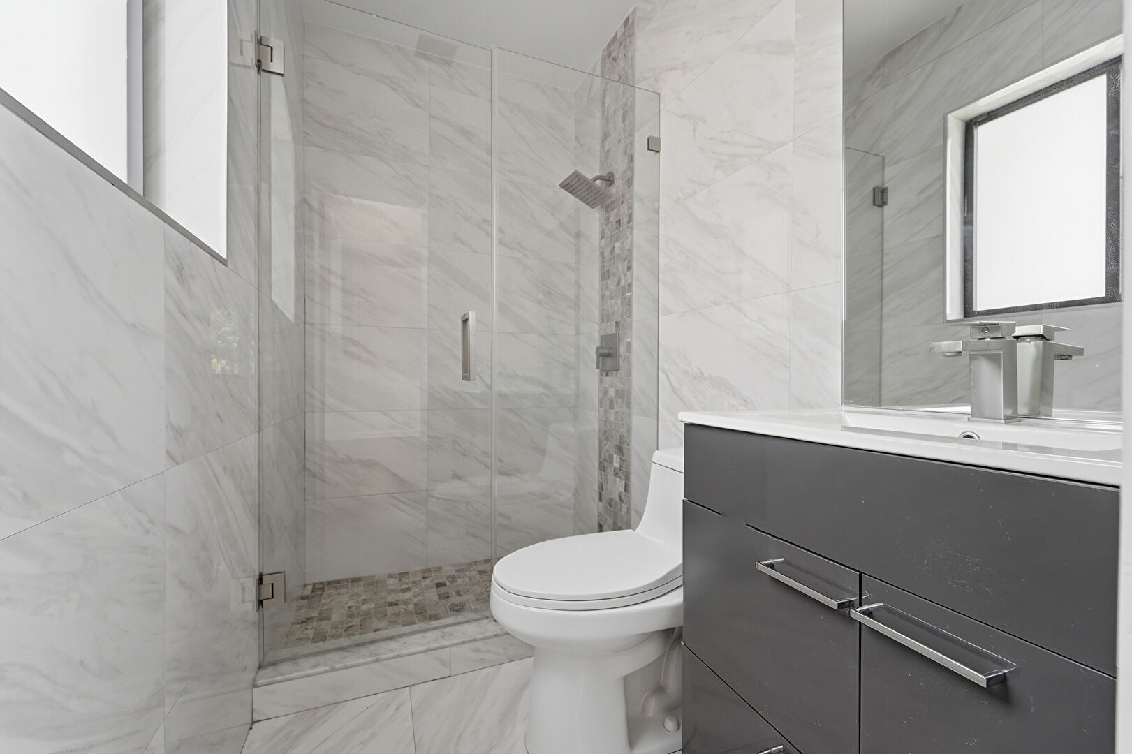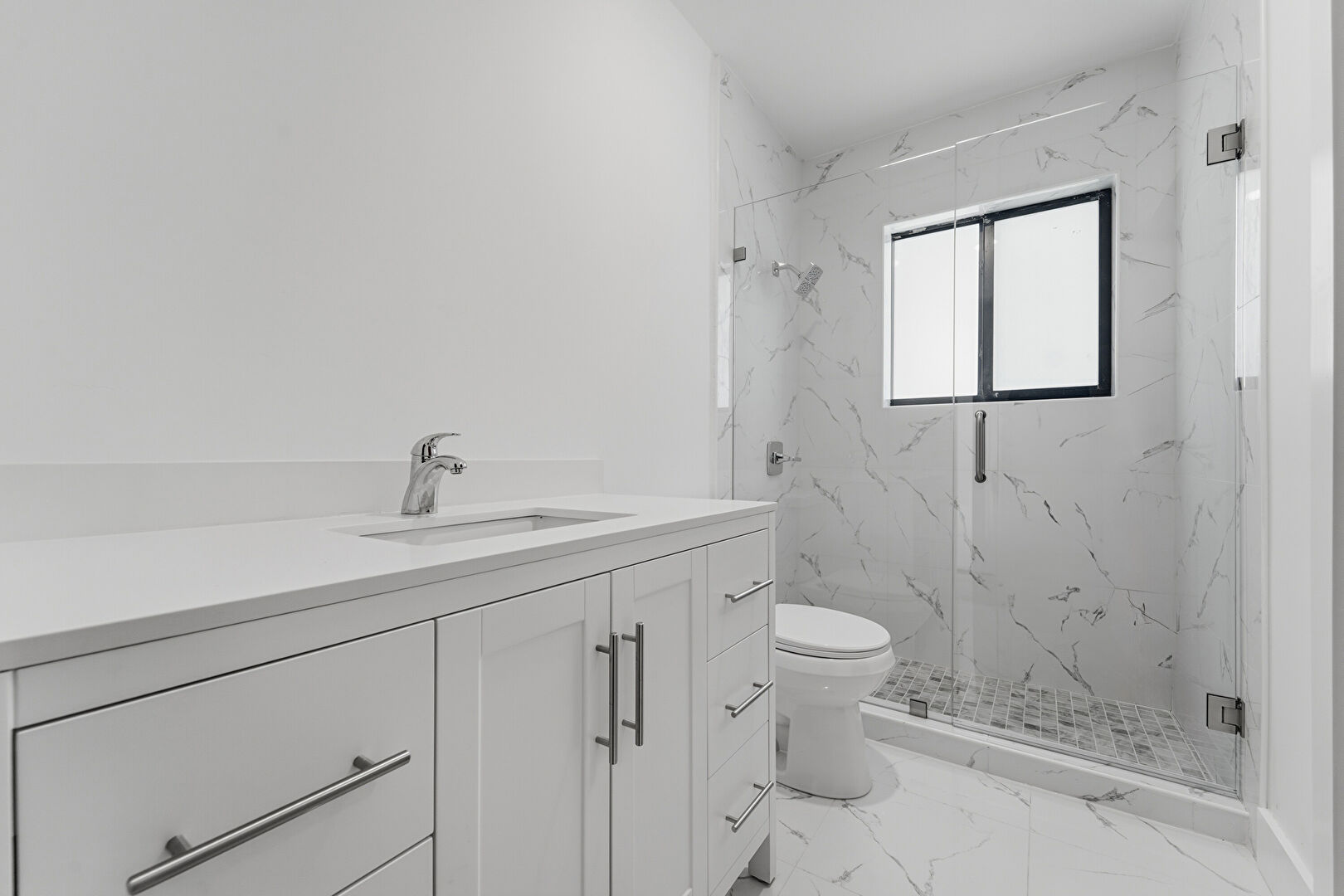 Drywall, Full Bathroom, Natural Light, Vanity, Marble Finish Floor