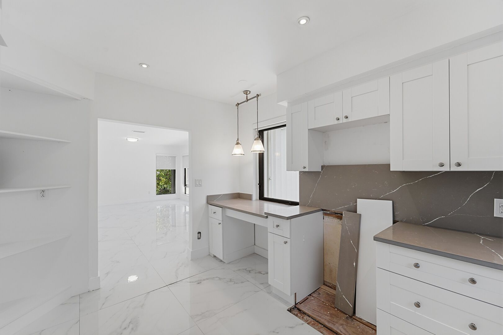 Baseboards Wall, Drywall, Marble Finish Floor, Natural Light, Open Shelves, Pendant Lighting, Recessed Lighting, Shaker Cabinets, Stone Countertops, U Shaped Kitchen, Vent, Drywall, Recessed Lighting, Shaker Cabinets