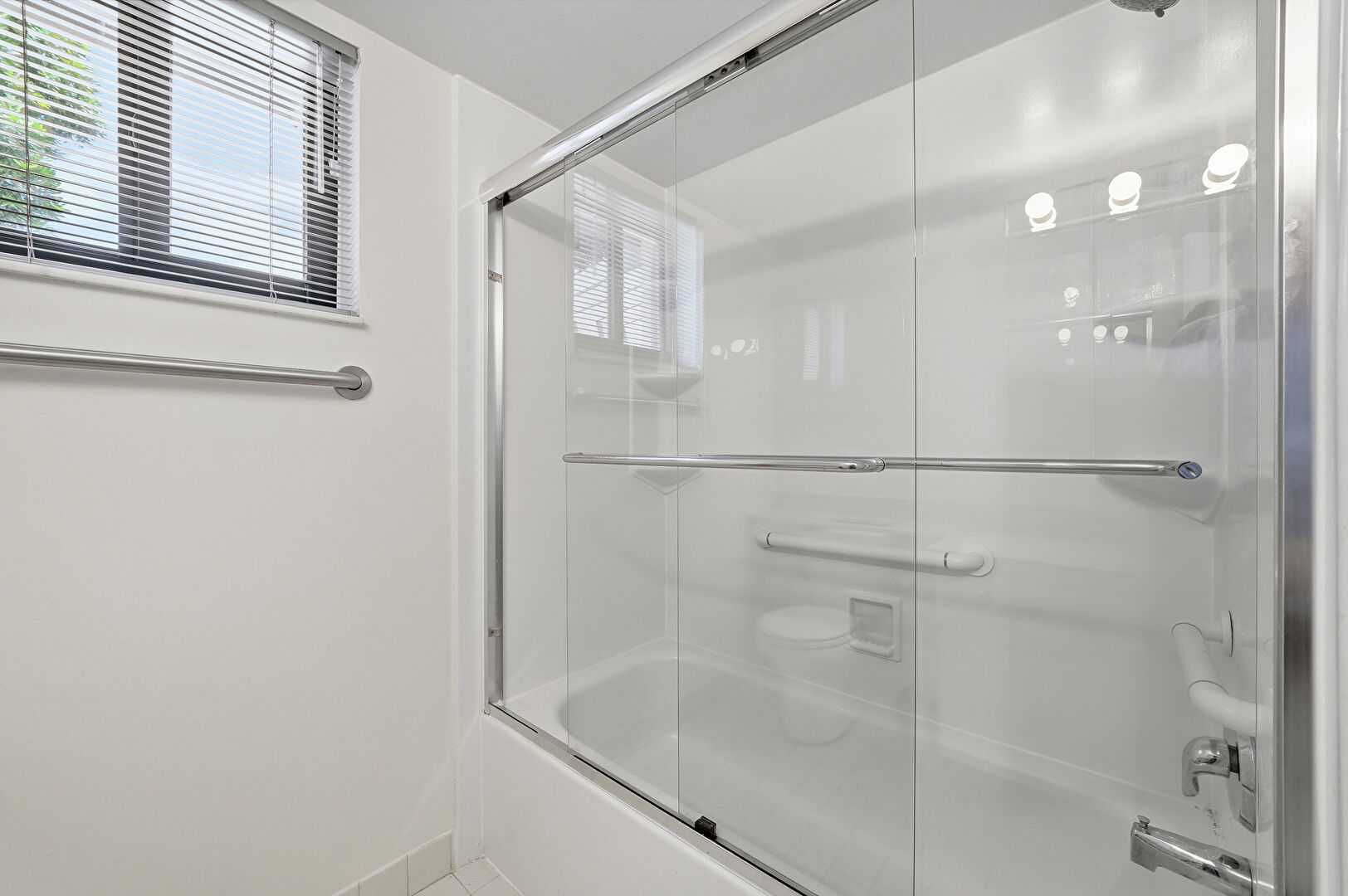 Baseboards Wall, Combined Bath Shower, Drywall, Full Bathroom, Natural Light, Tile Floor, Vent, Full Bathroom, Vanity