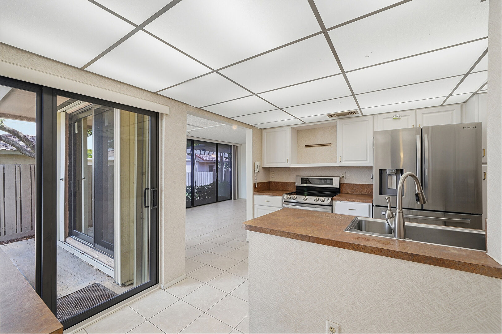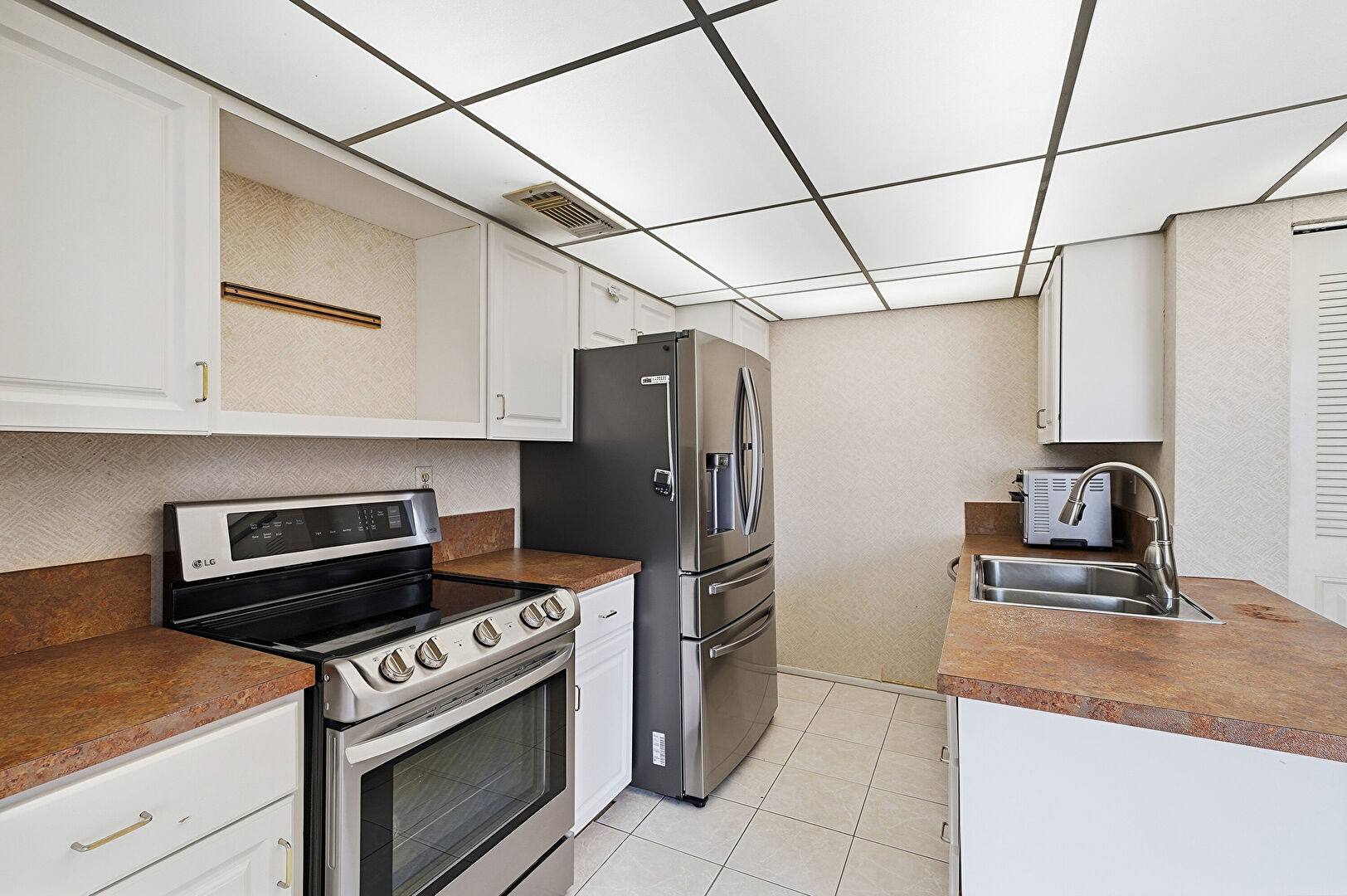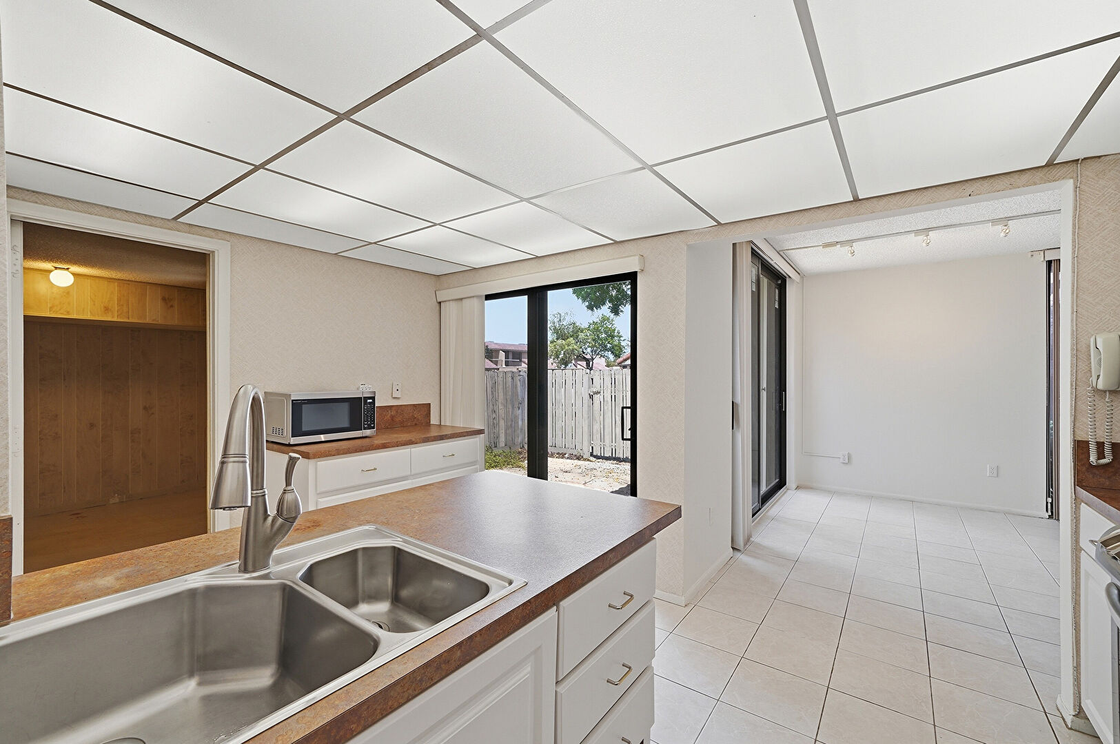 Baseboards Wall, Drop Ceiling, Galley Kitchen, Kitchen Peninsula, Natural Light, Open Shelves, Raised Cabinets, Textured Wall, Tile Floor, Toaster, Vent, Drop Ceiling, Drywall, Tile Floor, Vent