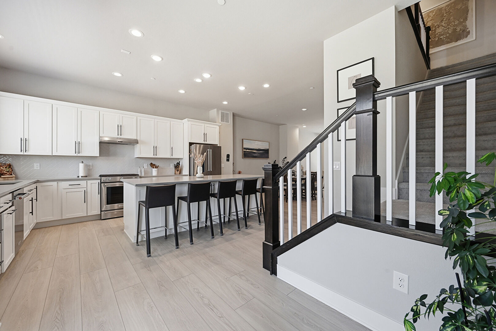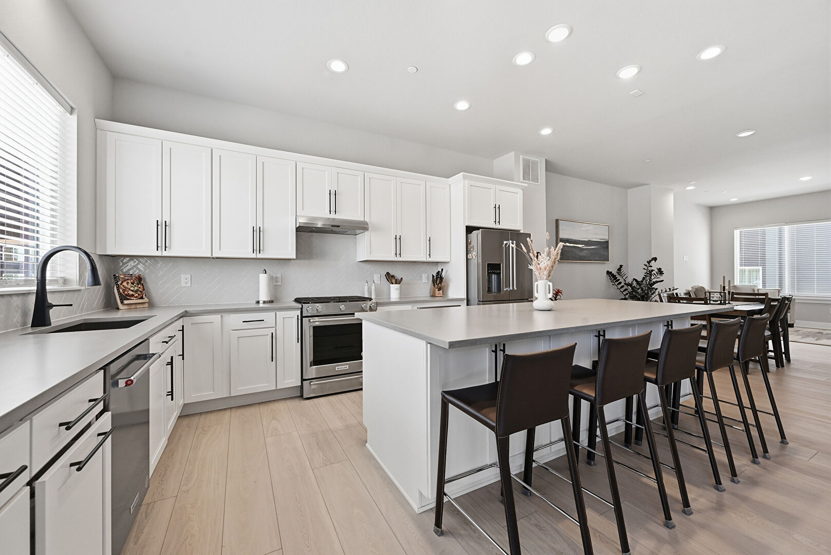Crown Molding Cabinets, Drywall, Kitchen Bar, Kitchen Island, L Shaped Kitchen, Natural Light, Recessed Lighting, Shaker Cabinets, Stone Countertops, Vent, Wood Finish Floor, Crown Molding Cabinets, Drywall