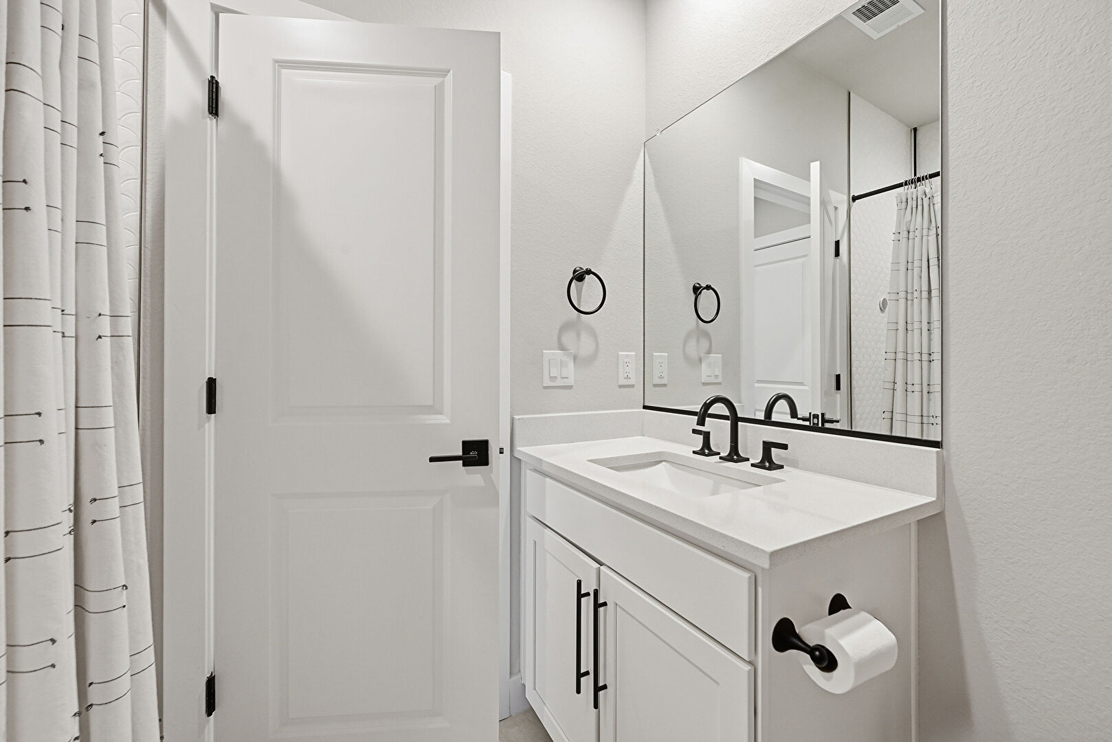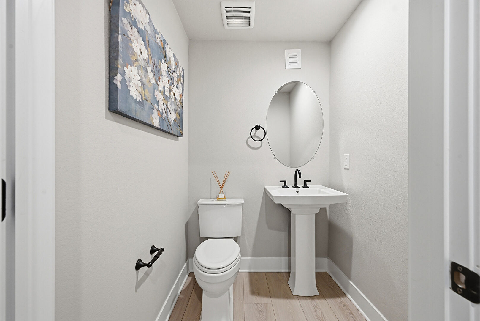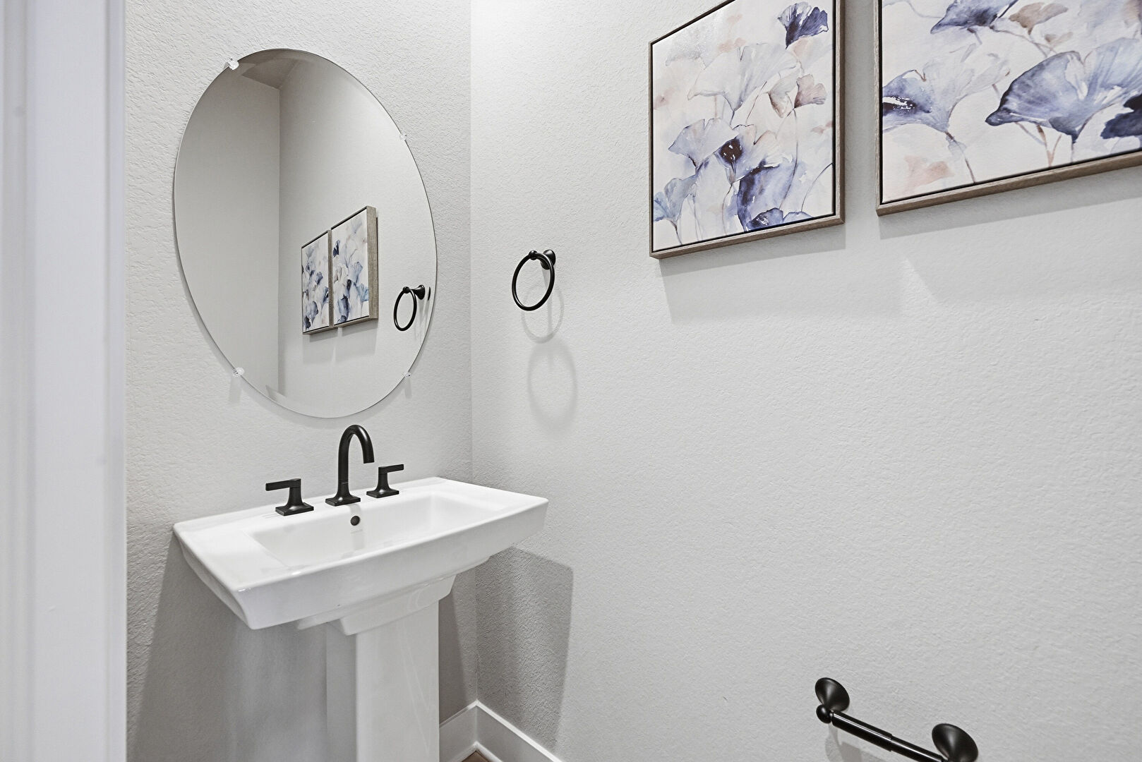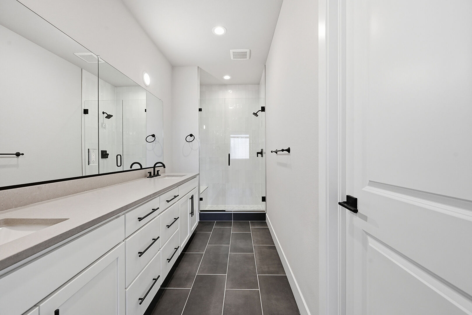 Baseboards Wall, Double Vanity, Drywall, Full Bathroom, Half Bathroom, Recessed Lighting, Textured Wall, Tile Floor, Vent, Wood Finish Floor, Drywall, Full Bathroom, Textured Wall, Vanity