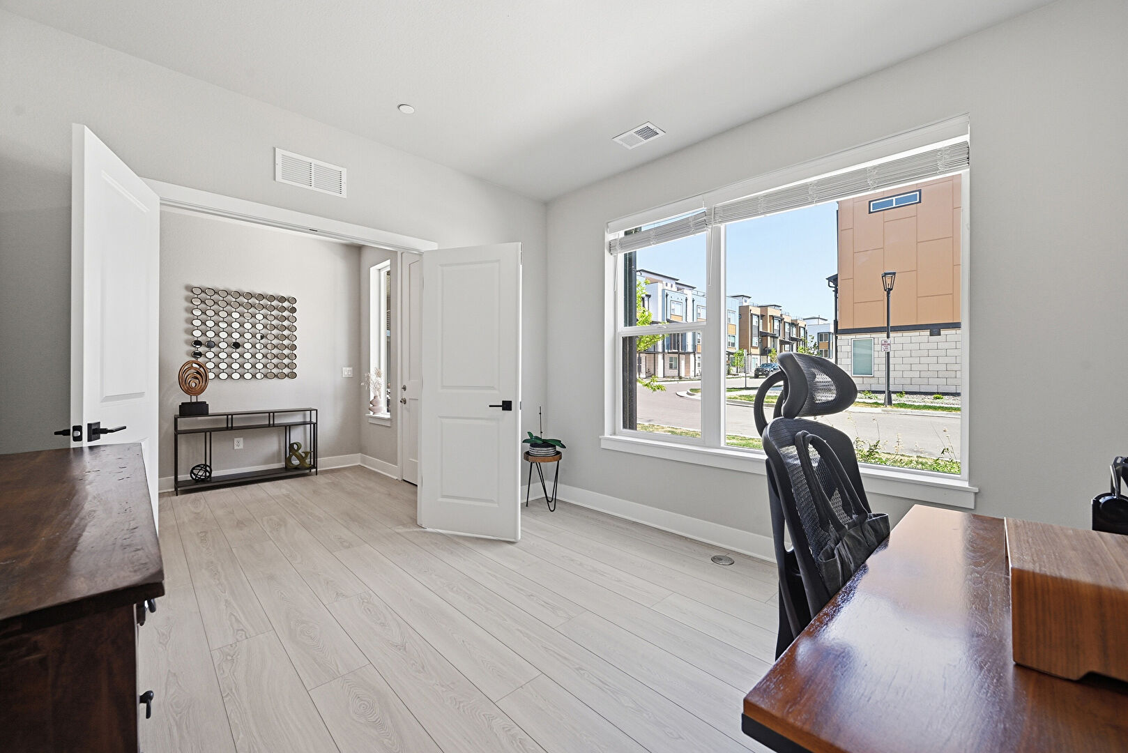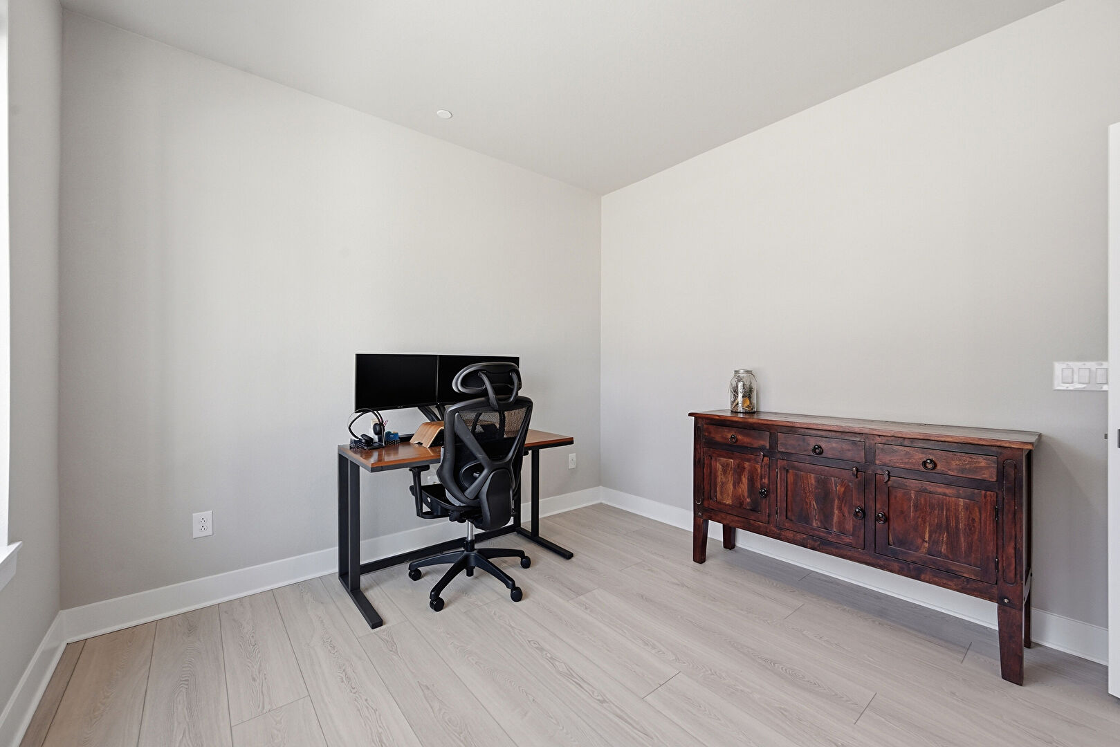 Baseboards Wall, Drywall, Natural Light, Recessed Lighting, Vent, Wood Finish Floor, Office Area