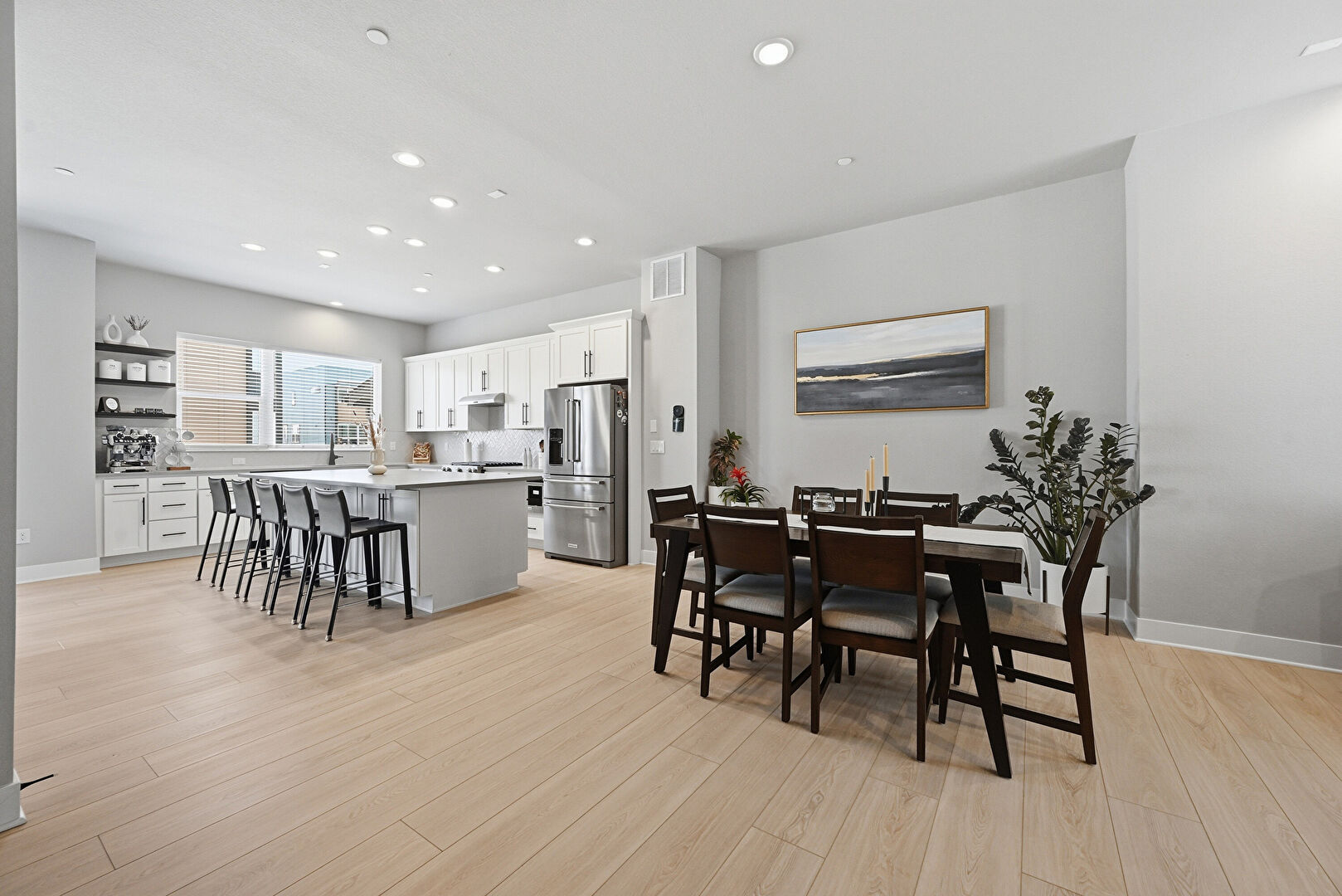 Baseboards Wall, Drywall, Natural Light, Recessed Lighting, Vent, Wood Finish Floor, L Shaped Kitchen