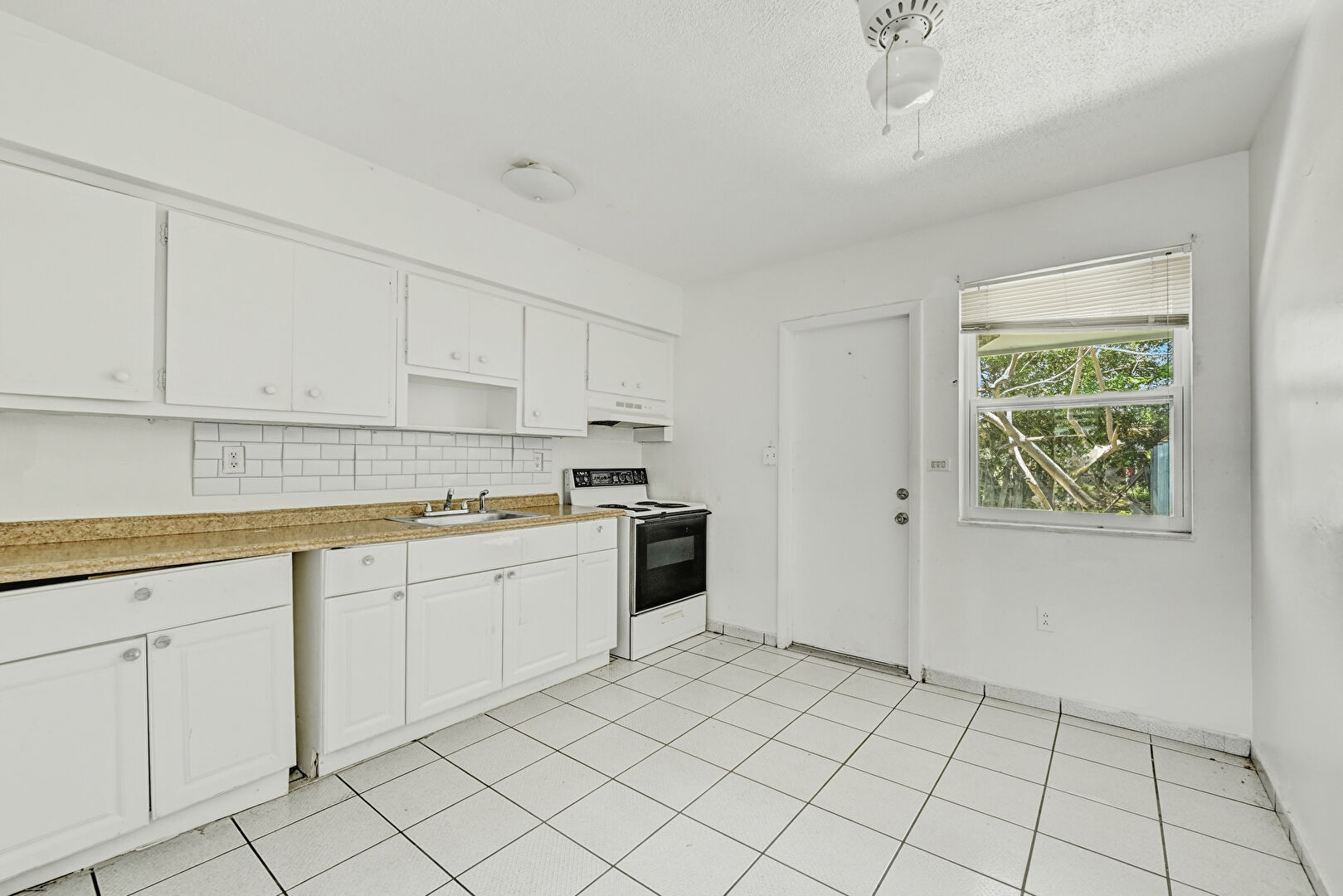 Baseboards Wall, Drywall, Natural Light, Raised Cabinets, Smoke Carbon Monoxide Detector, Textured Ceiling, Tile Floor, Visible Hinge Cabinets, Drywall, Vent