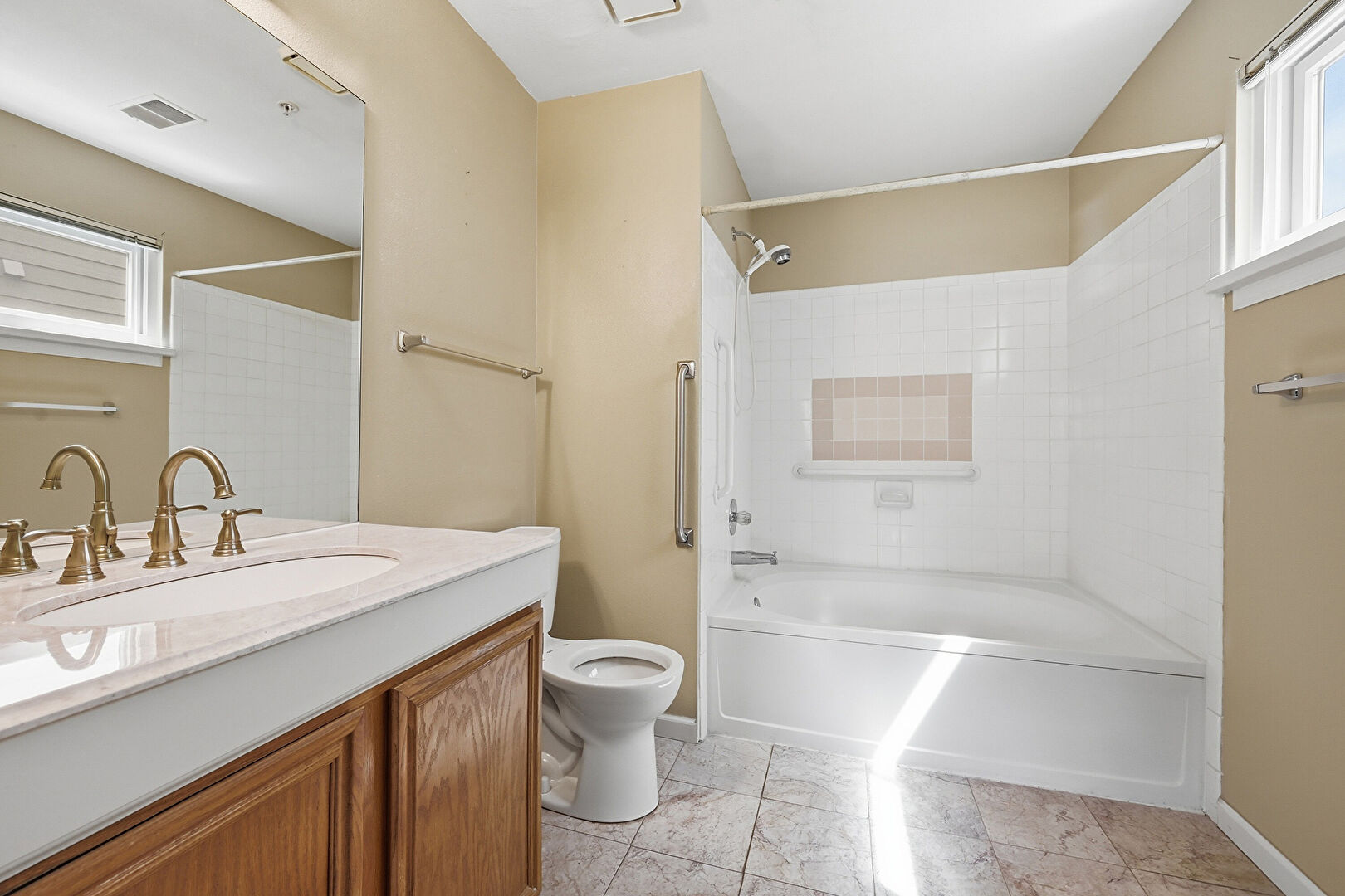 Baseboards Wall, Combined Bath Shower, Drywall, Full Bathroom, Natural Light, Vanity, Vent