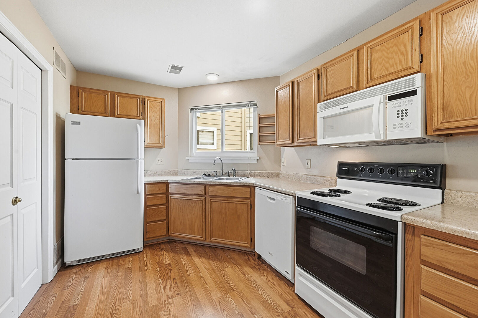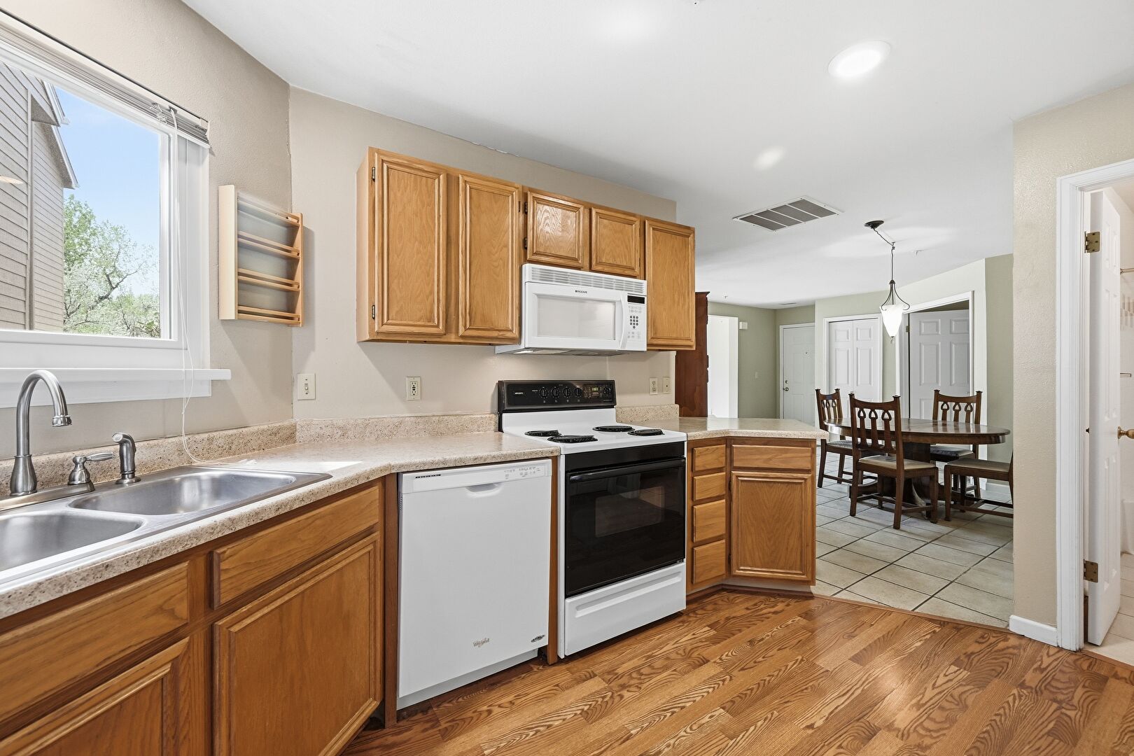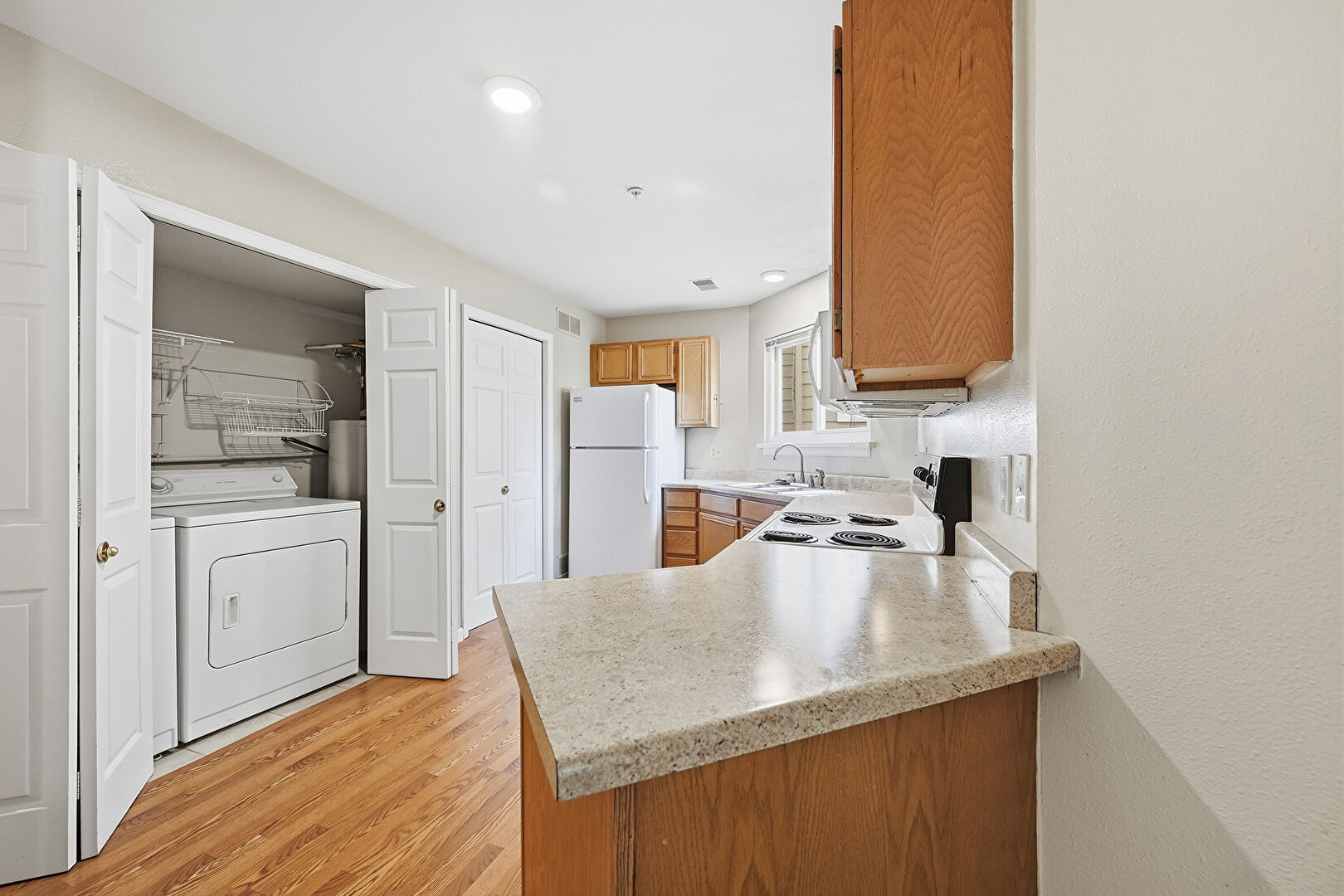 Drywall, Kitchen Peninsula, Laundry, Medium Brown Cabinets, Natural Light, Pendant Lighting, Recessed Lighting, Shaker Cabinets, Textured Wall, Tile Floor, U Shaped Kitchen, Vent, Visible Hinge Cabinets, Washer Dryer, Wood Finish Floor, Vent, Wood Finish Floor