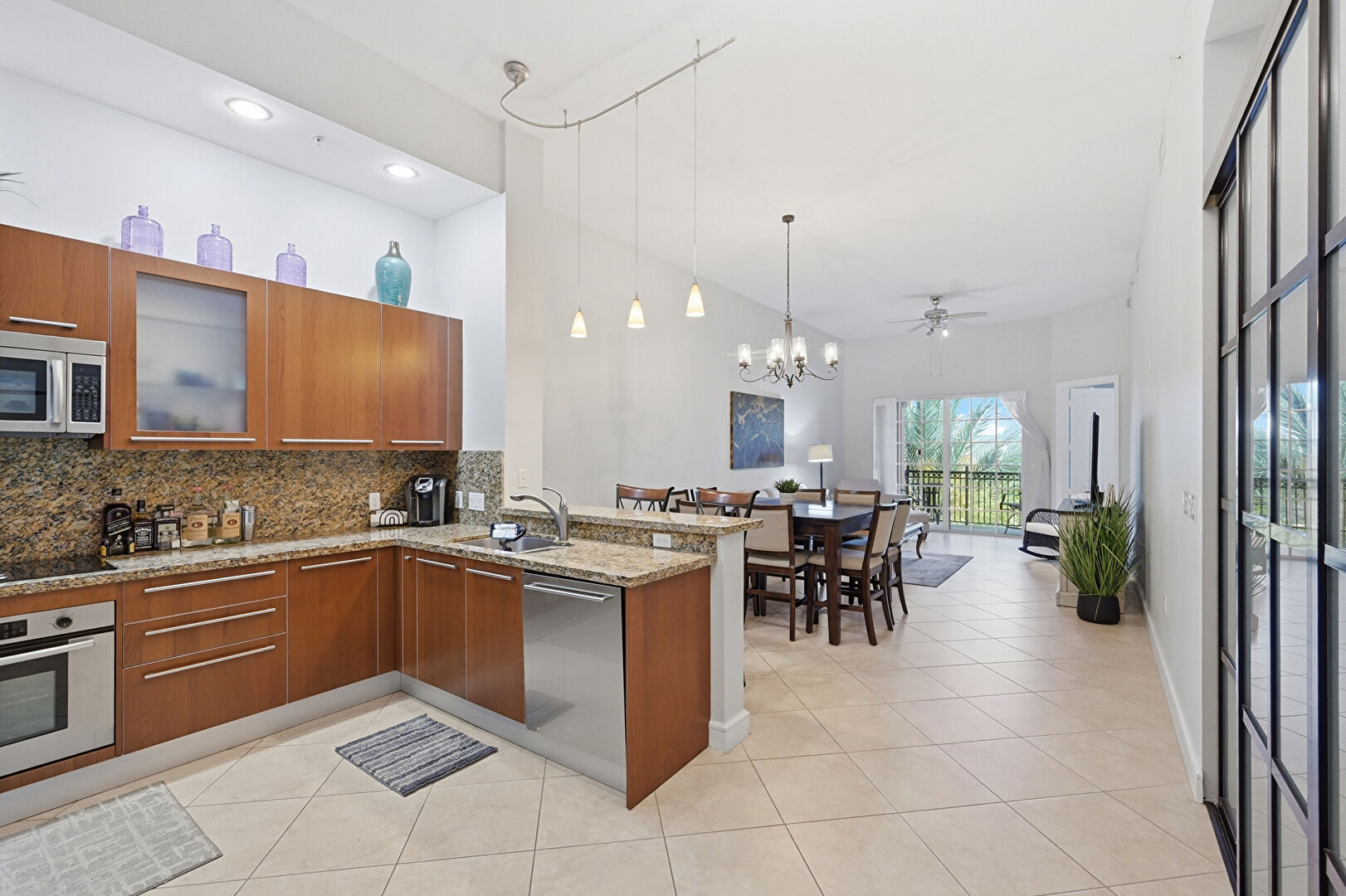 Baseboards Wall, Ceiling Fan, Drywall, Flat Panel Cabinets, Glass Insert Cabinets, High Ceiling, Kitchen Bar, Kitchen Peninsula, Medium Brown Cabinets, Natural Light, Notable Chandelier, Opens To Living Area, Pendant Lighting, Recessed Lighting, Stone Countertops, Tile Floor, Toaster, U Shaped Kitchen, Vaulted Ceiling, Vent, Glass Insert Cabinets, High Ceiling, Kitchen Peninsula, Stone Countertops