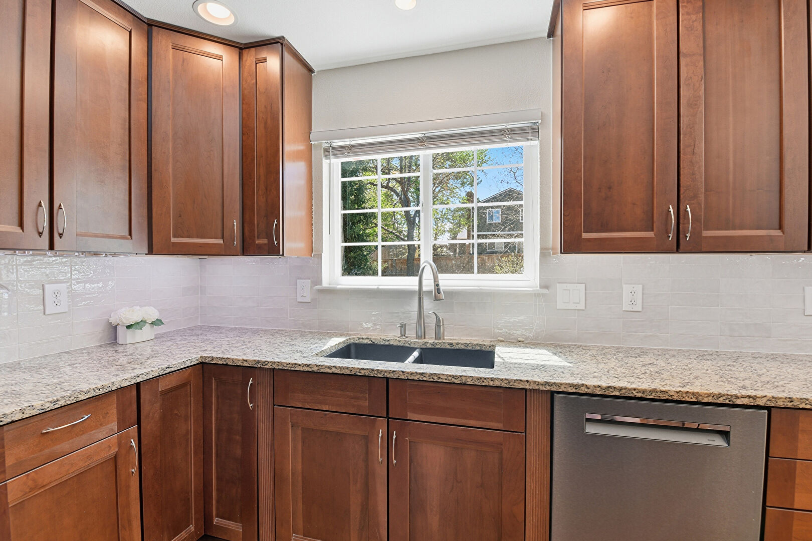 Baseboards Wall, Dark Brown Cabinets, Drywall, Fireplace, Medium Brown Cabinets, Natural Light, Notable Chandelier, Opens To Living Area, Pendant Lighting, Recessed Lighting, Shaker Cabinets, Stone Countertops, U Shaped Kitchen, Wood Finish Floor, Baseboards Wall, Natural Light, Recessed Lighting, Shaker Cabinets, Stone Countertops