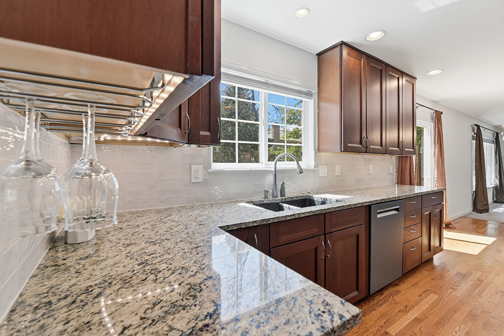 Baseboards Wall, Dark Brown Cabinets, Drywall, Natural Light, Notable Chandelier, Opens To Living Area, Pendant Lighting, Recessed Lighting, Shaker Cabinets, Stone Countertops, U Shaped Kitchen, Wood Finish Floor, Notable Chandelier, Pendant Lighting