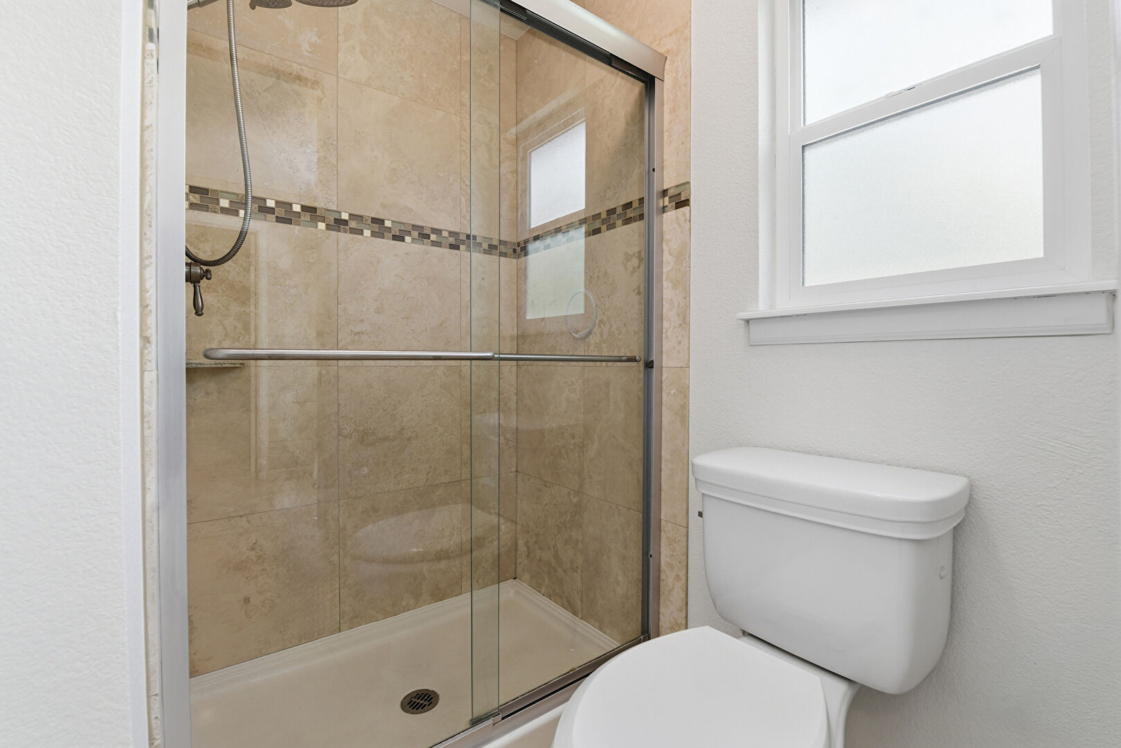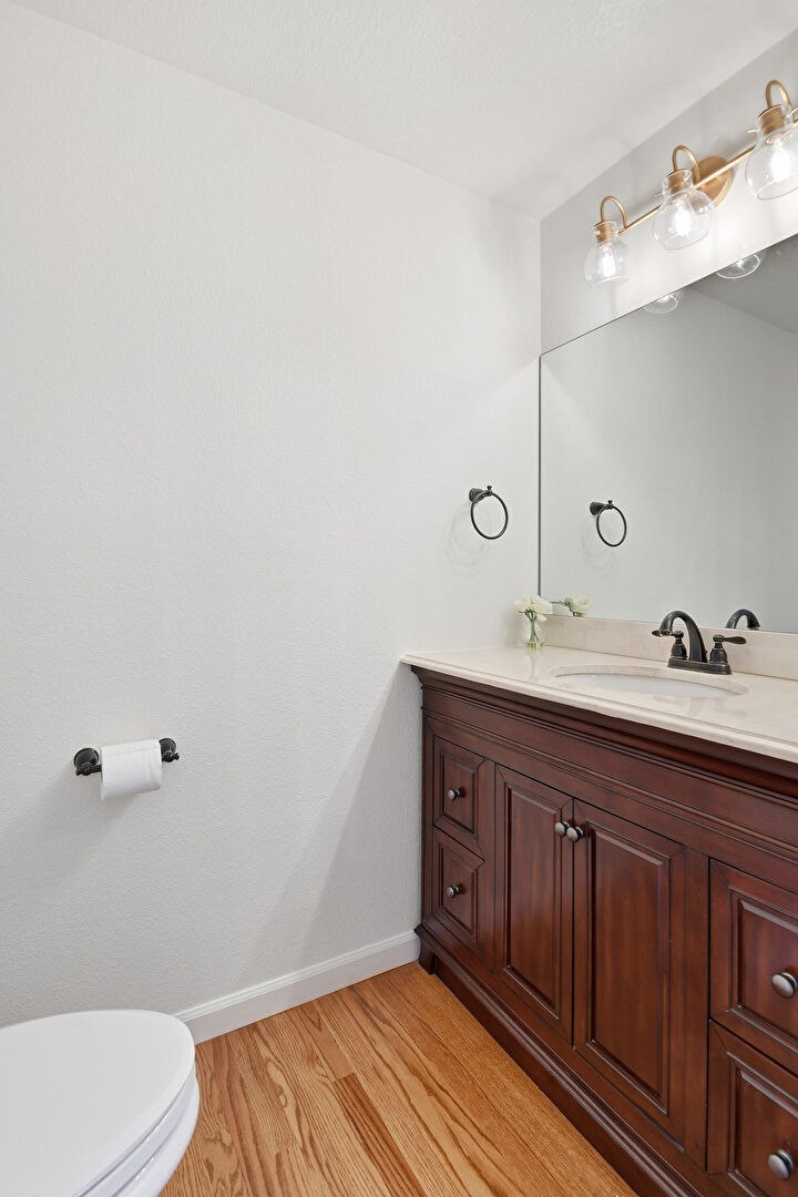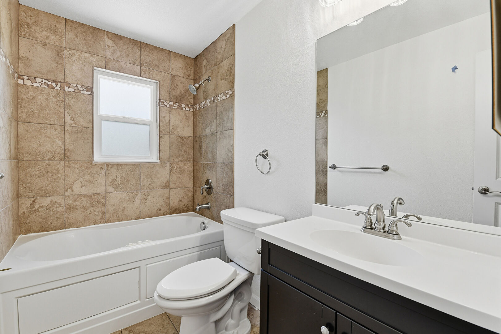 Combined Bath Shower, Drywall, Half Bathroom, Natural Light, Tile Floor, Vanity, Wood Finish Floor, Baseboards Wall, Full Bathroom