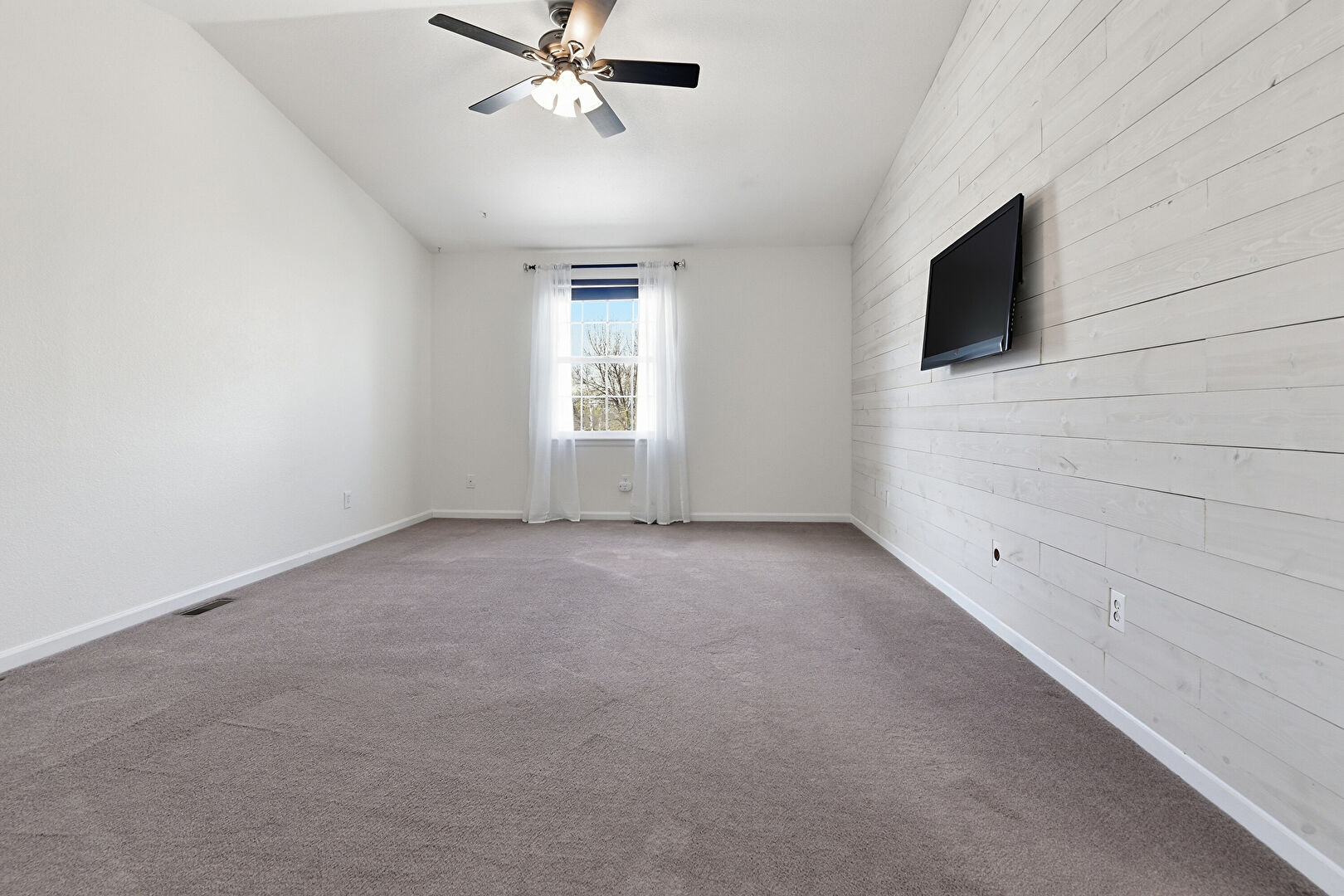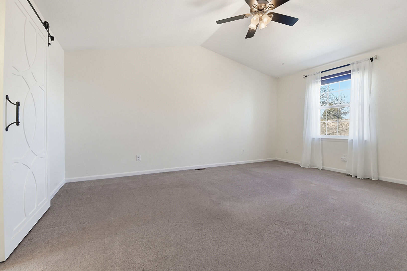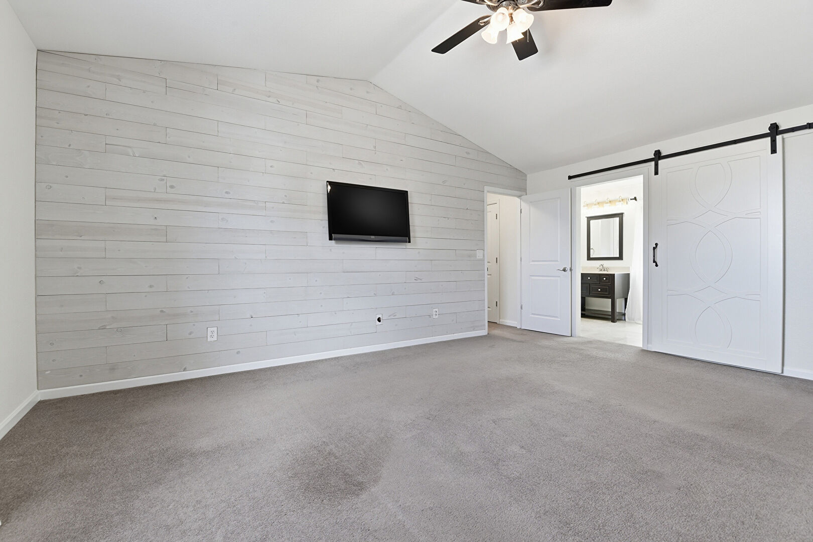 Barn Door, Baseboards Wall, Carpet, Cathedral Ceiling, Ceiling Fan, Drywall, Ensuite Bathroom, Natural Light, Vaulted Ceiling, Wood Wall, Cathedral Ceiling, Vaulted Ceiling, Vent