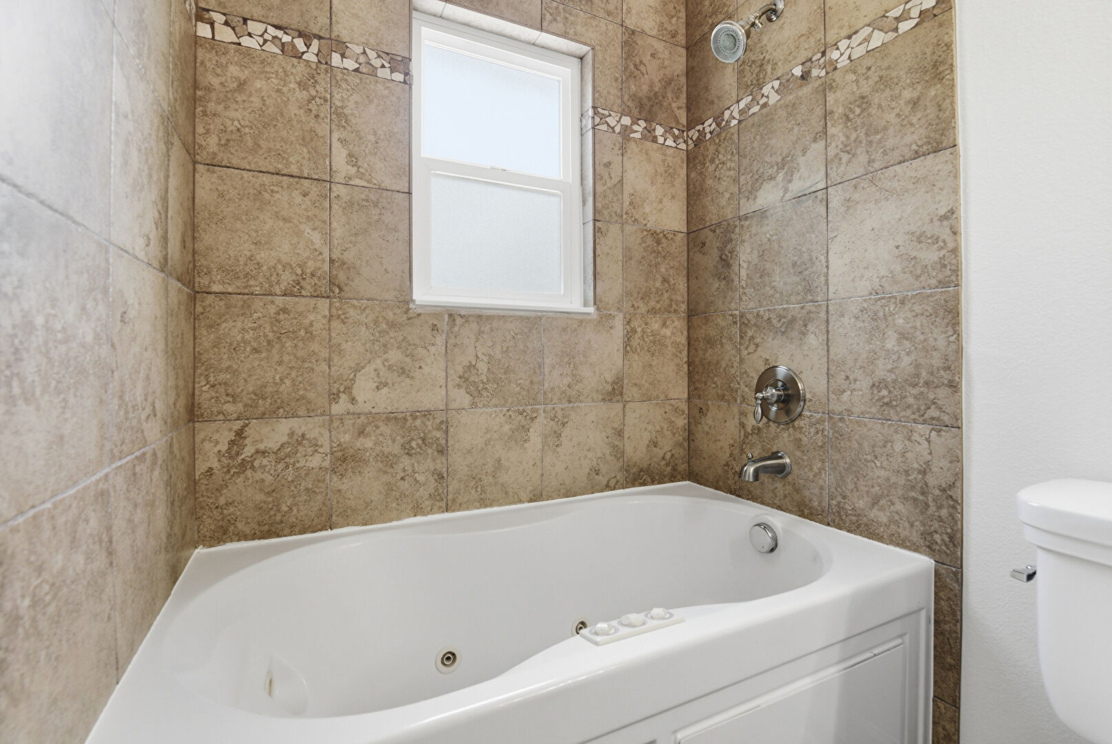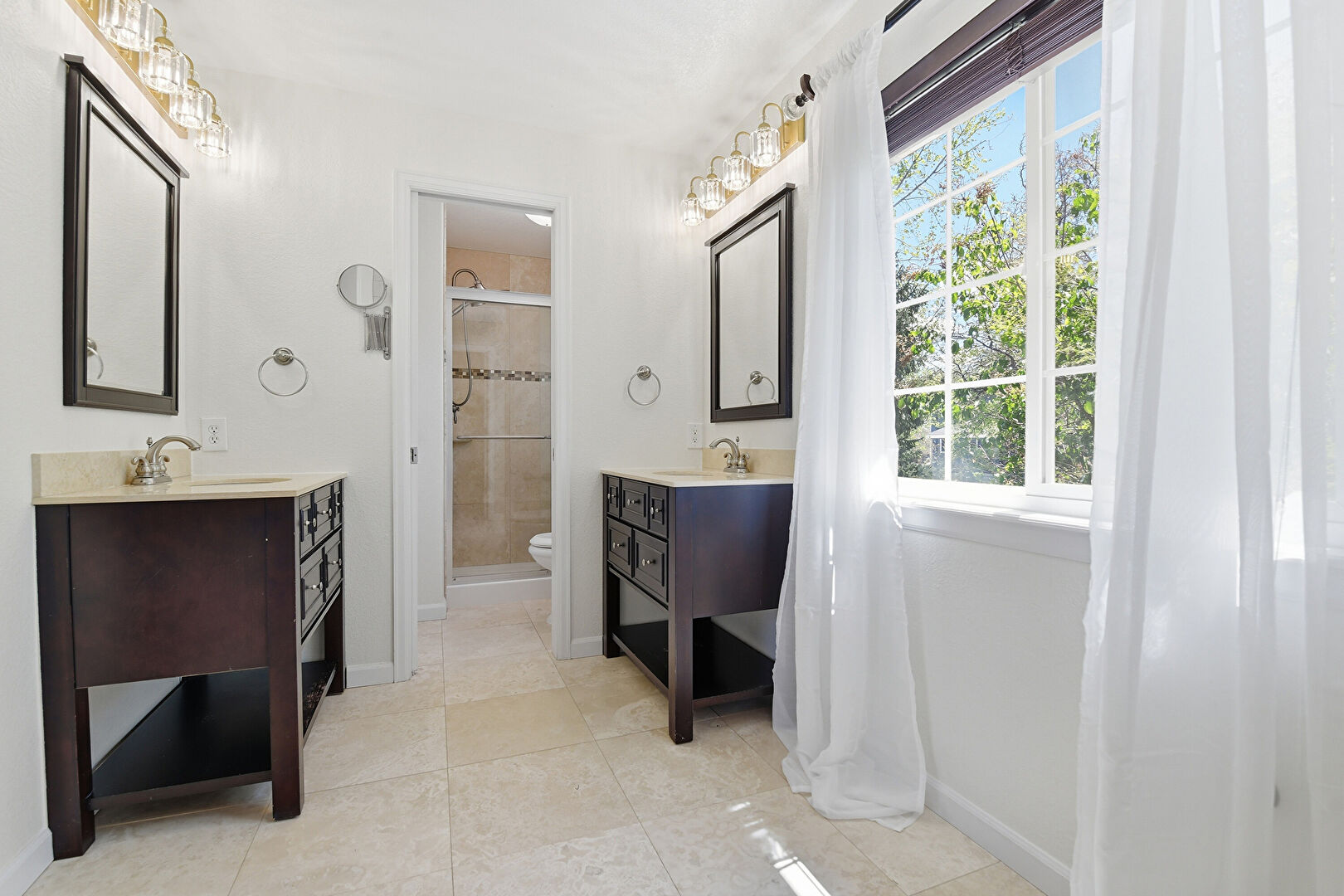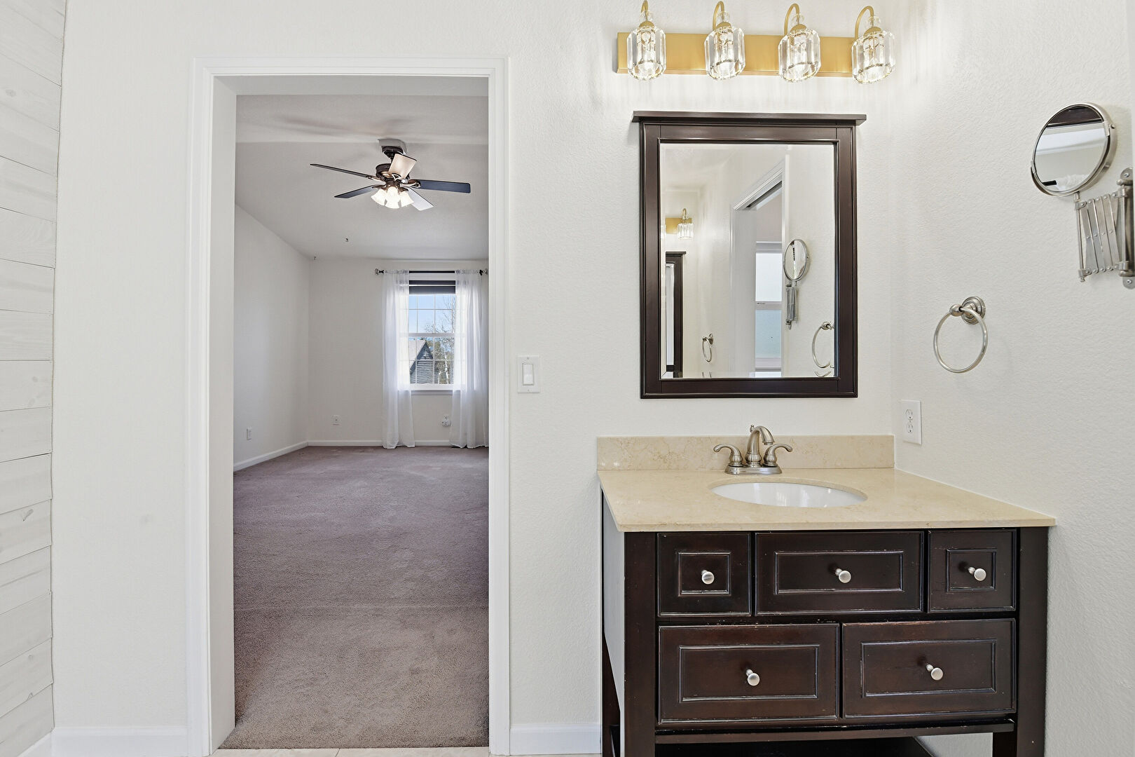 Baseboards Wall, Carpet, Drywall, Full Bathroom, Half Bathroom, Natural Light, Textured Wall, Two Single Vanities, Vanity, Ceiling Fan, Natural Light, Tile Floor