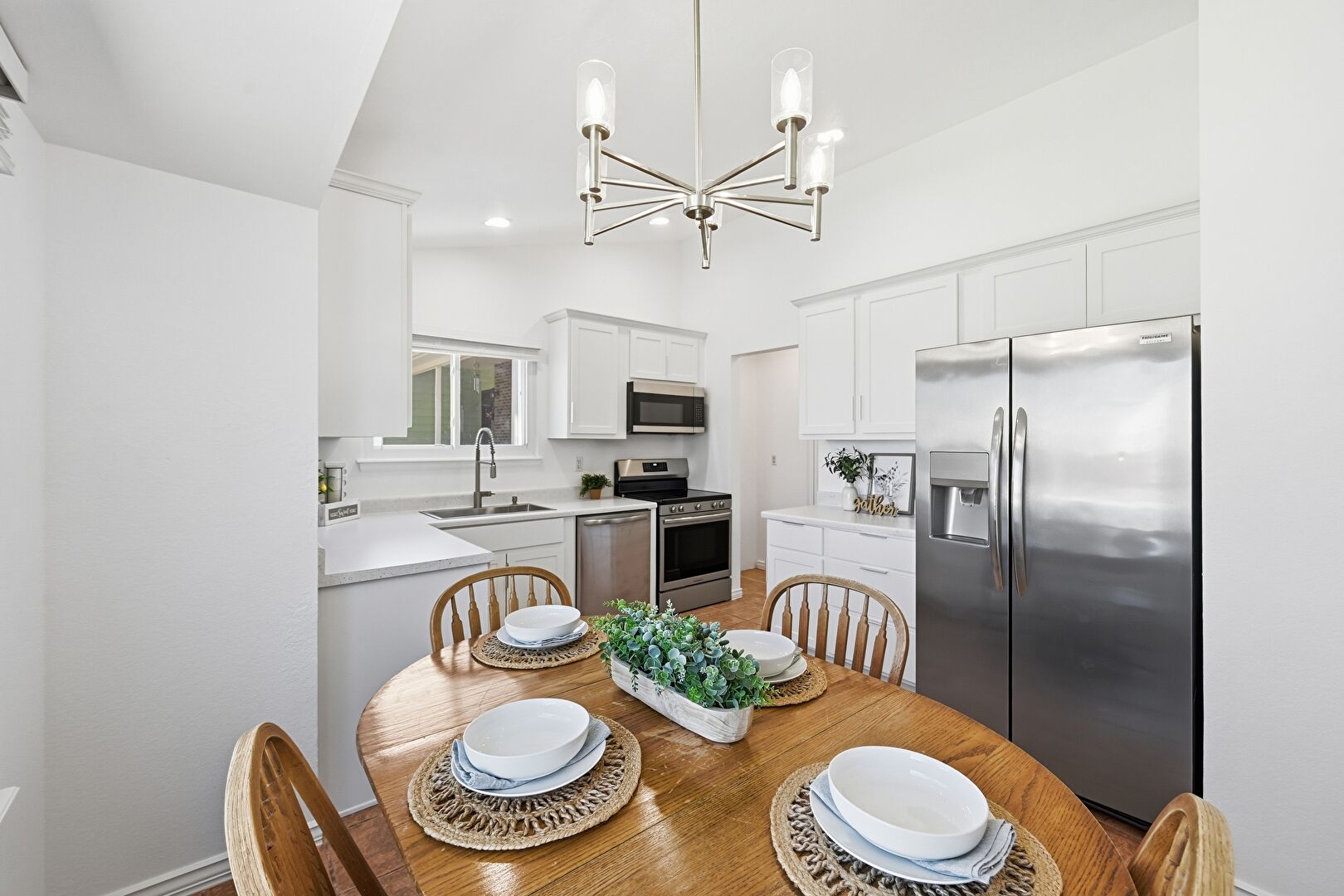 Baseboards Wall, Drywall, Notable Chandelier, Recessed Lighting, U Shaped Kitchen, Vaulted Ceiling, Natural Light
