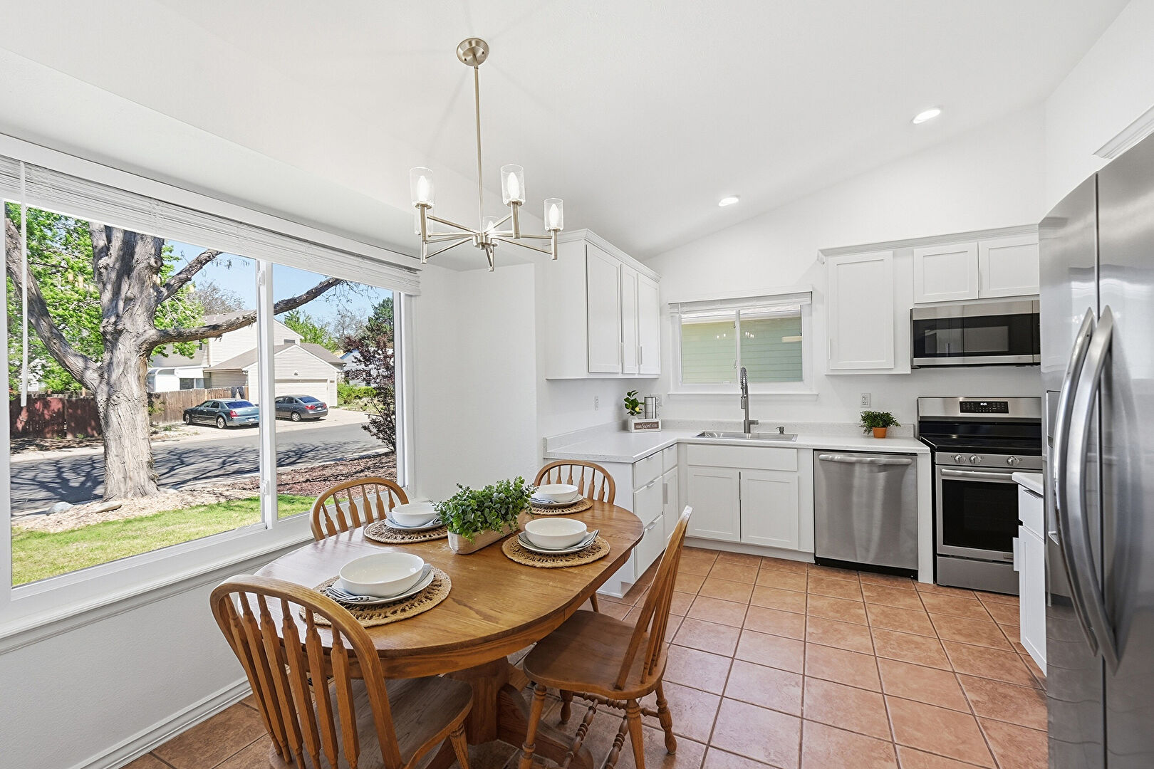 Baseboards Wall, Crown Molding Cabinets, Drywall, High Ceiling, Natural Light, Notable Chandelier, Pendant Lighting, Recessed Lighting, Shaker Cabinets, Tile Floor, Vaulted Ceiling, Crown Molding Cabinets, Vaulted Ceiling