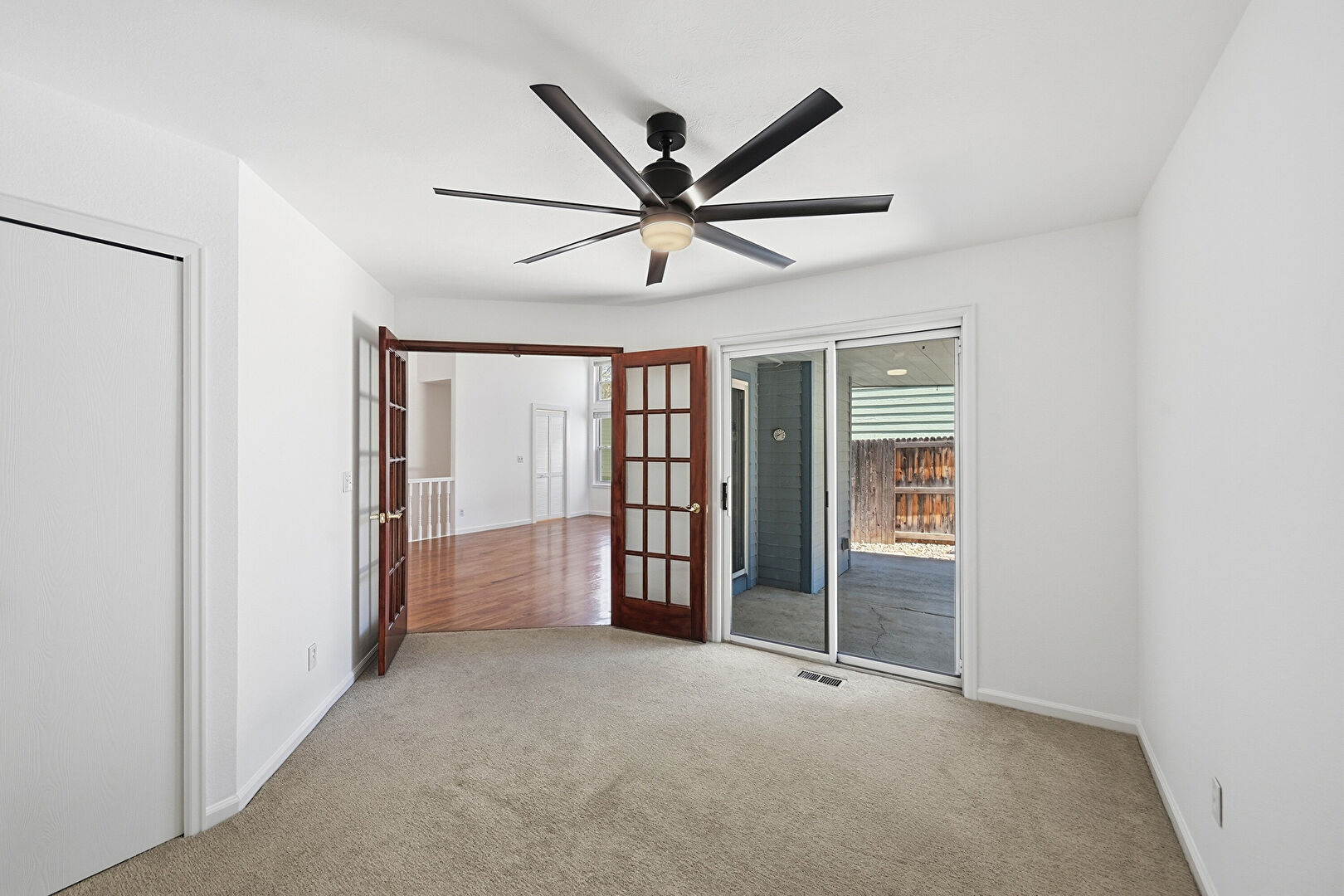 Carpet, Ceiling Fan, Drywall, French Doors, Natural Light, Vent, Baseboards Wall