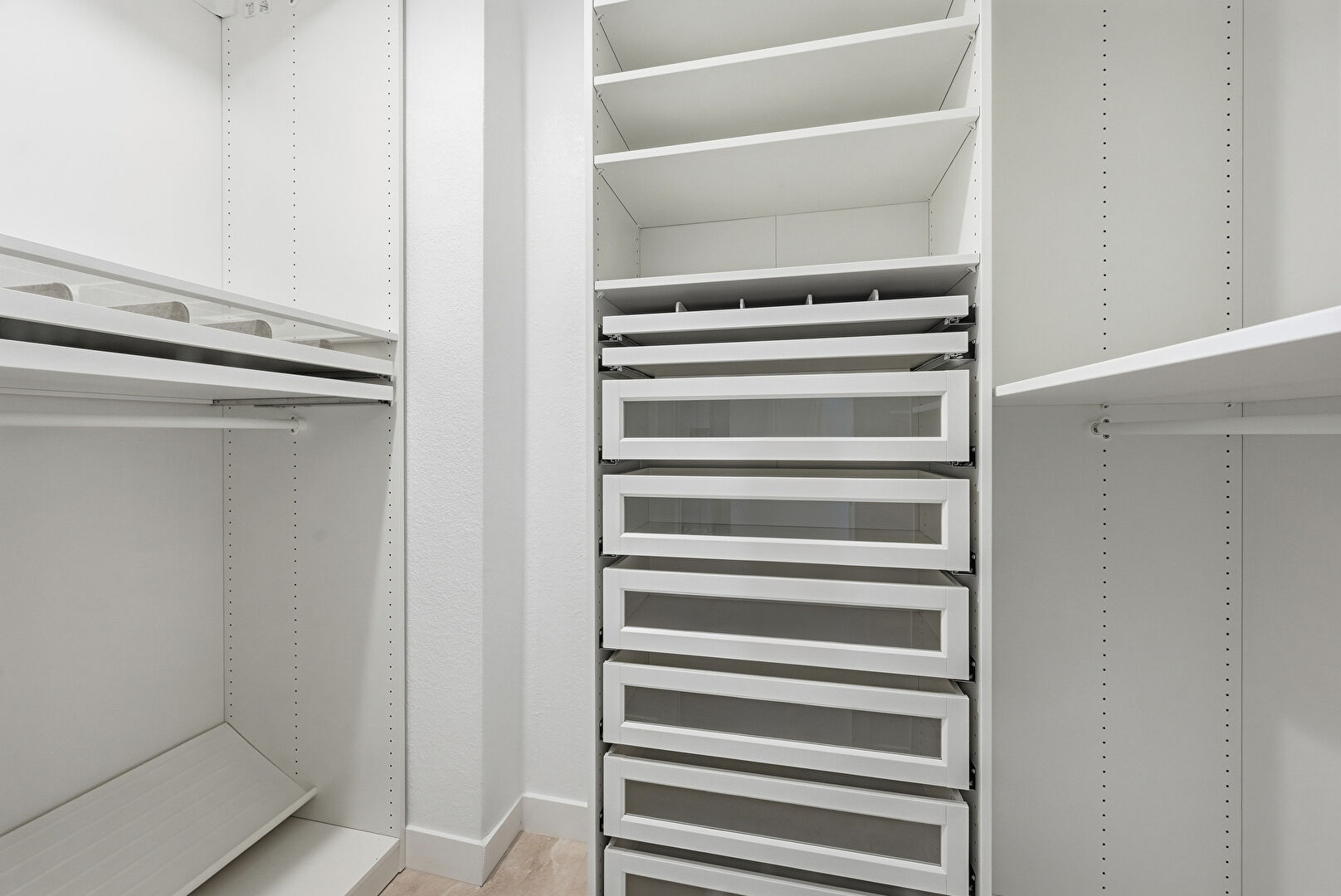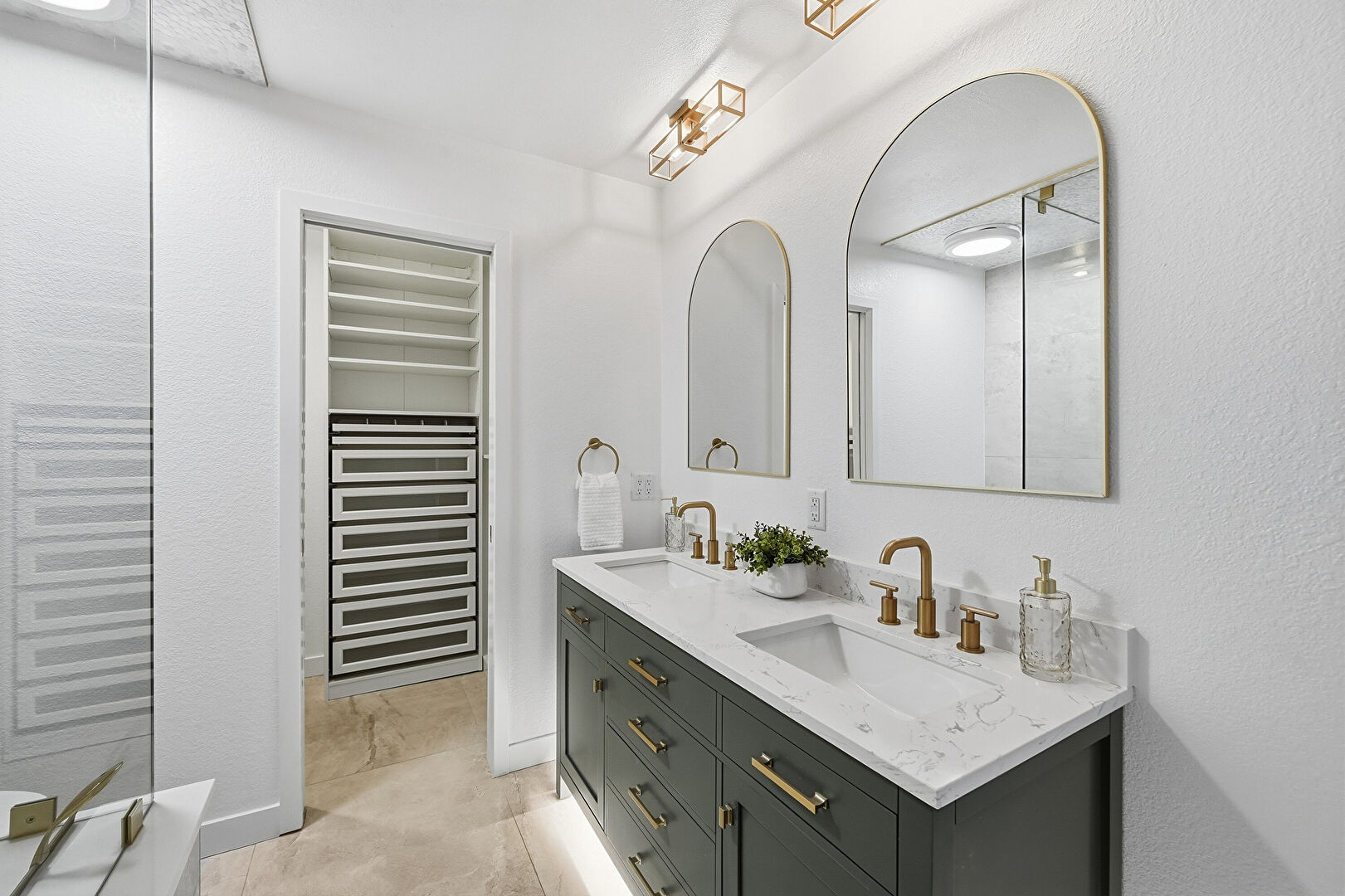 Baseboards Wall, Double Vanity, Drywall, Full Bathroom, Textured Wall, Tile Floor, Walk In Closet, Baseboards Wall, Full Bathroom, Radiator