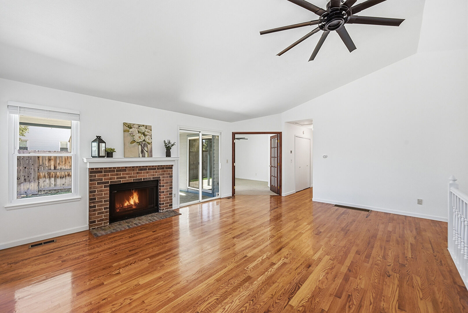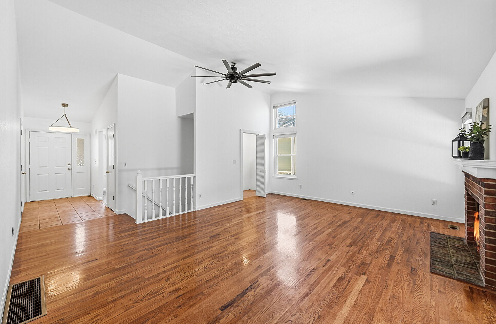 Baseboards Wall, Ceiling Fan, Drywall, Fireplace, High Ceiling, Natural Light, Vaulted Ceiling, Vent, Wood Finish Floor, Natural Light, Vaulted Ceiling