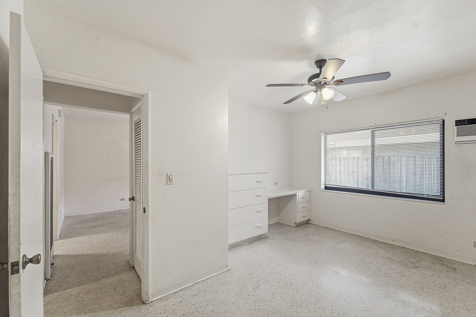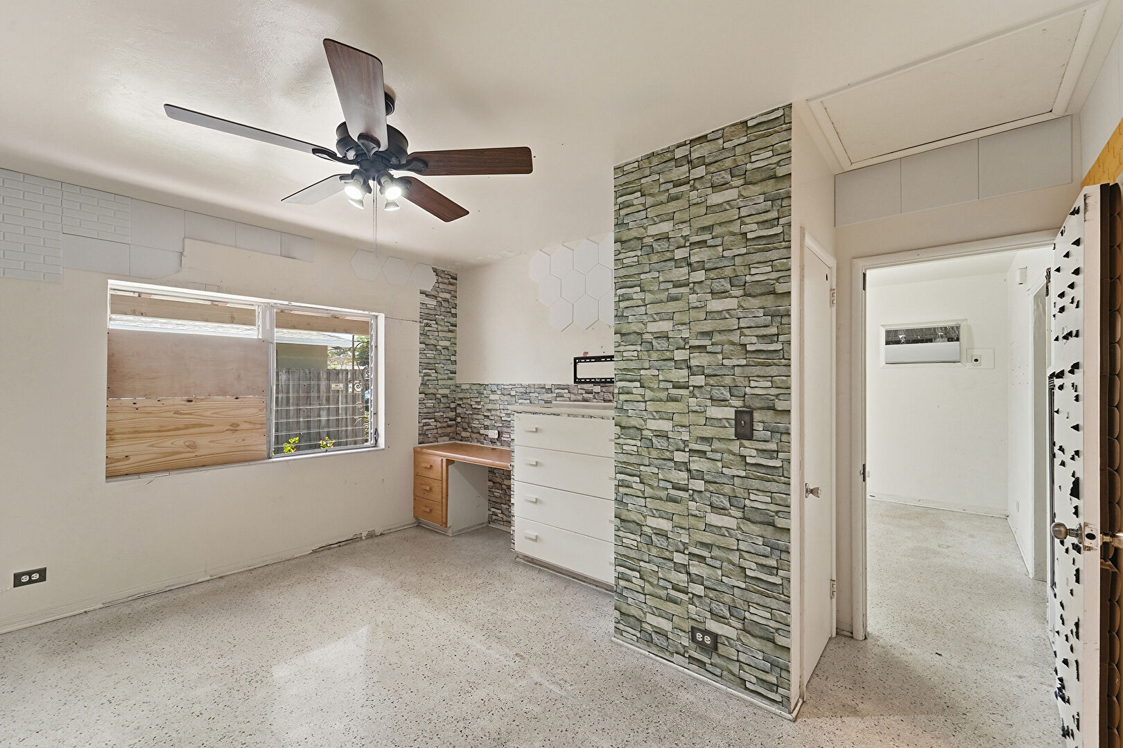 Aggregate Floor, Baseboards Wall, Built In Desk, Ceiling Fan, Drywall, Ensuite Bathroom, Natural Light, Office Area, Stone Wall, Wall Mounted Ac, Ceiling Fan, Drywall, Natural Light