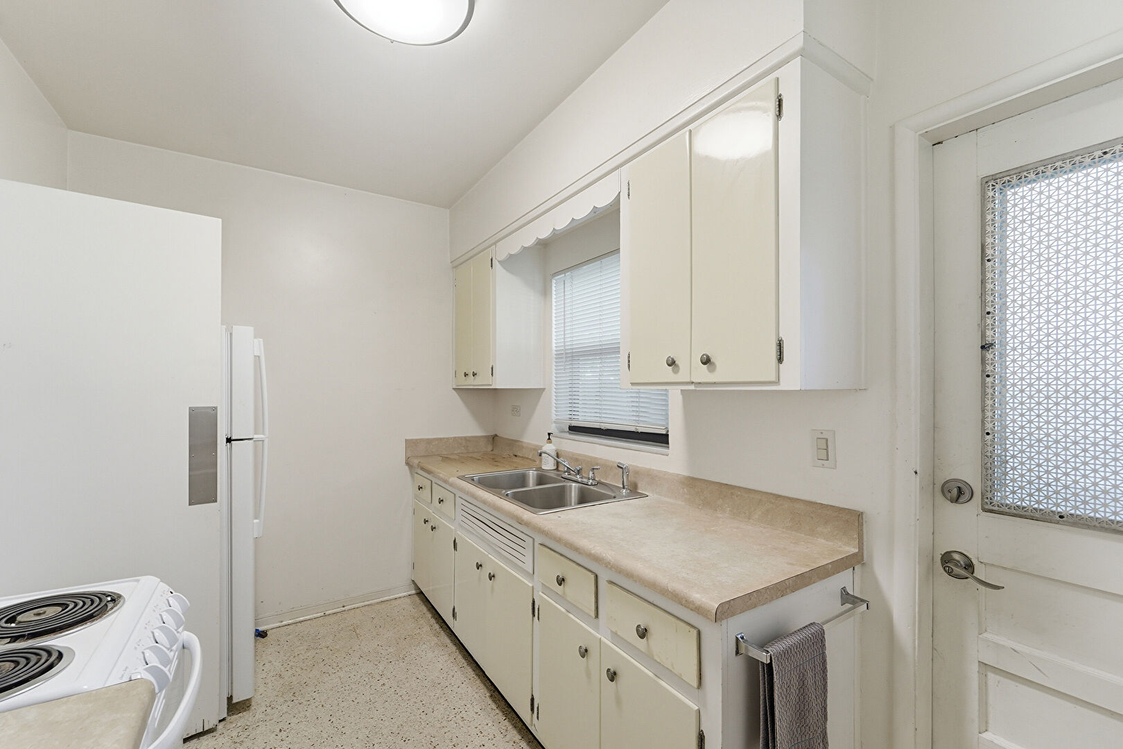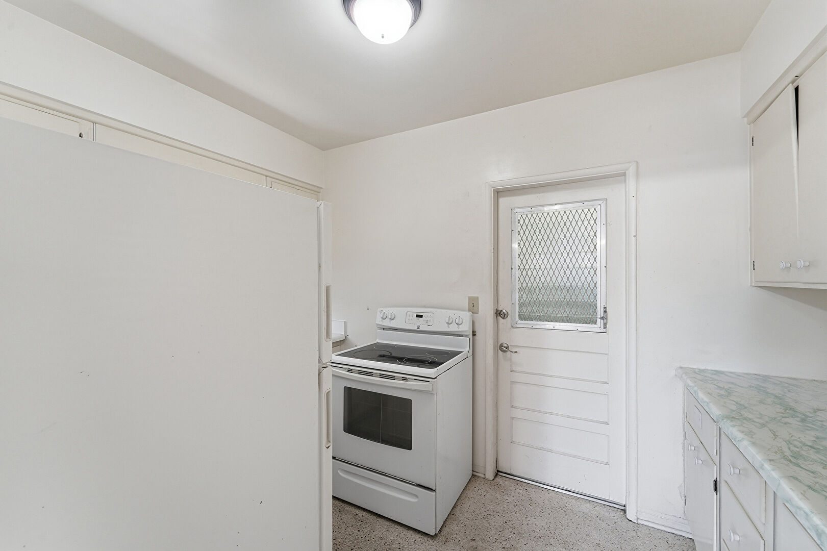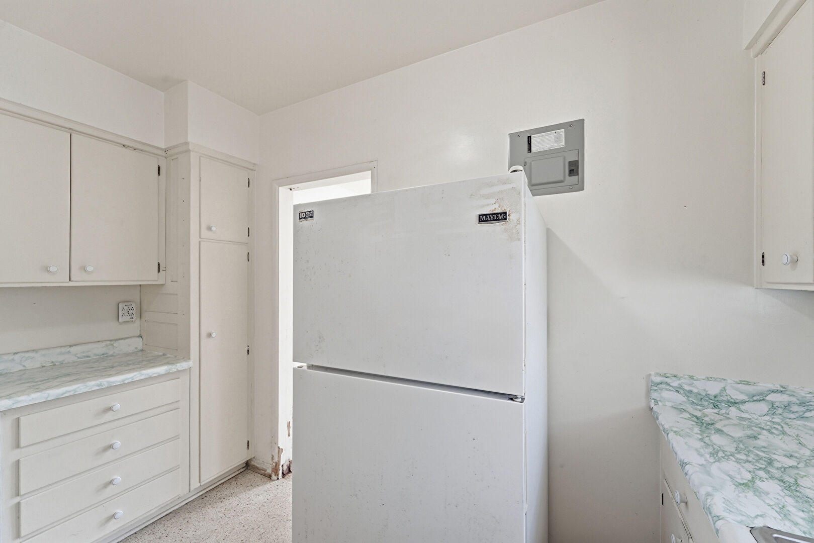 Aggregate Floor, Baseboards Wall, Ceiling Fan, Cream Cabinets, Drywall, Electric Panel, Natural Light, Stone Countertops, Visible Hinge Cabinets, Aggregate Floor, Drywall, Natural Light, Vent, Visible Hinge Cabinets