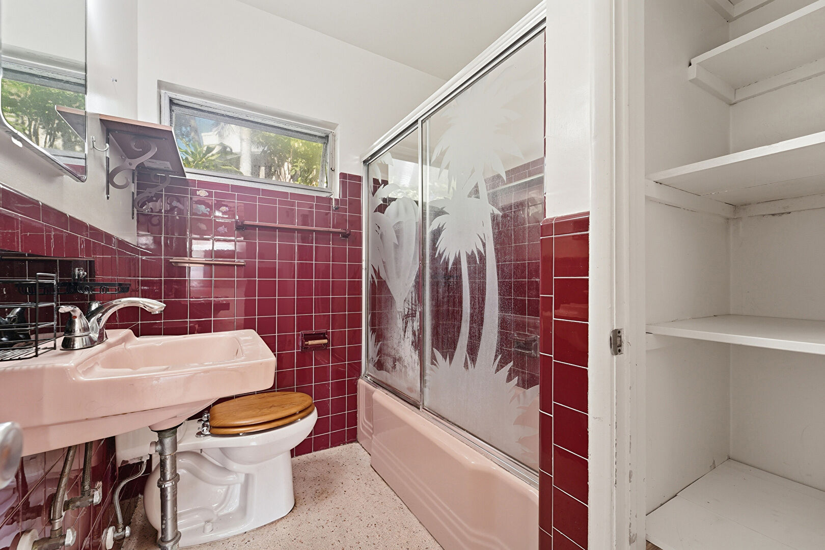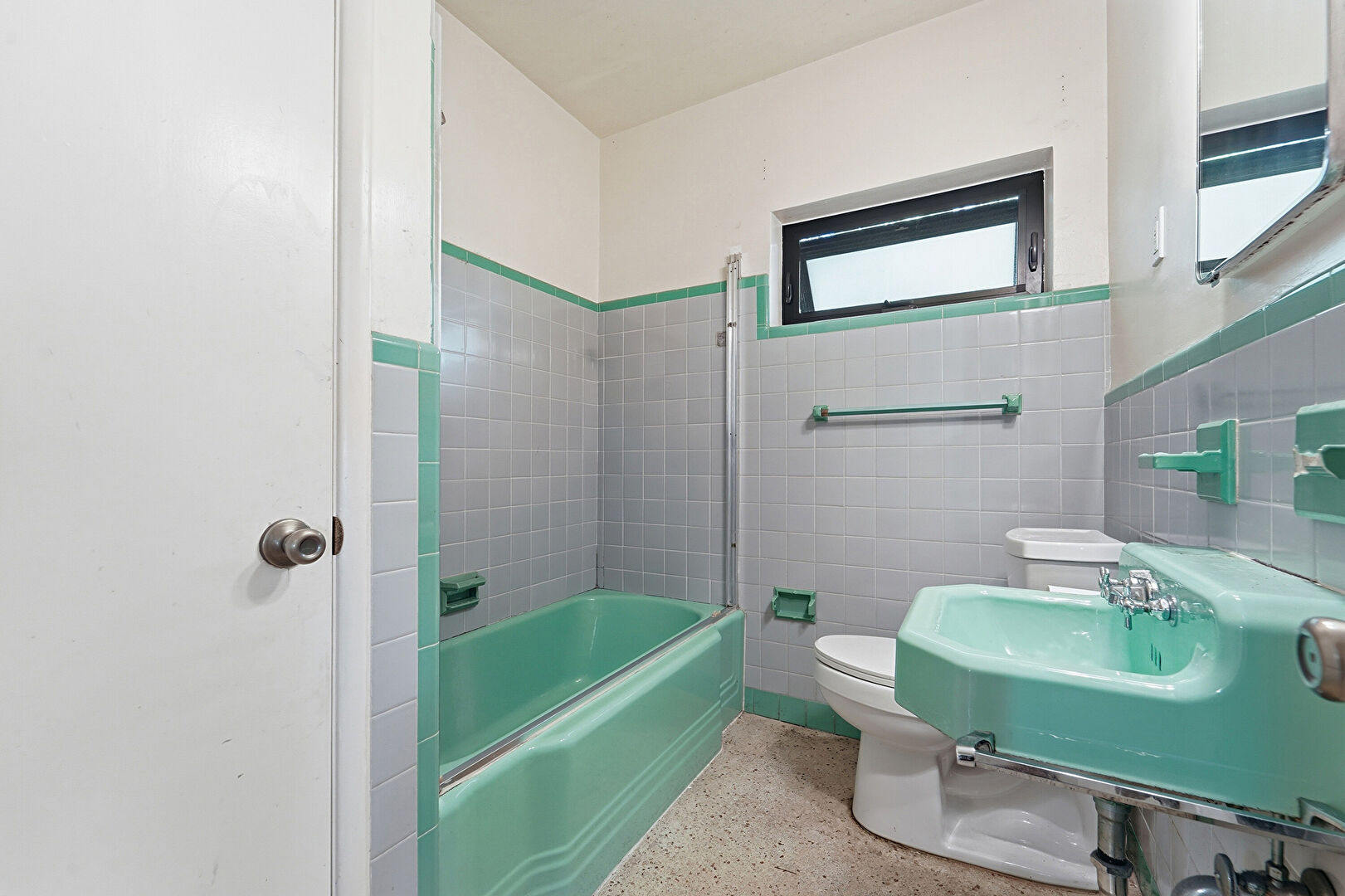 Aggregate Floor, Combined Bath Shower, Drywall, Full Bathroom, Natural Light, Tile Wall, Wainscot Wall, Aggregate Floor, Walk In Closet