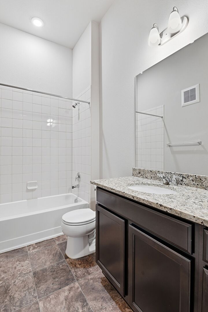 Combined Bath Shower, Drywall, Full Bathroom, Recessed Lighting, Stone Finish Floor, Vanity, Vent, Combined Bath Shower, Vanity