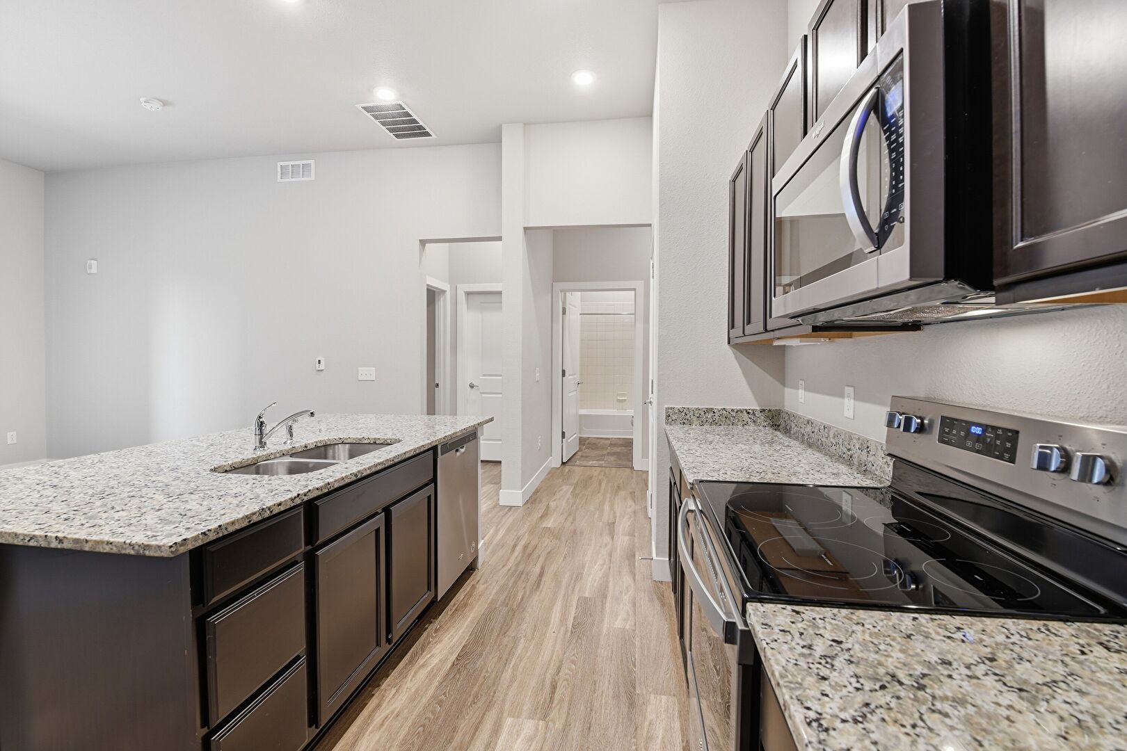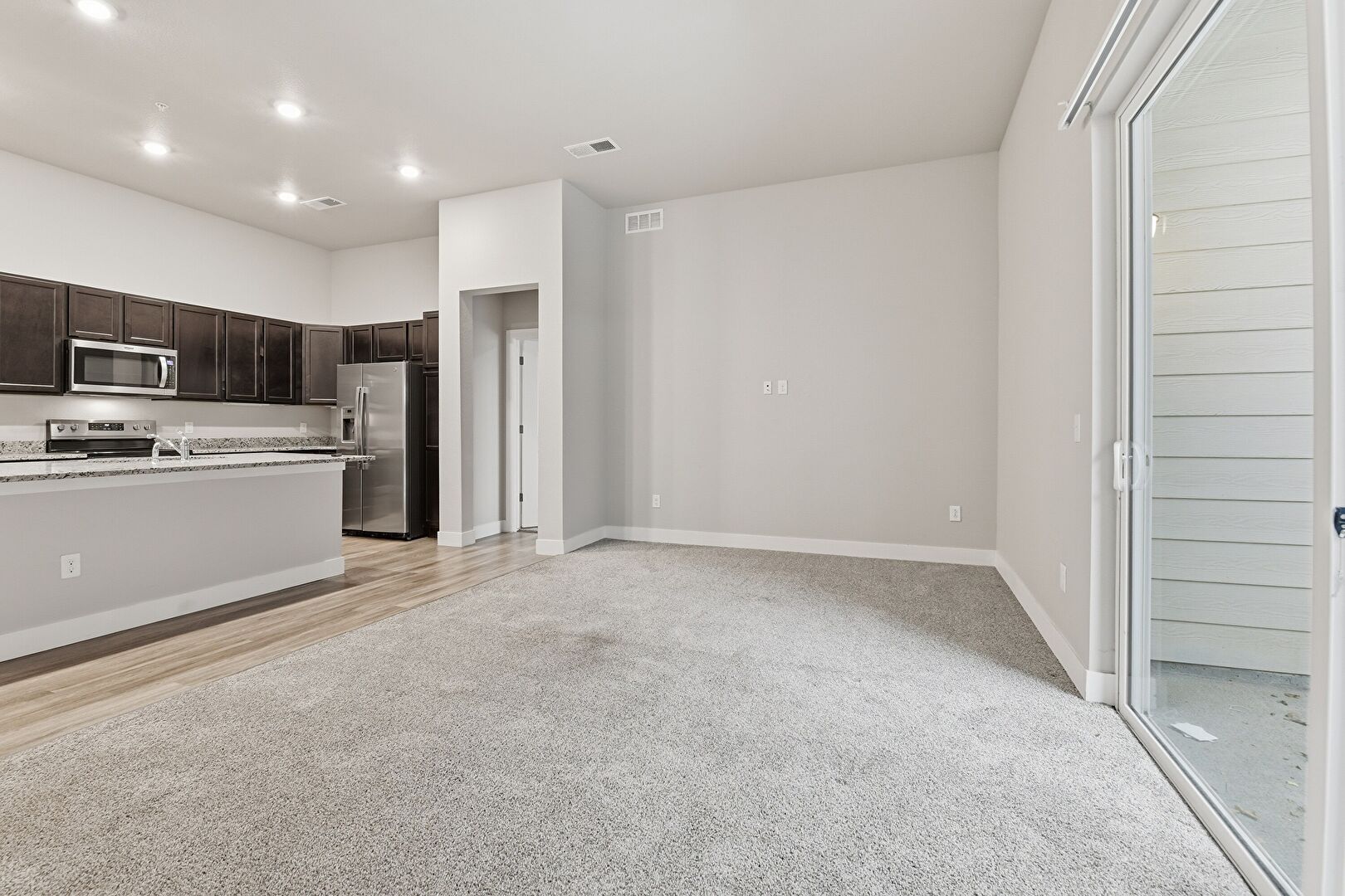 Baseboards Wall, Carpet, Dark Brown Cabinets, Drywall, Natural Light, Opens To Living Area, Recessed Lighting, Shaker Cabinets, Stone Countertops, Vent, Wood Finish Floor, Baseboards Wall, Wood Finish Floor