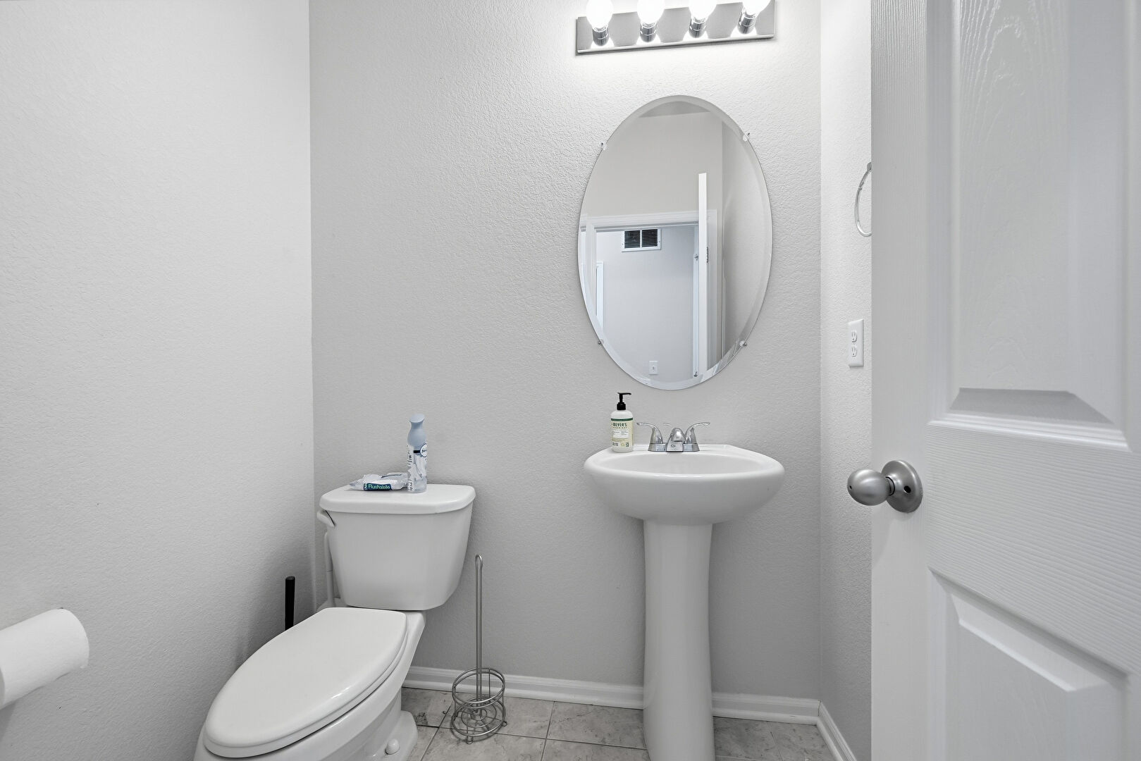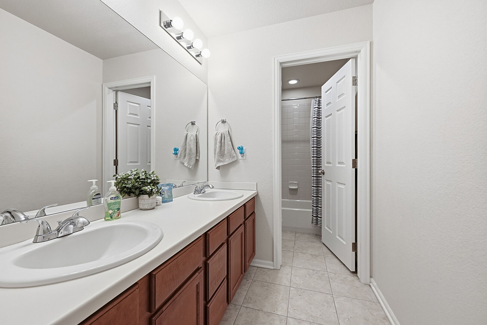 Baseboards Wall, Combined Bath Shower, Drywall, Full Bathroom, Half Bathroom, Textured Ceiling, Textured Wall, Tile Floor, Vanity, Baseboards Wall, Double Vanity, Vent