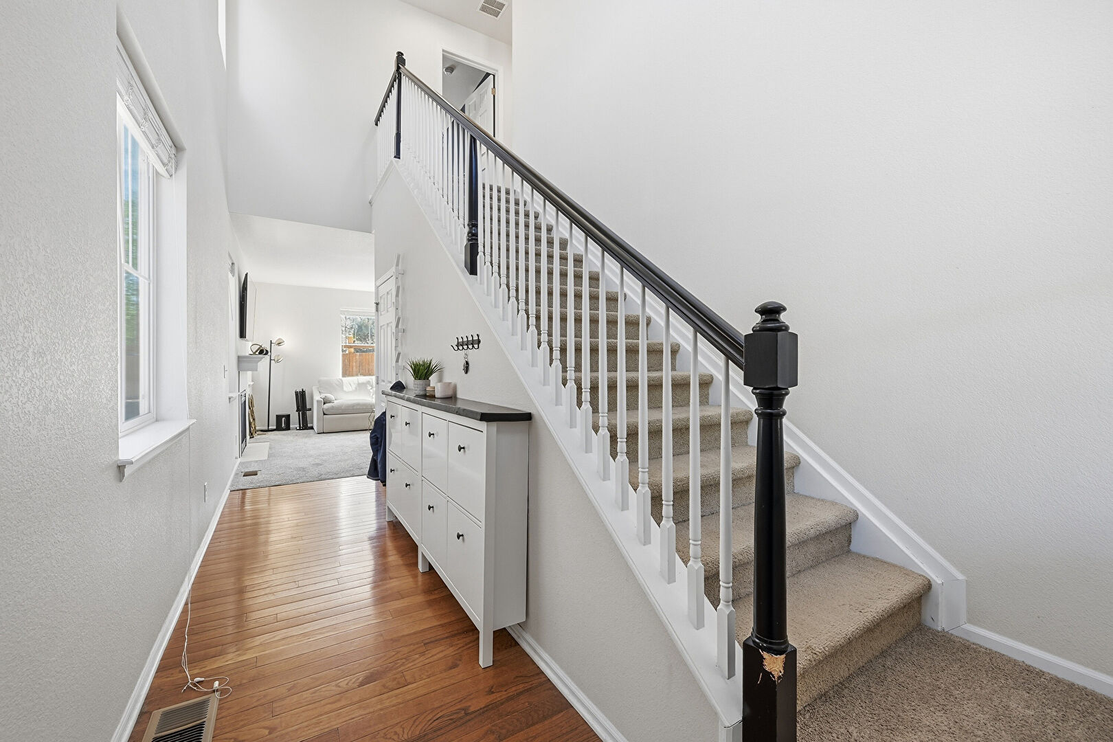 Baseboards Wall, Carpet, High Ceiling, Natural Light, Stairs, Textured Wall, Vent, Wood Finish Floor