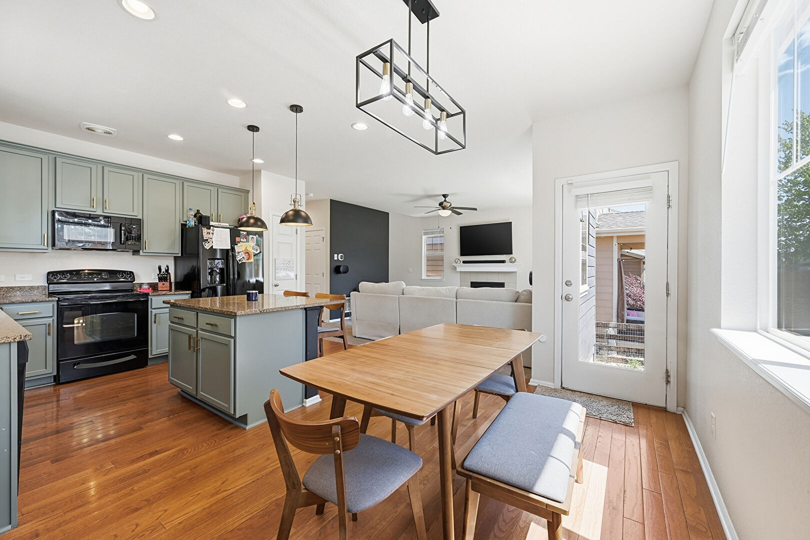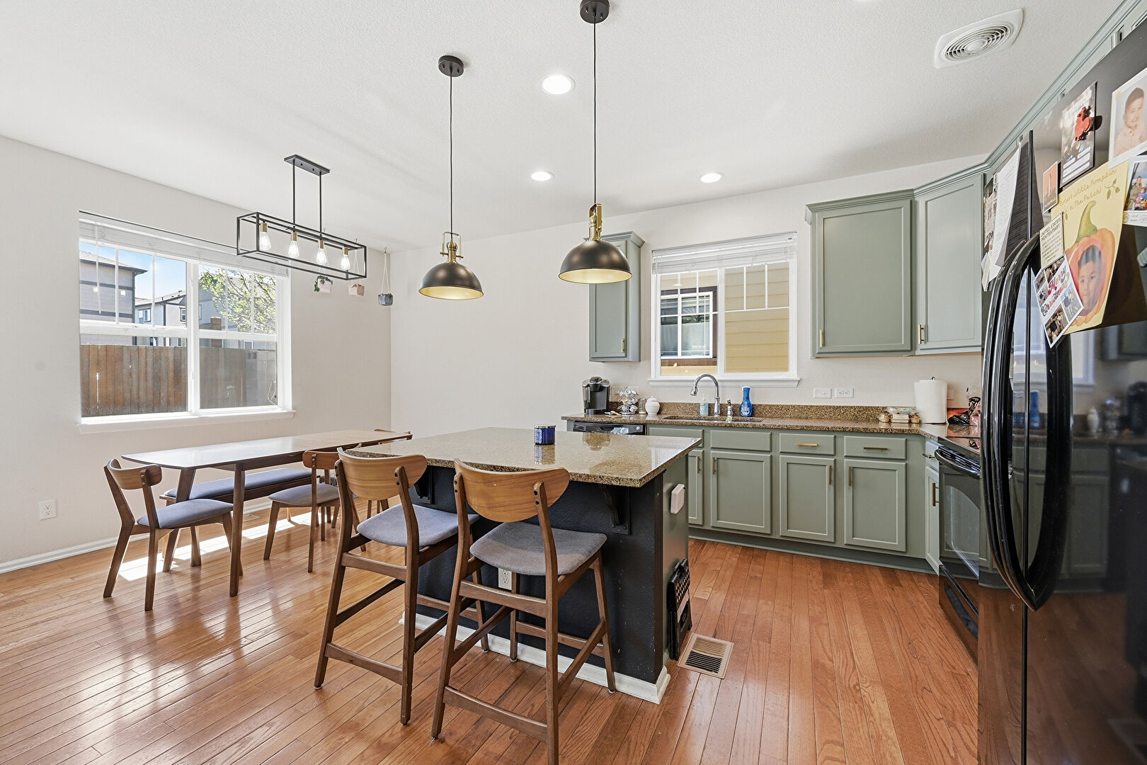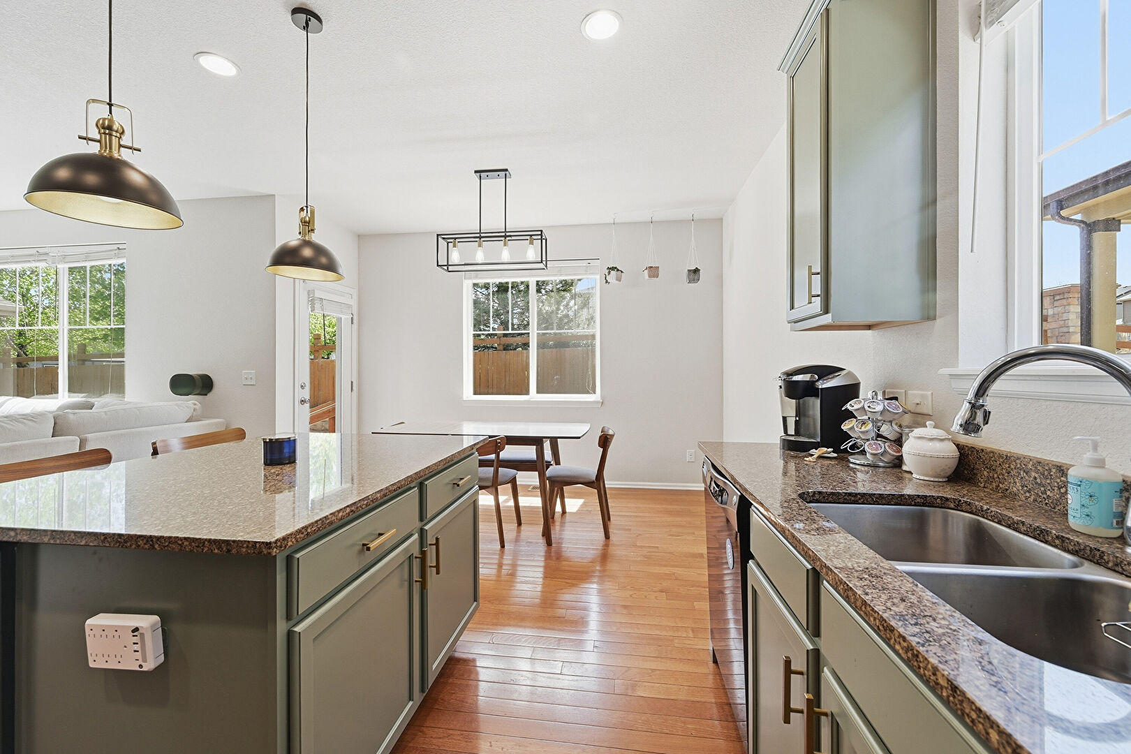 Baseboards Wall, Crown Molding Cabinets, Drywall, Gray Cabinets, Green Cabinets, Kitchen Bar, Kitchen Island, L Shaped Kitchen, Natural Light, Opens To Living Area, Pendant Lighting, Recessed Lighting, Shaker Cabinets, Stone Countertops, Vent, Wood Finish Floor, Gray Cabinets, Green Cabinets, Pendant Lighting