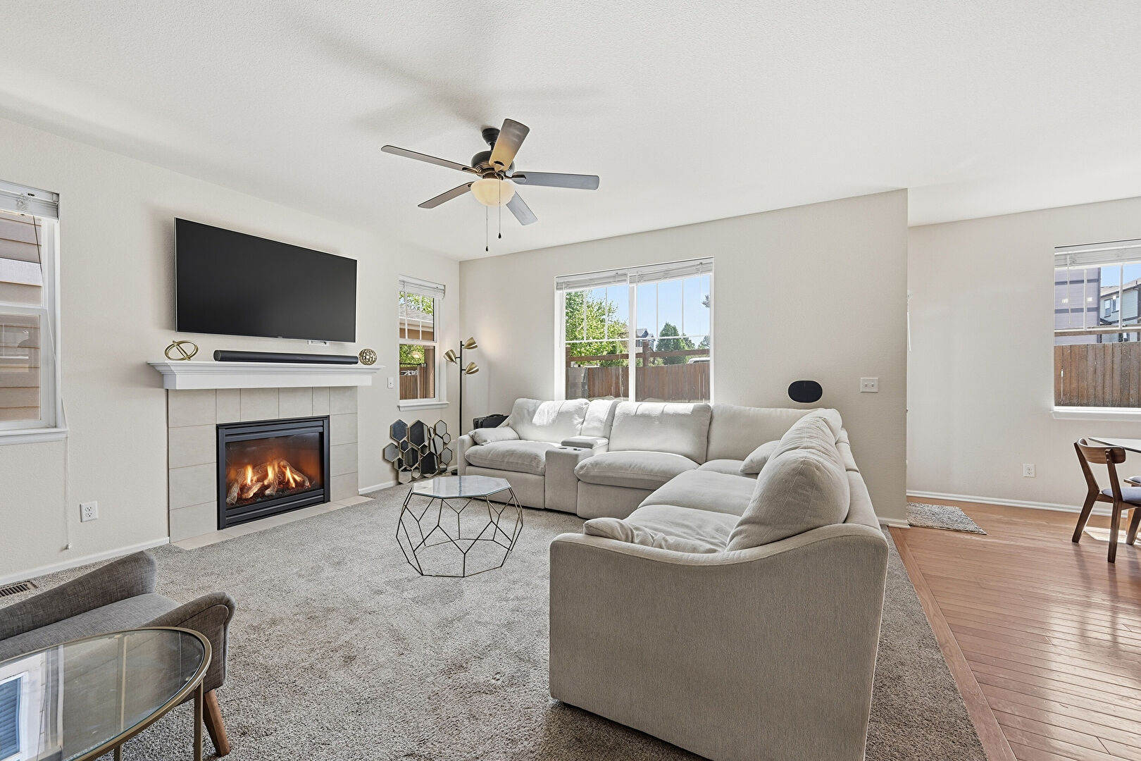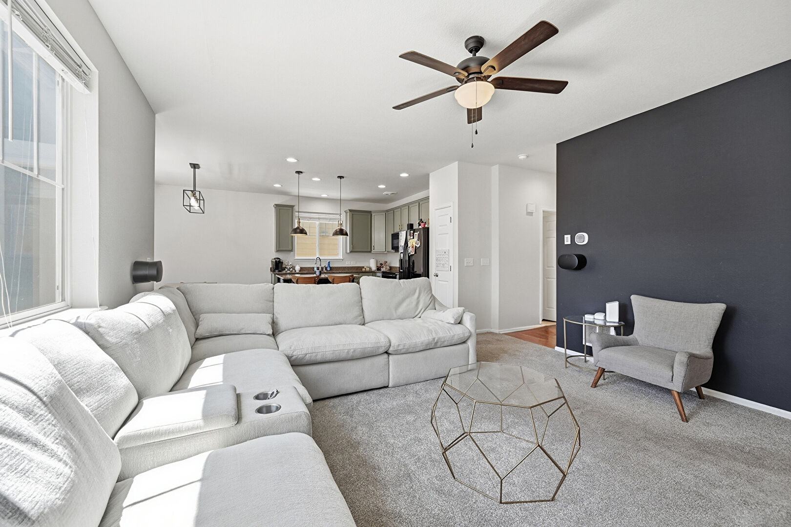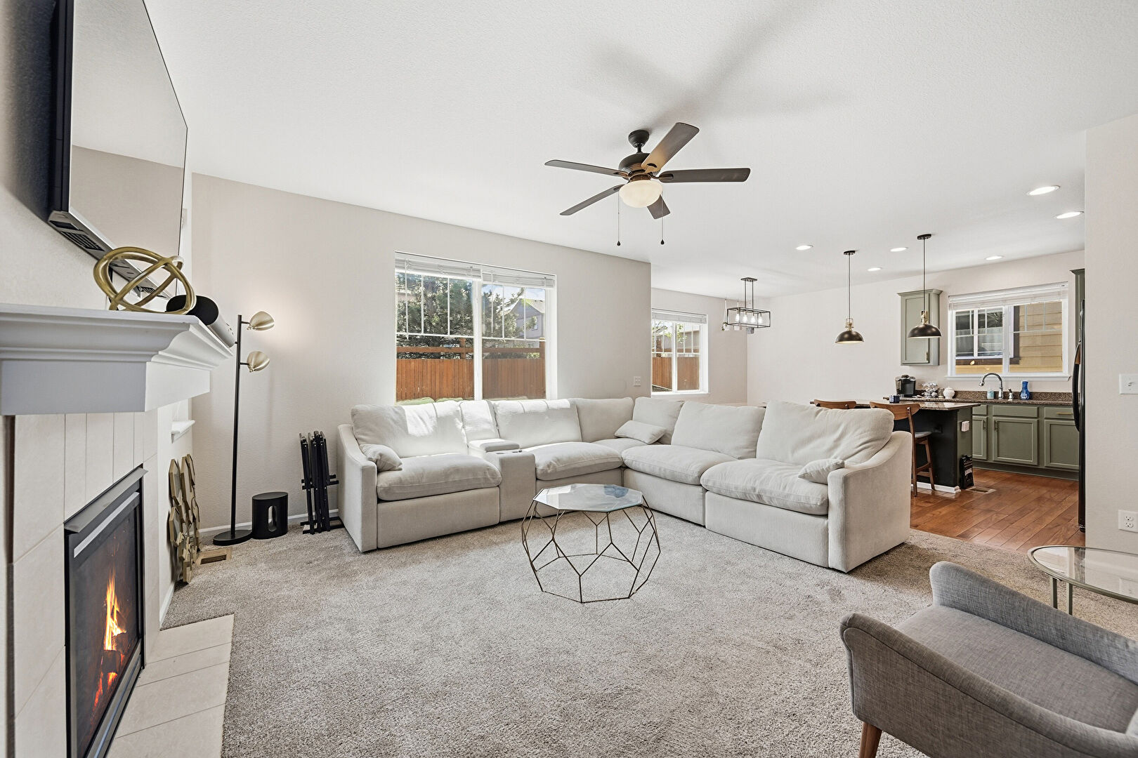 Baseboards Wall, Carpet, Ceiling Fan, Drywall, Fireplace, L Shaped Kitchen, Natural Light, Notable Chandelier, Recessed Lighting, Vent, Wood Finish Floor, Baseboards Wall, Drywall, Fireplace