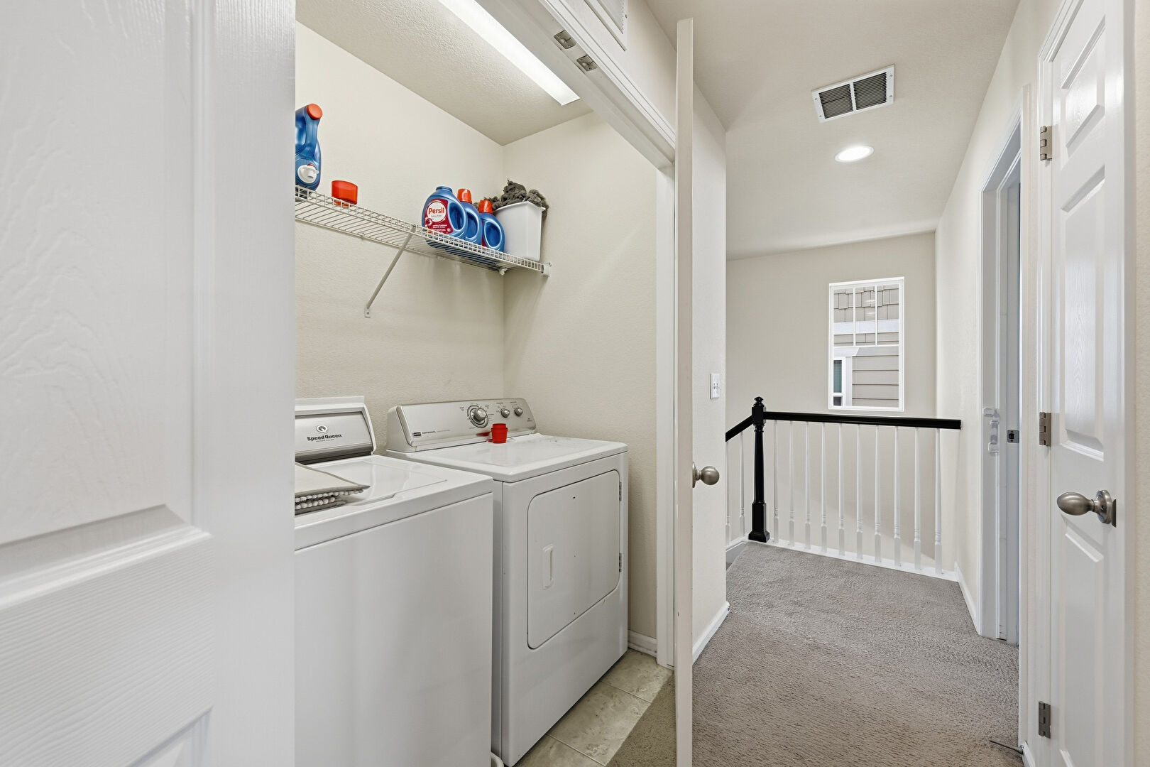 Baseboards Wall, Drywall, Laundry, Natural Light, Recessed Lighting, Tile Floor, Vent, Carpet