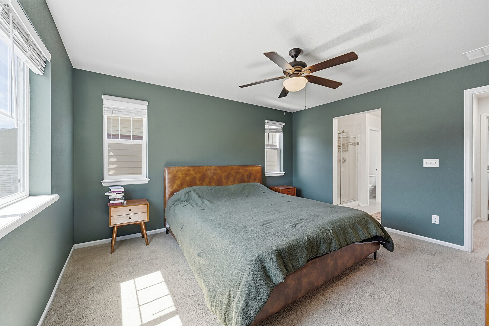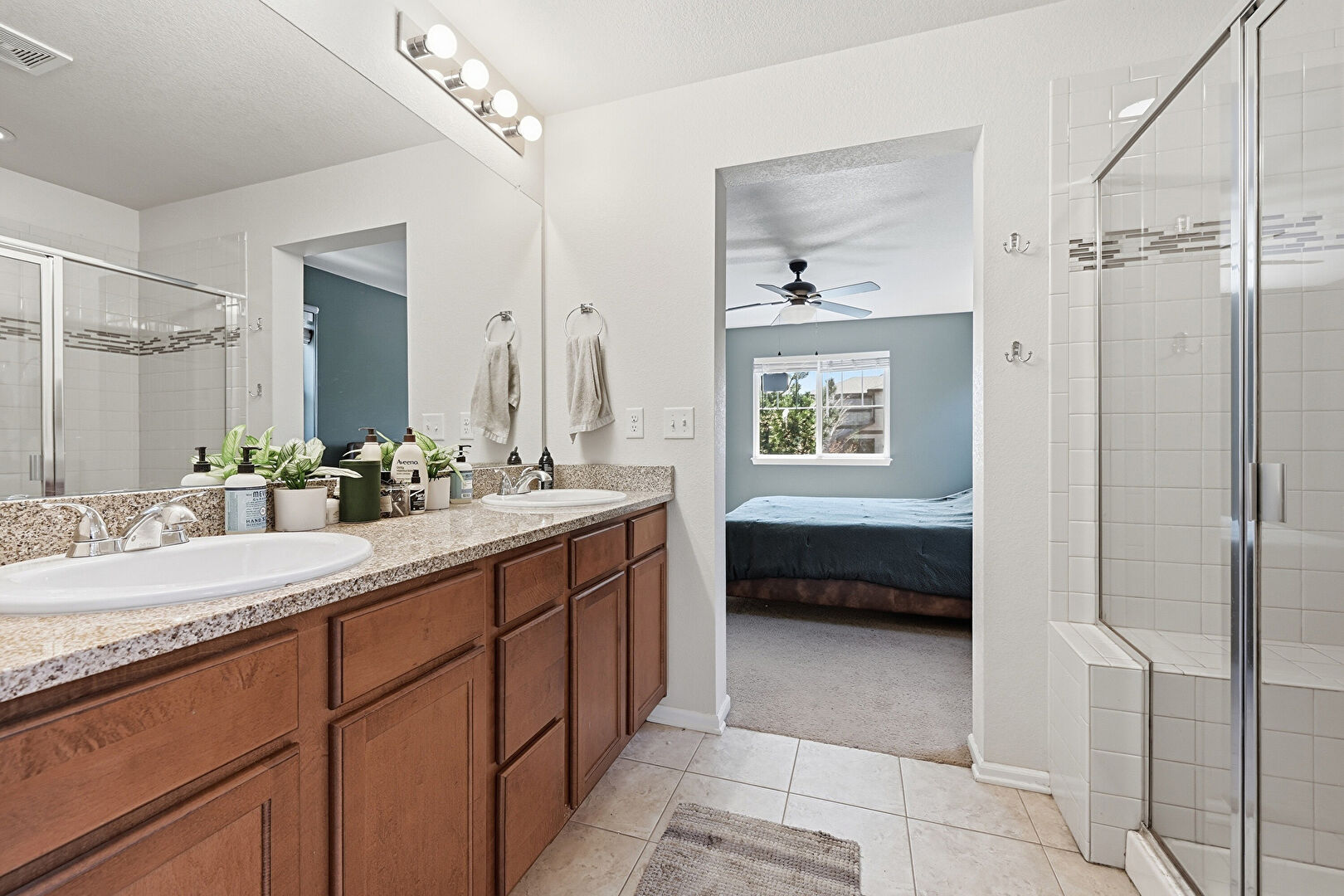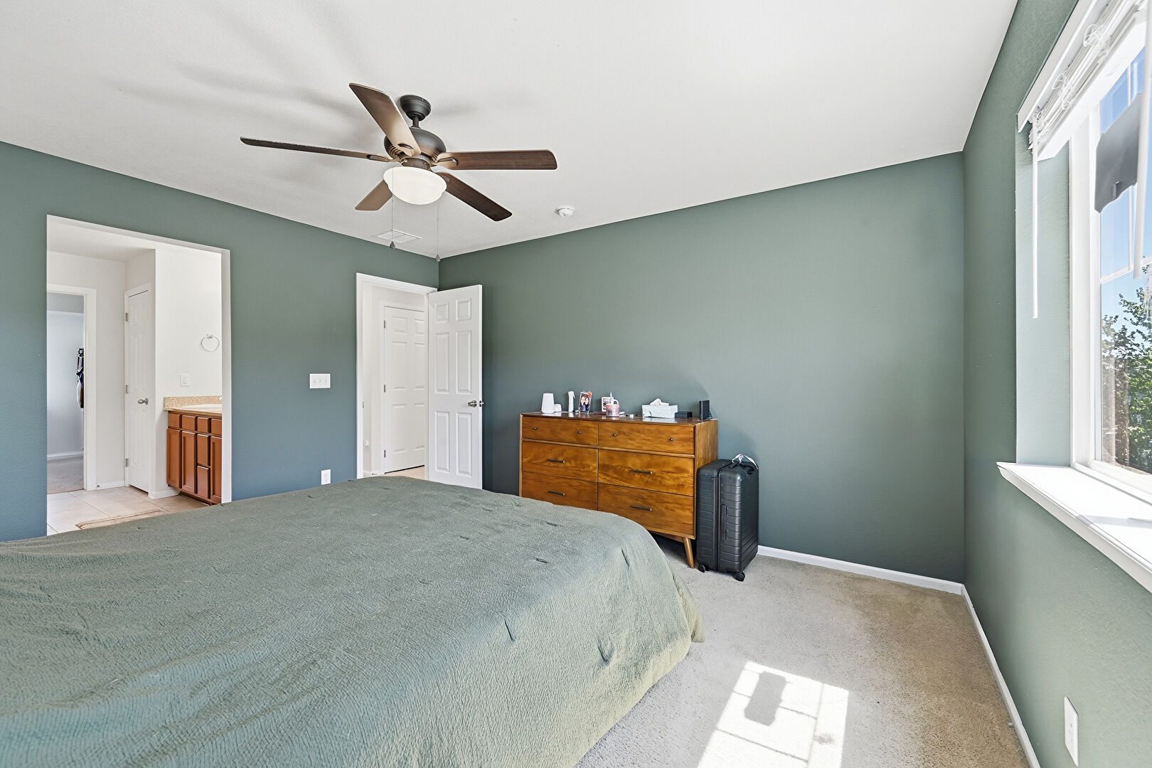 Baseboards Wall, Carpet, Double Vanity, Drywall, Ensuite Bathroom, Full Bathroom, Natural Light, Textured Ceiling, Tile Floor, Vent, Ceiling Fan, Natural Light